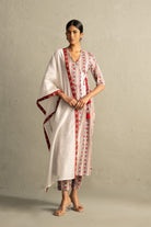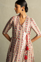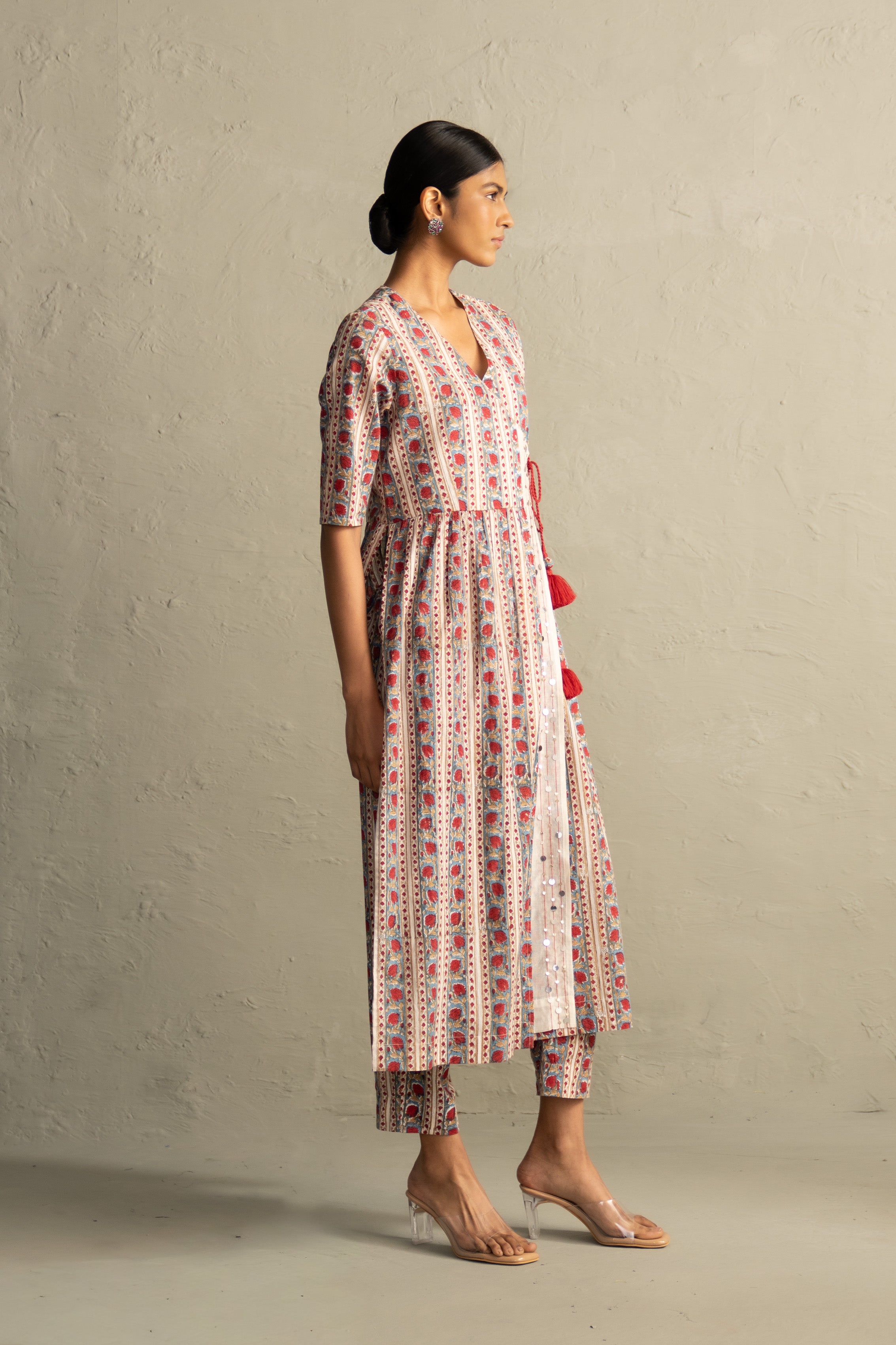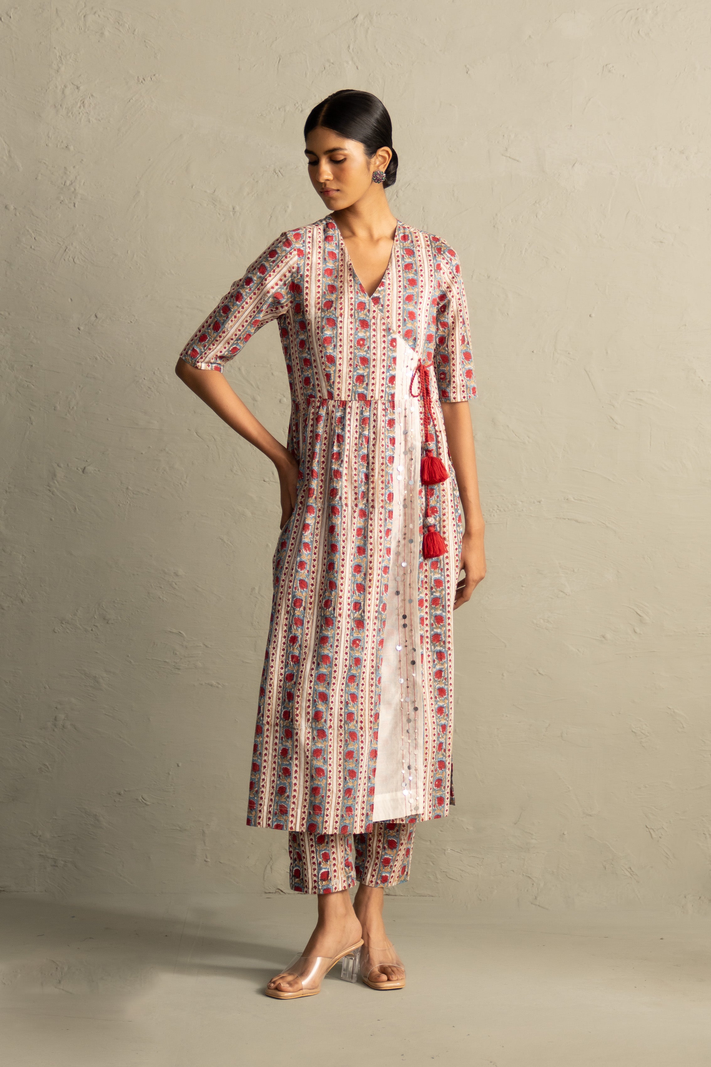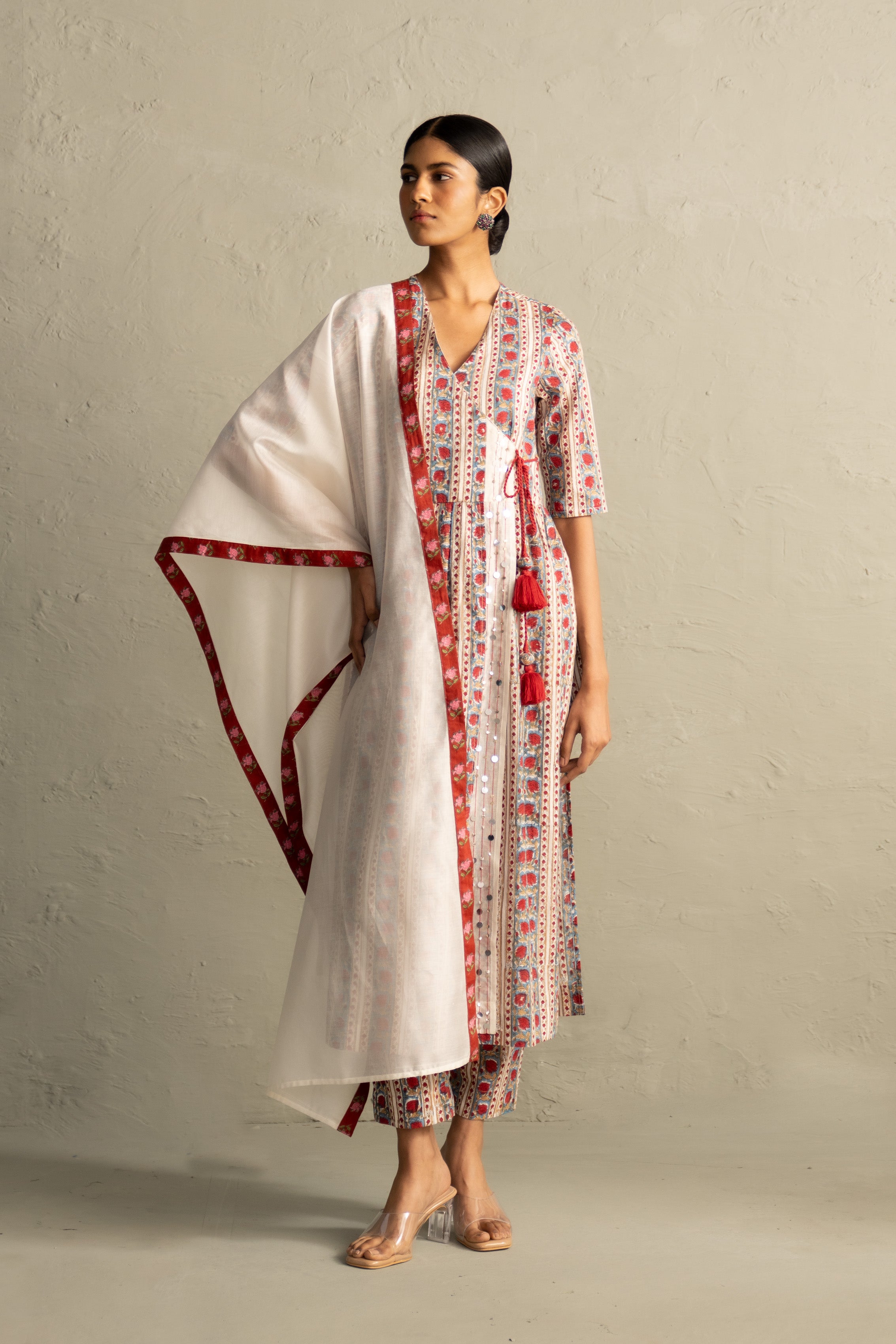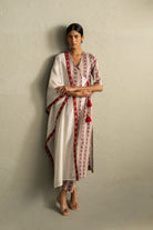 A refined take on summer dressing, this cream and red Angrakha straight kurta set is crafted in hand block printed breathable cotton. The kurta features a flattering Angrakha stitched silhouette with a separate chanderi front panel highlighted by subtle sequin work and striking red tassles on the side waist. Paired with coordinated printed bottoms, the set is completed with a lightweight Chanderi dupatta finished with contrasting borders. Easy, elegant, and perfect for warm days.