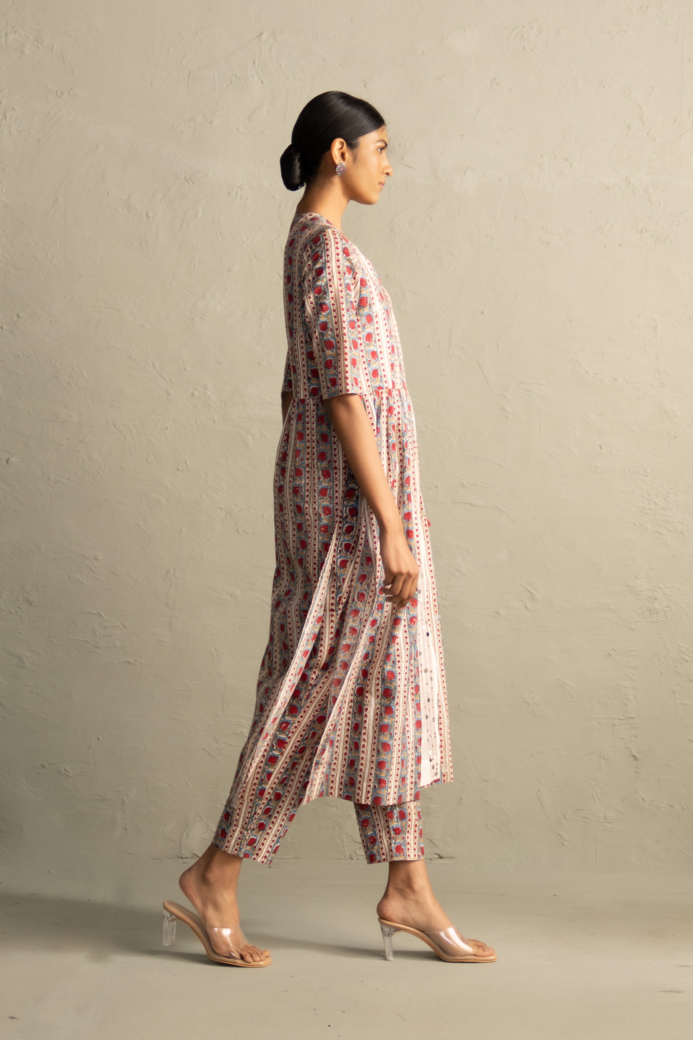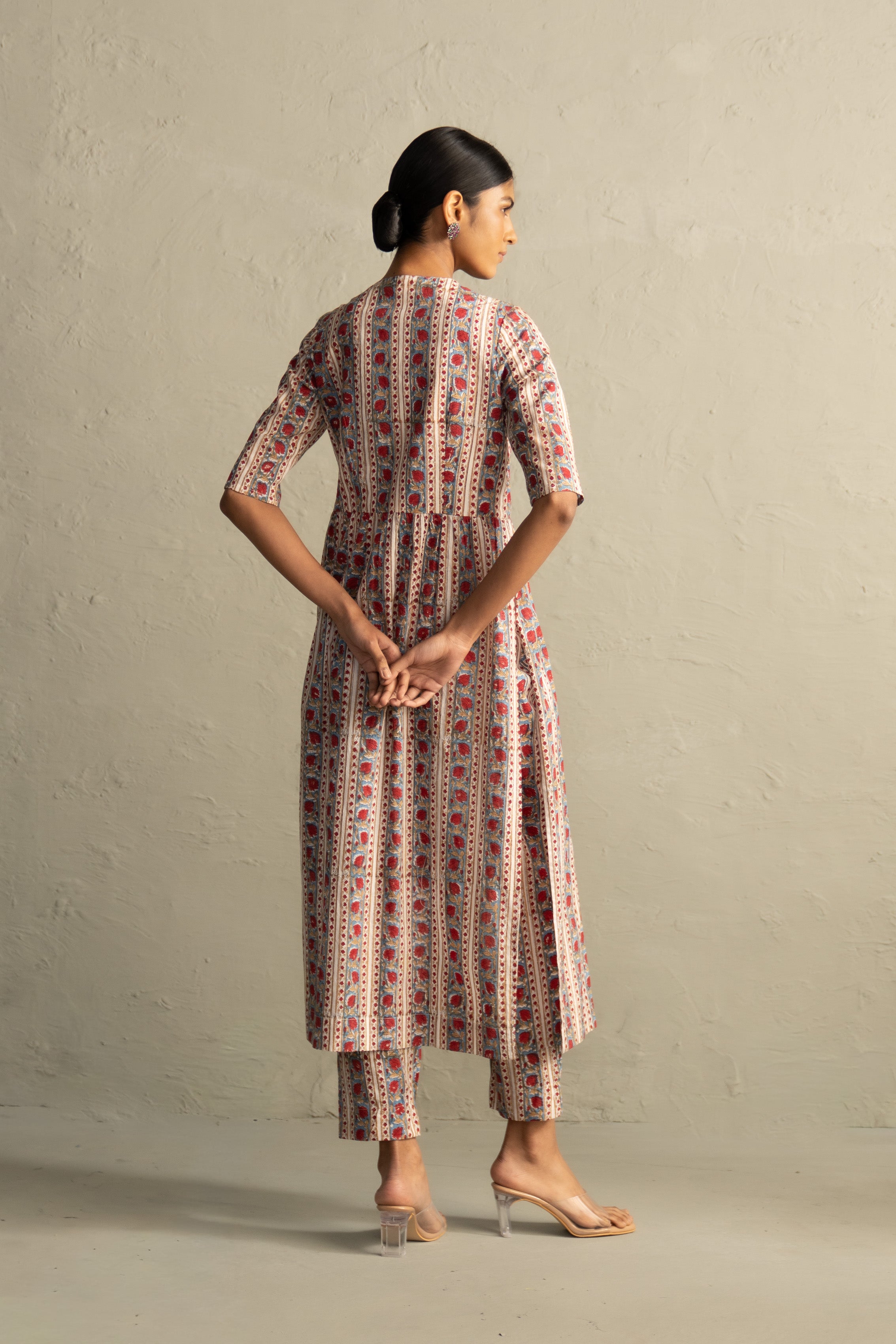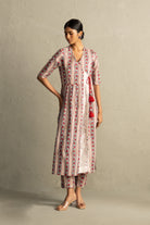 Cream Phool Dori Hand Block Angrakha Straight Kurta Set