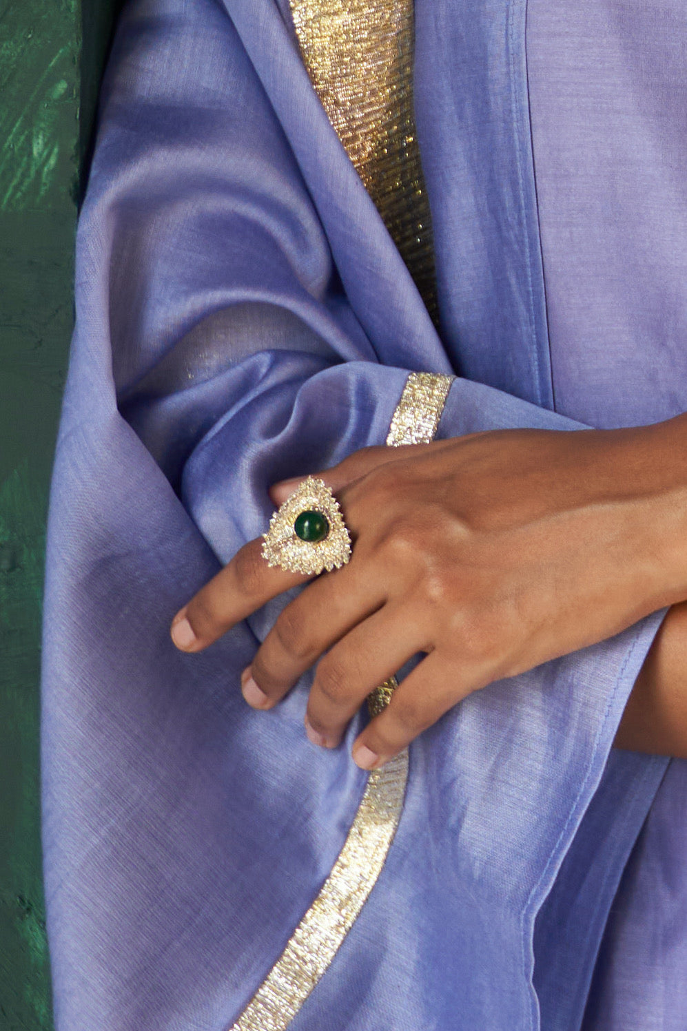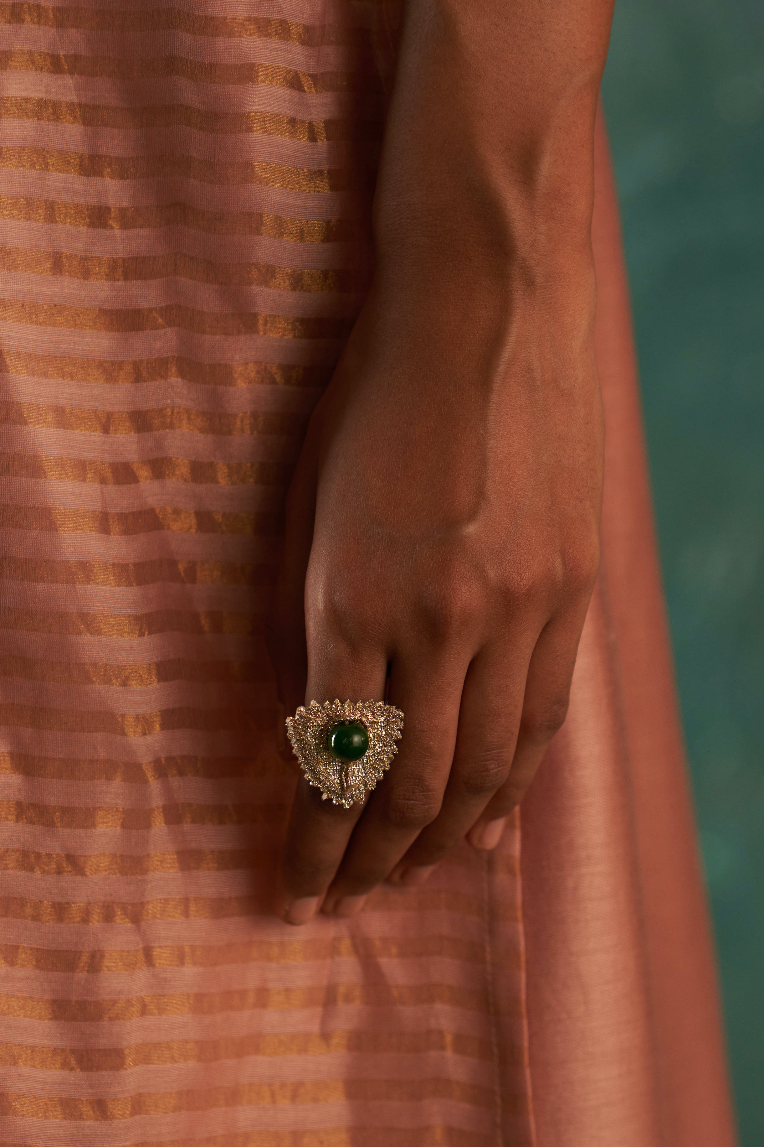 These exquisite ring combine the timeless beauty of warm gold tone with the grace of rich green gem. Handcrafted with gota and zari, it adds a touch of sophistication and a pop of color to any outfit Its subtle brilliance makes it a perfect statement piece for a special occasion or a night on the town. Get ready to sparkle and shine.