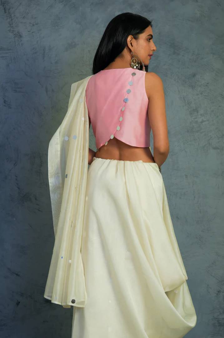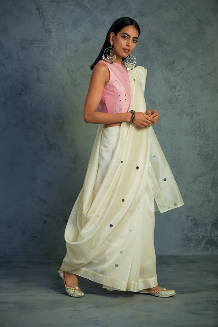 Chanderi off white saree embellished with mirror work on pleats and pallu, comes along with a sleeveless crop blouse embellished with mirror work. Enjoy the celebrations in this beautiful and unique saree.