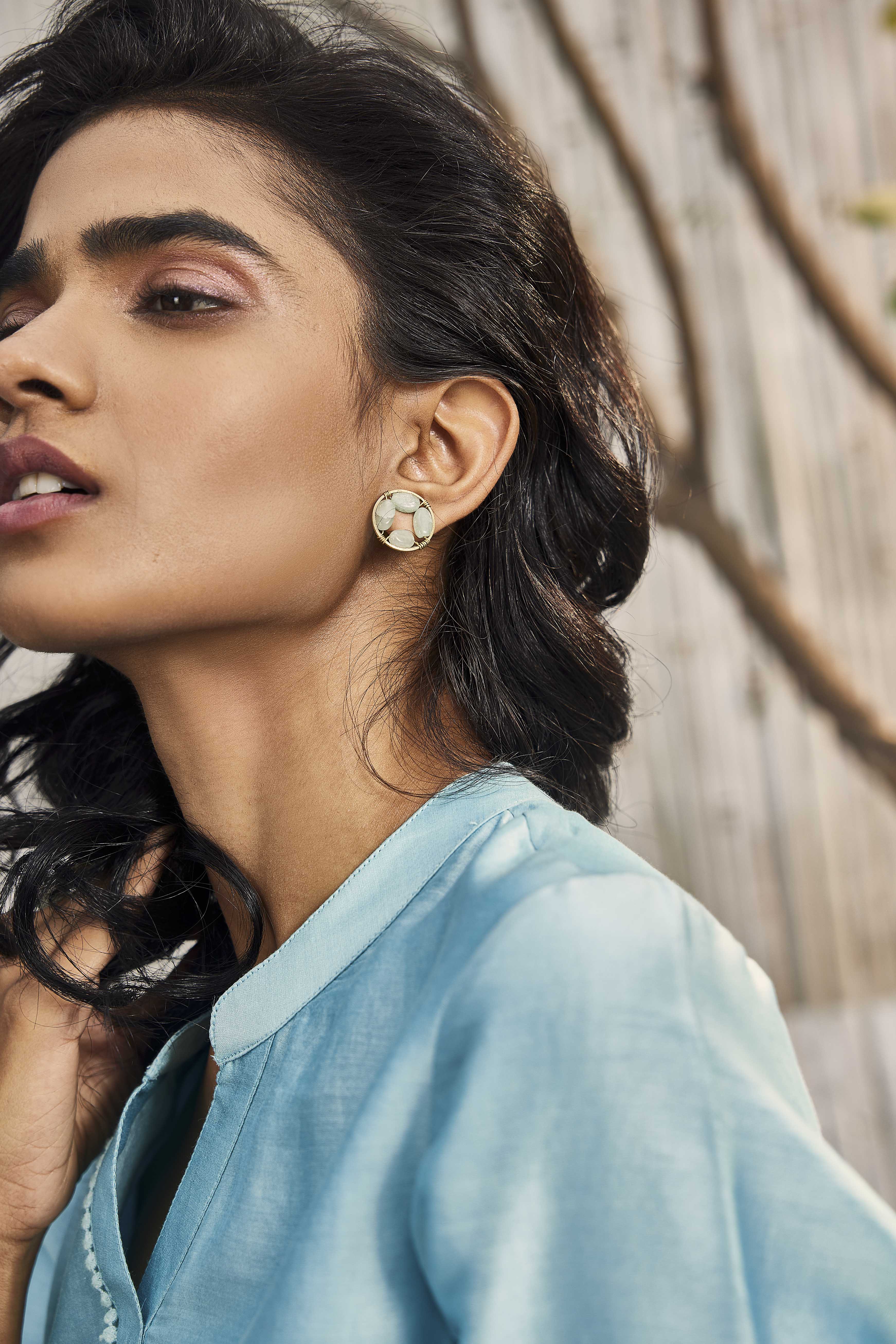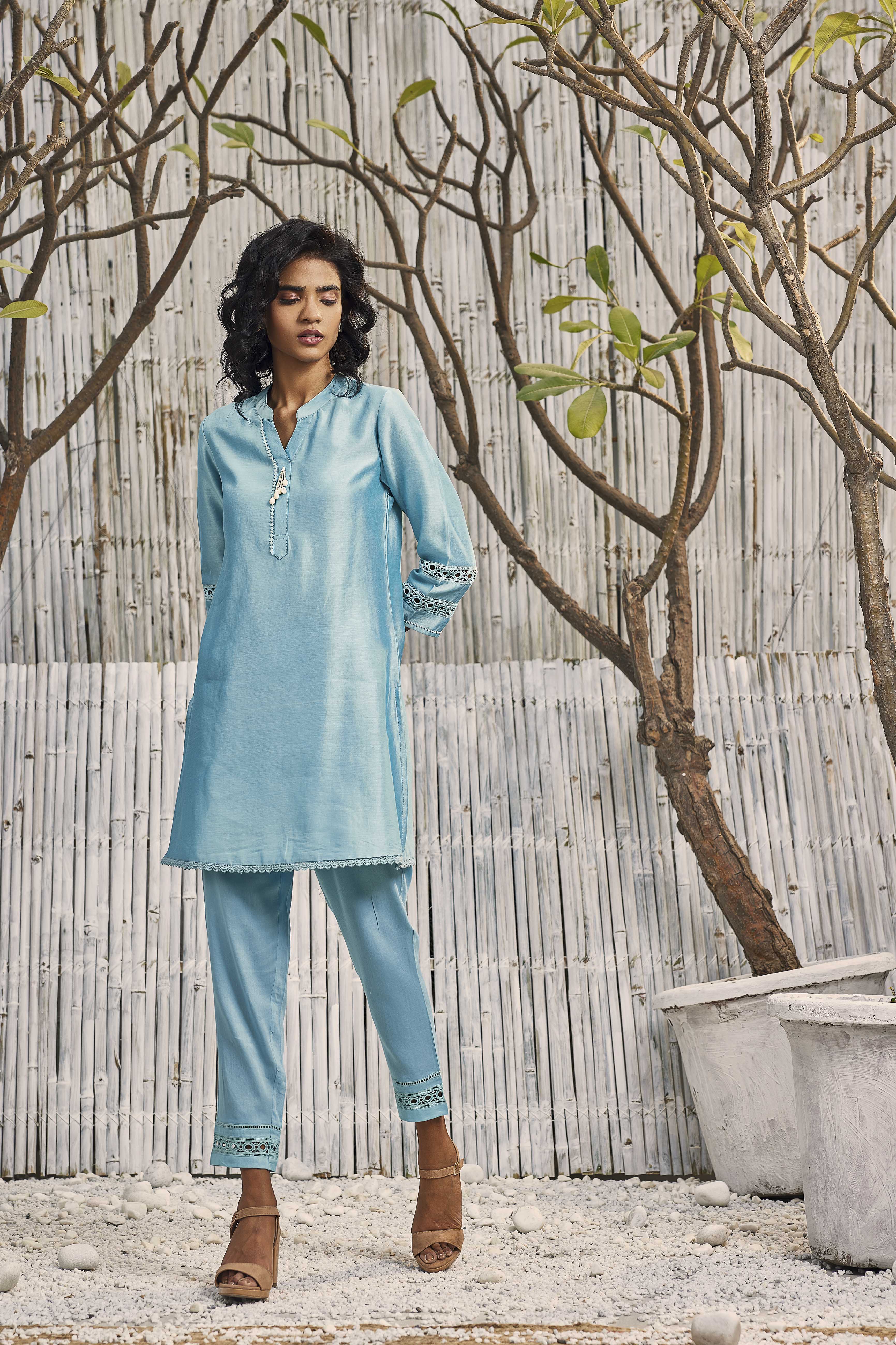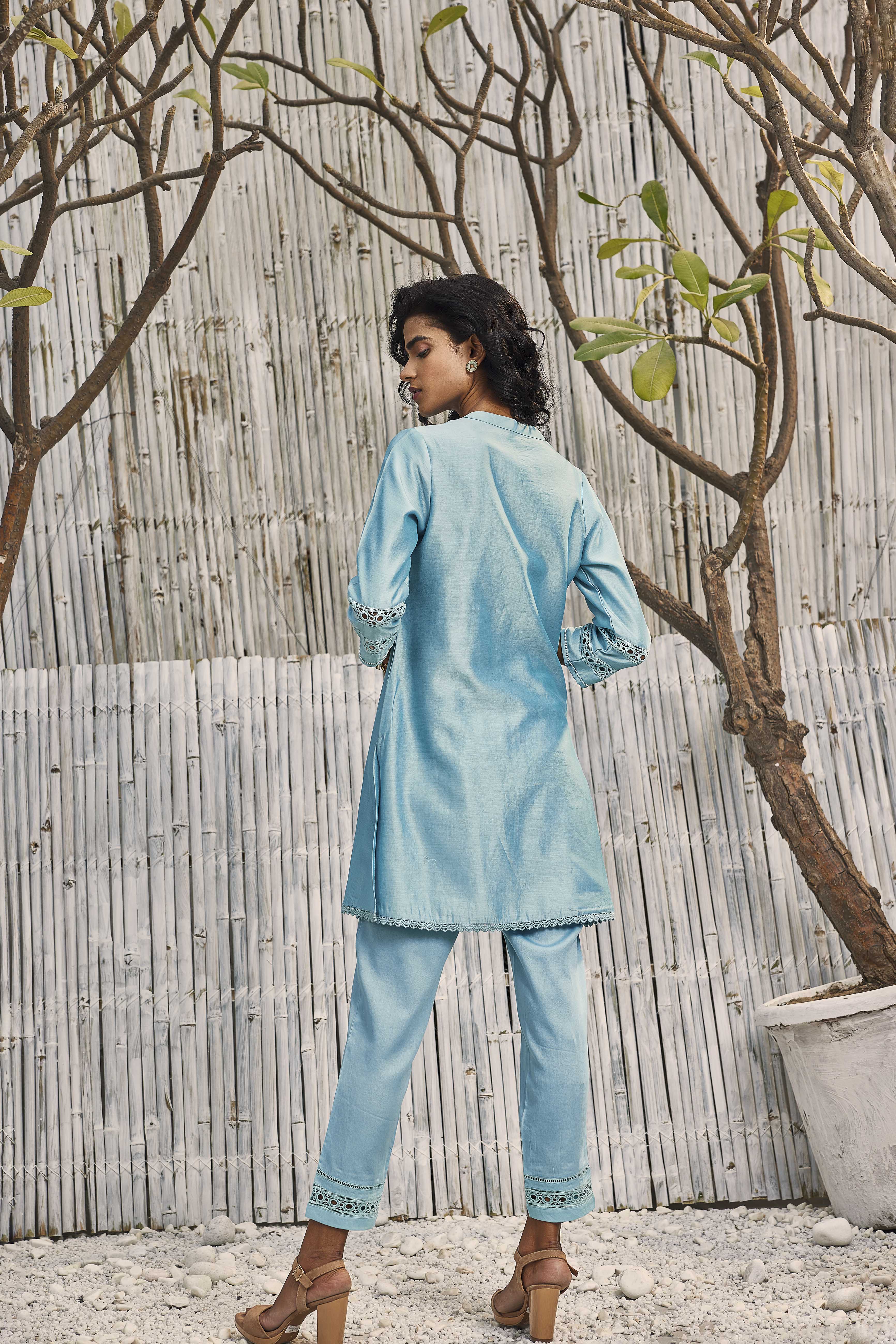 The classic tropical blue chanderi co-ord kurta set detailed with laces along the neckline, slleves and hemline. Handmade shell tassels adds a dainty element to the elegant outfit.