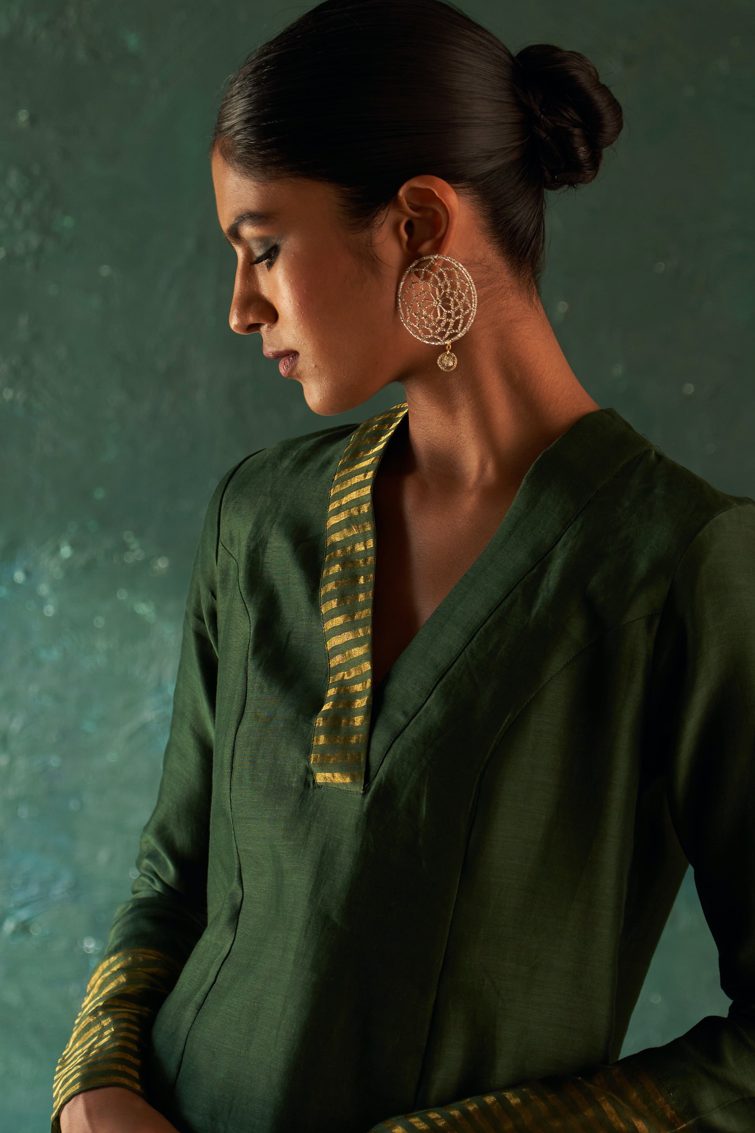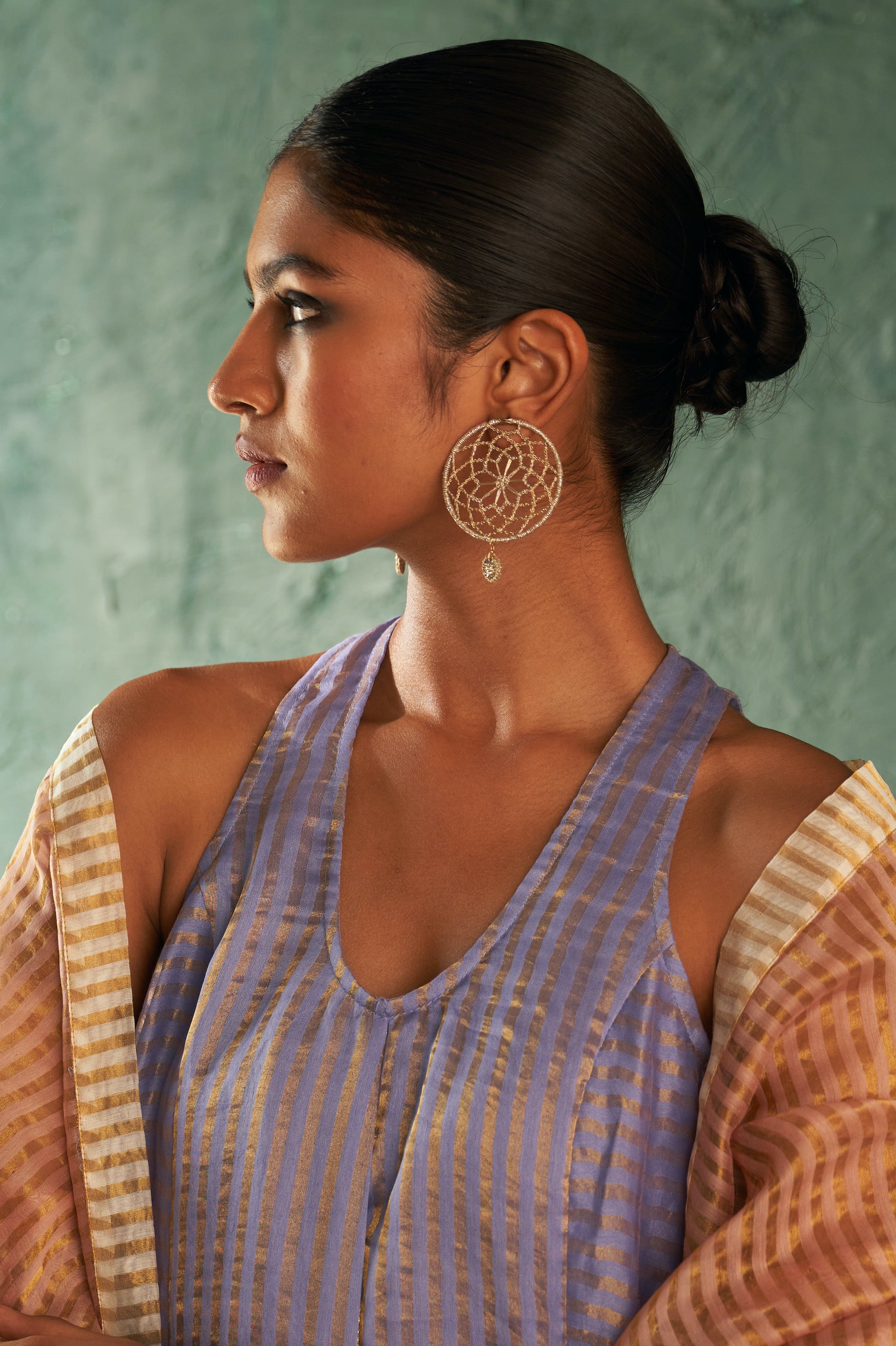 Exuding grace, these gold tone earrings, meticulously crafted from zari are a treat to the eyes. Zari is intricately shaped and manipulated to form intricate patterns showcases artisan's skill and creativity, resulting in a wearable work of art that adds a touch of sophistication and individuality to any ensemble.