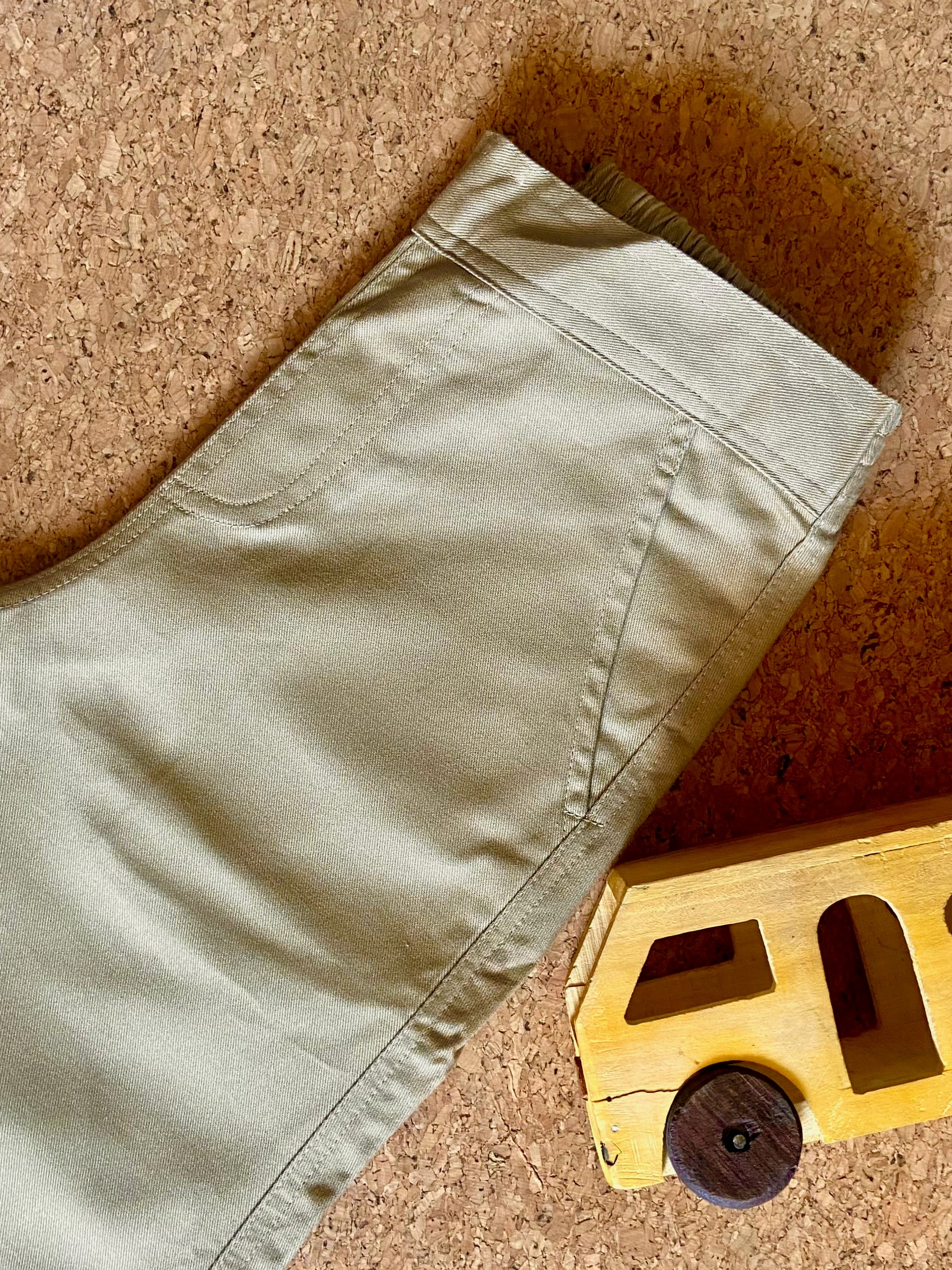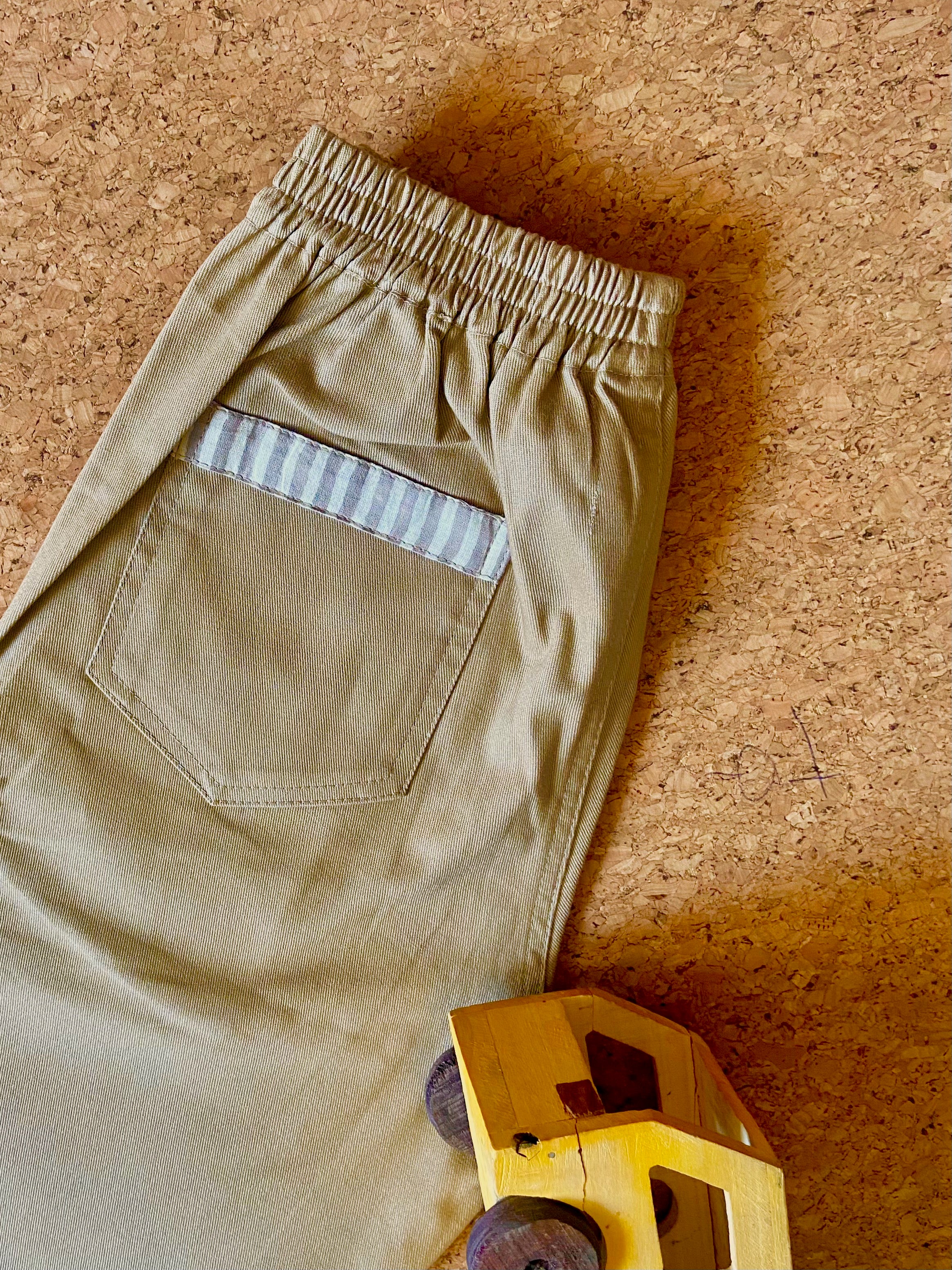 Beige woven mid rise joggers has an elasticated waist band at back, two side pockets and elasticated hem. The back pocket has a block printed styling patch.