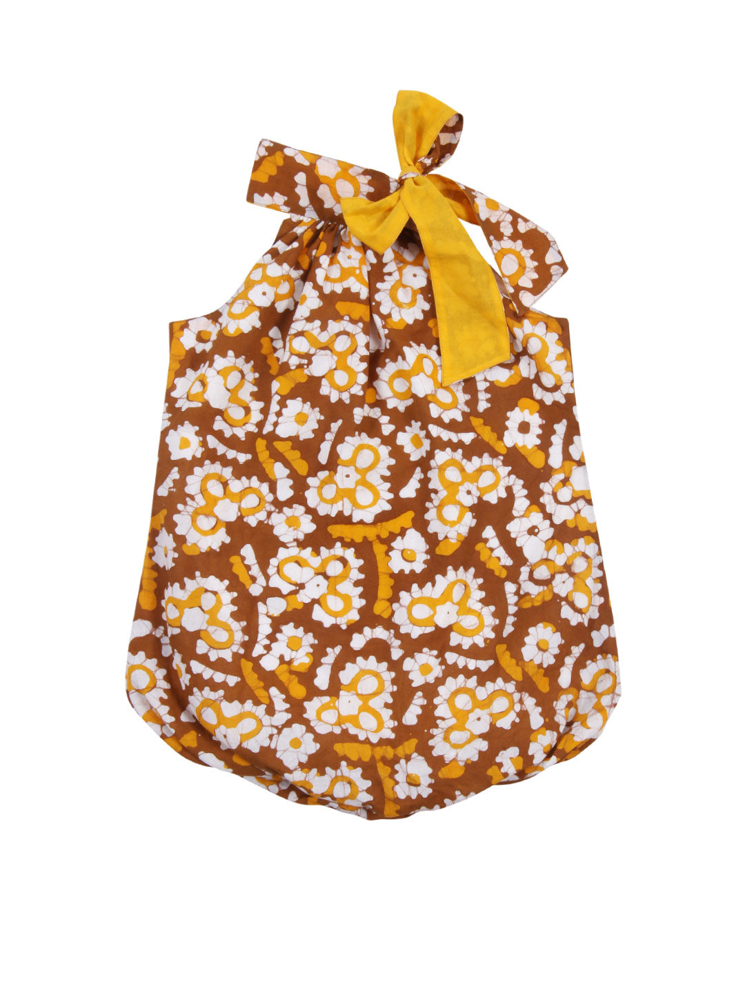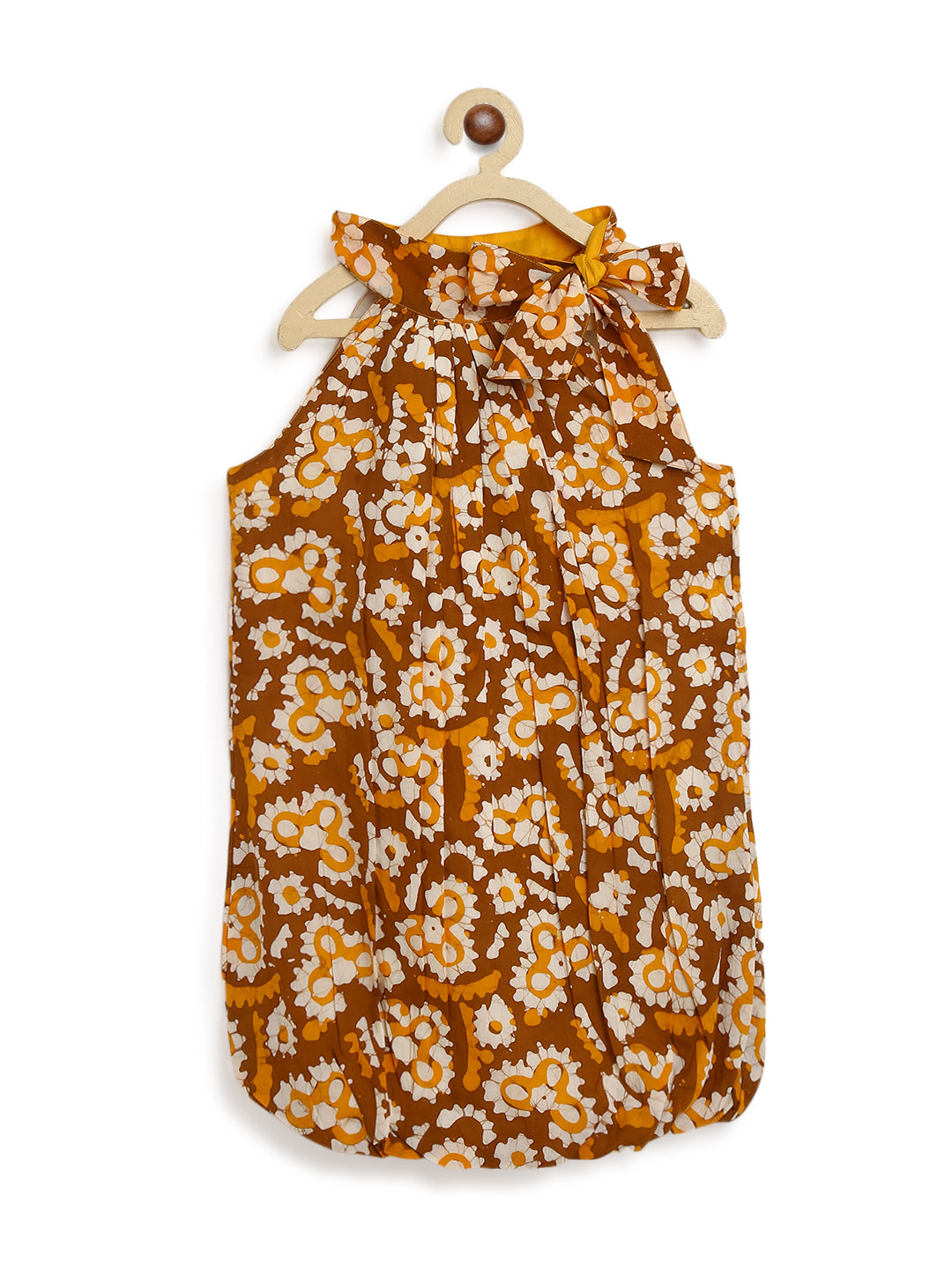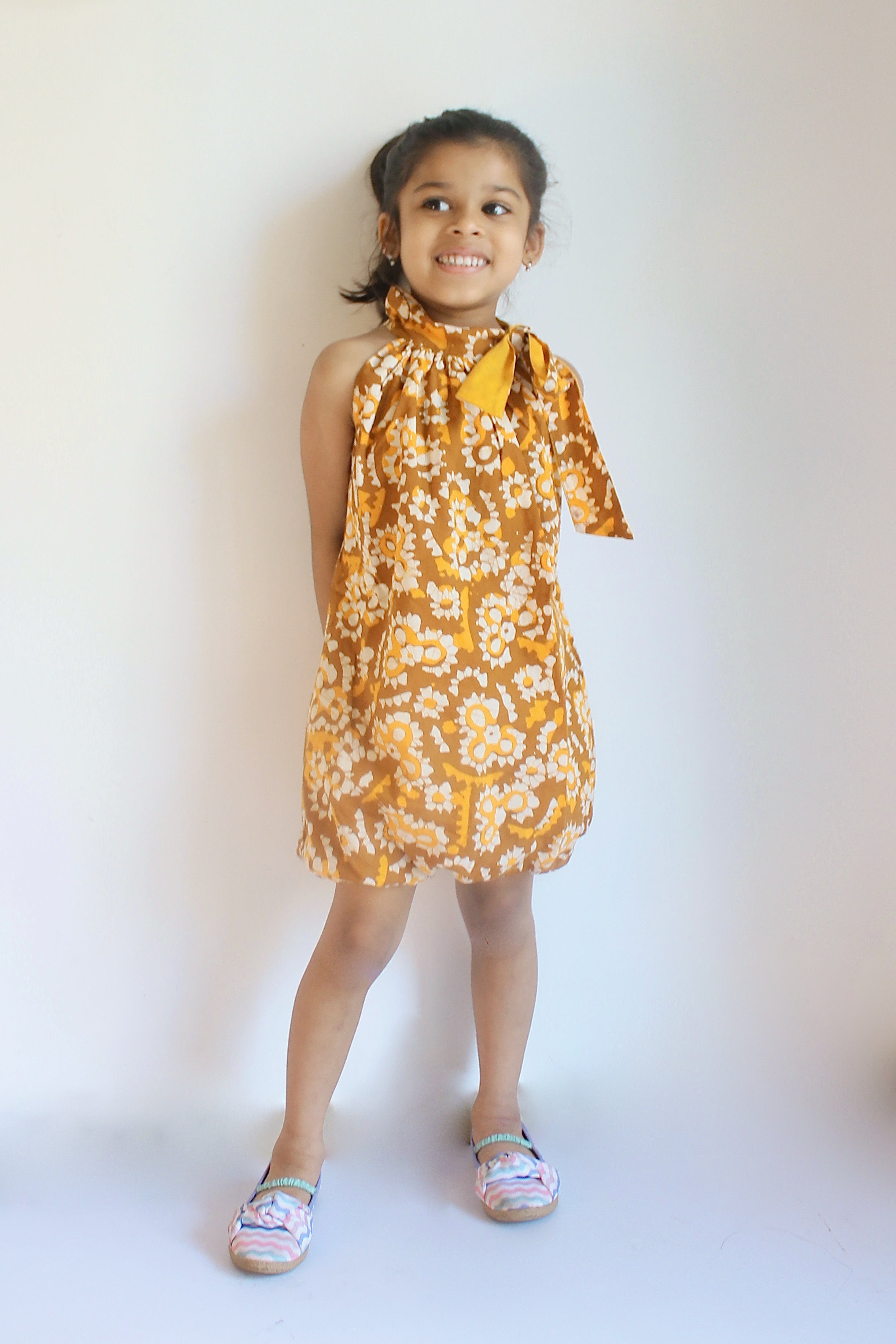 Bow tie dress with beautiful motif all over.Bright yellow tie up on neck band for a cute look.