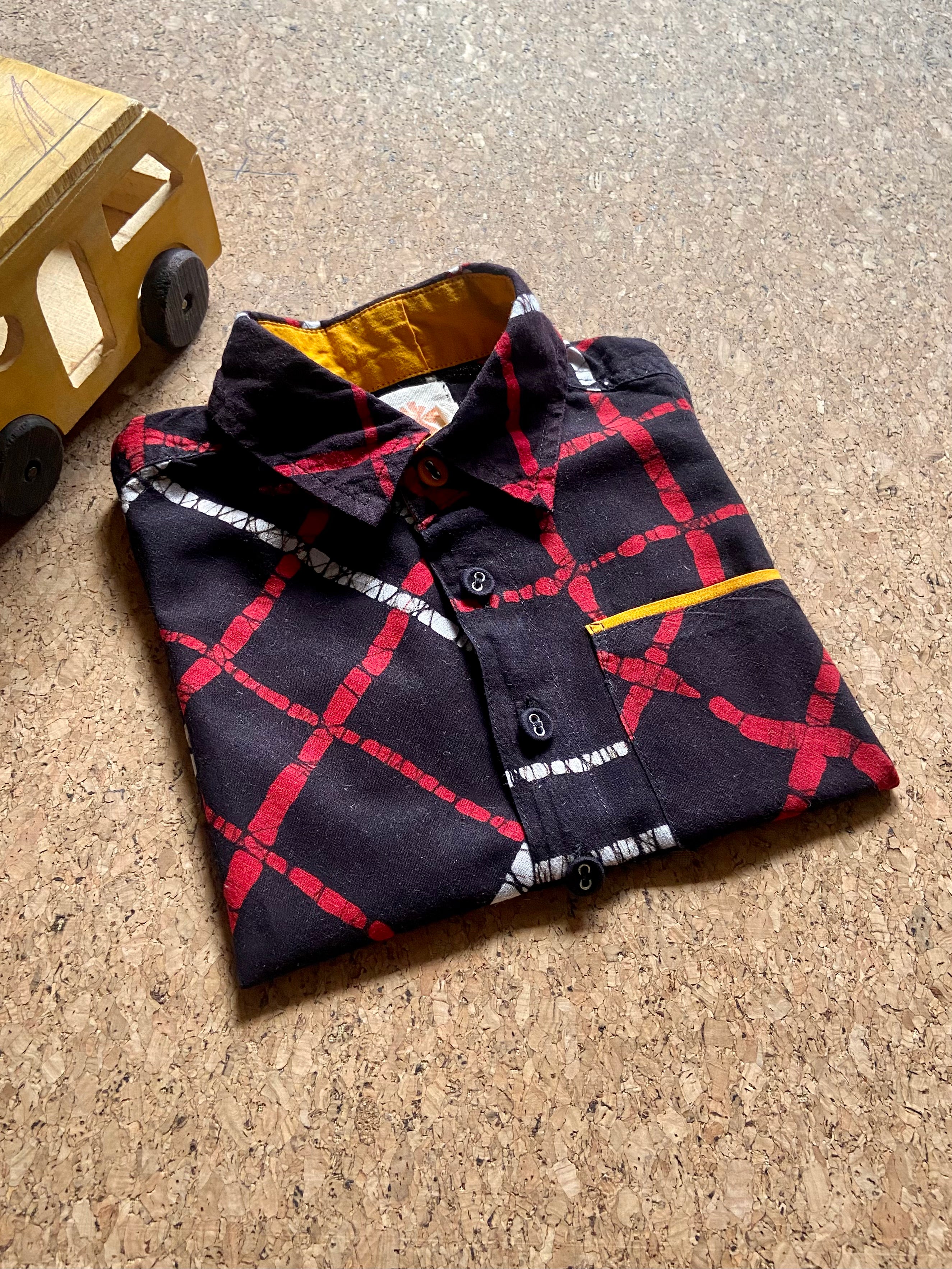 Block printed black casual shirt for boys. It has a spread collar, short sleeves, button placket, chest pocket and straight hem.