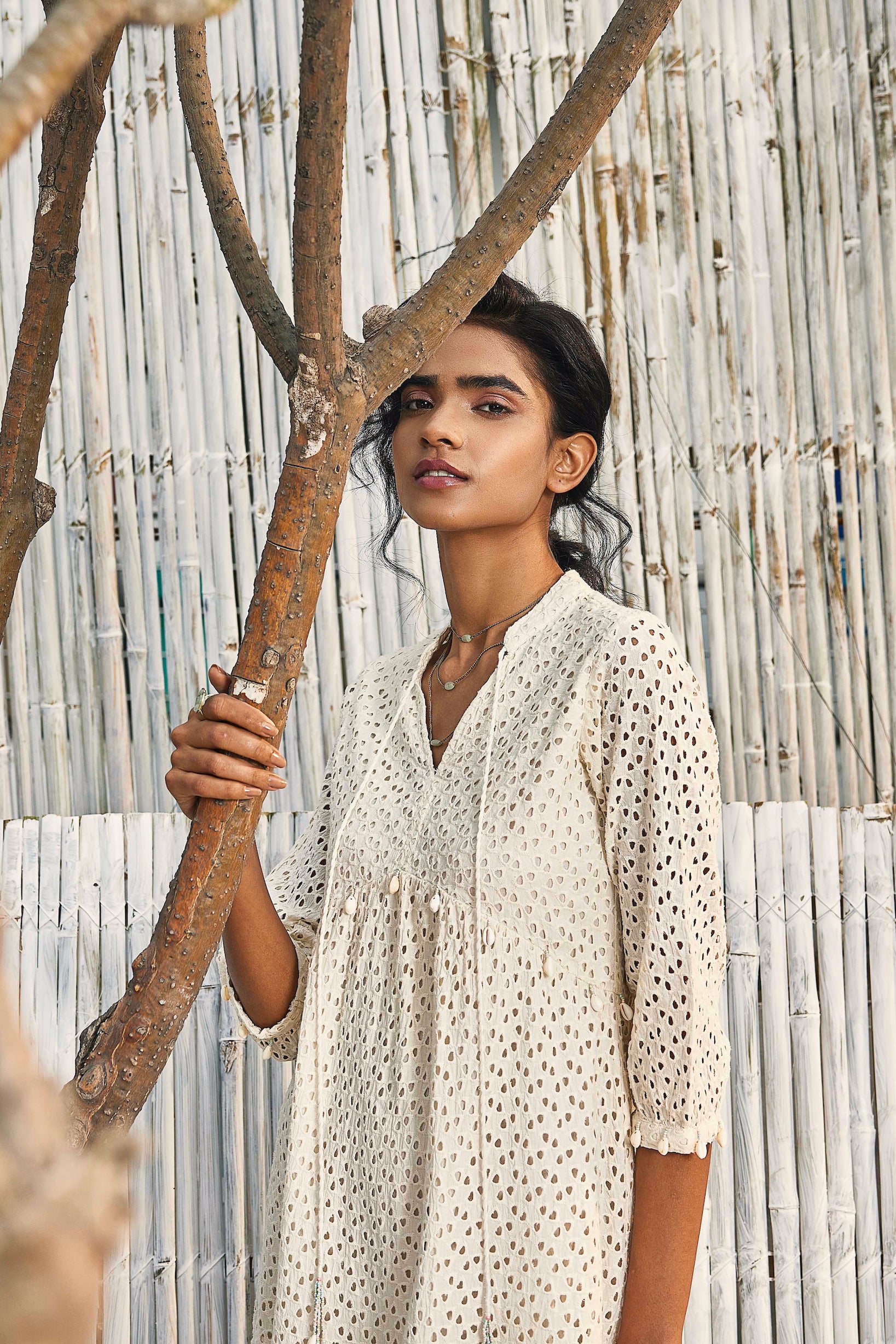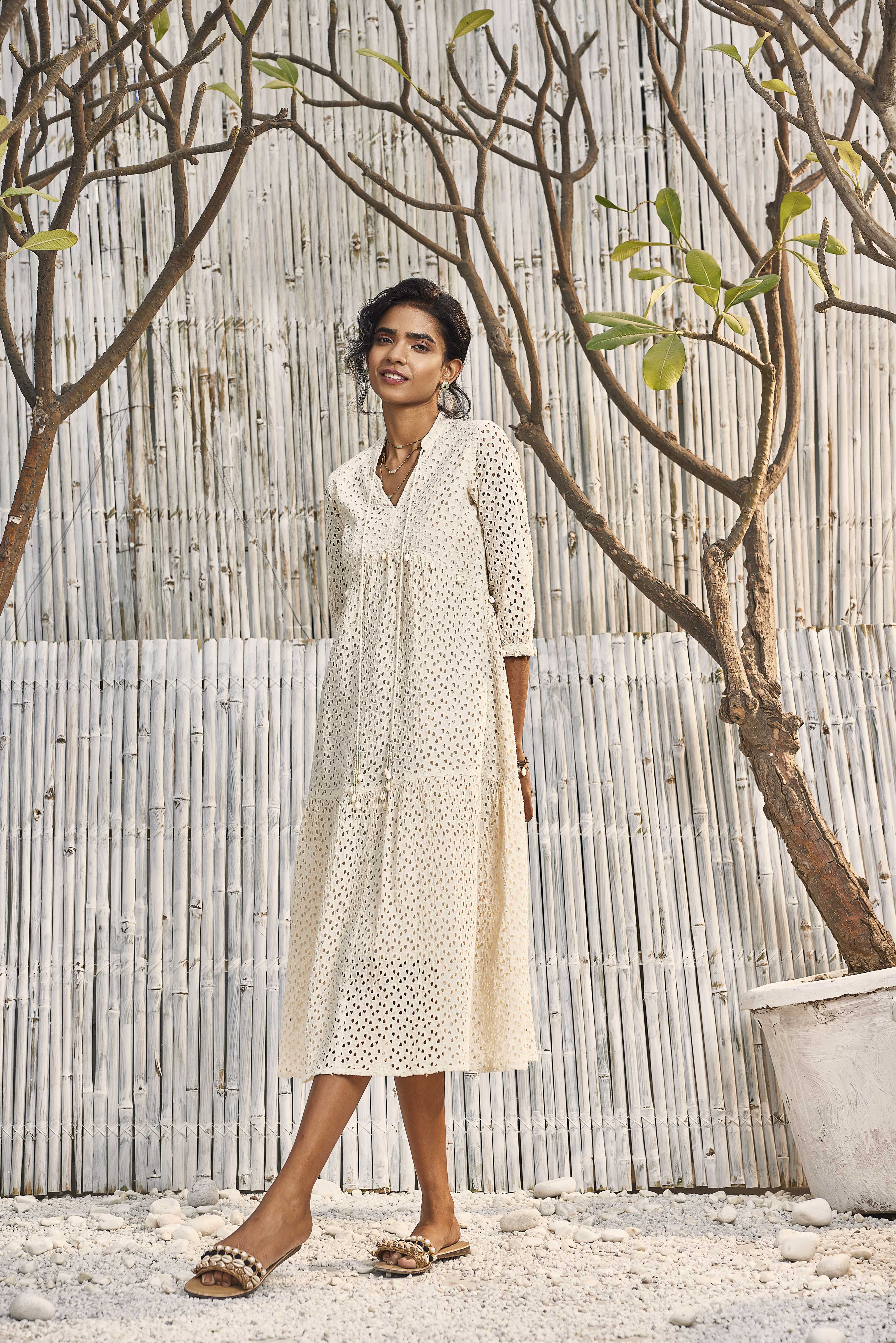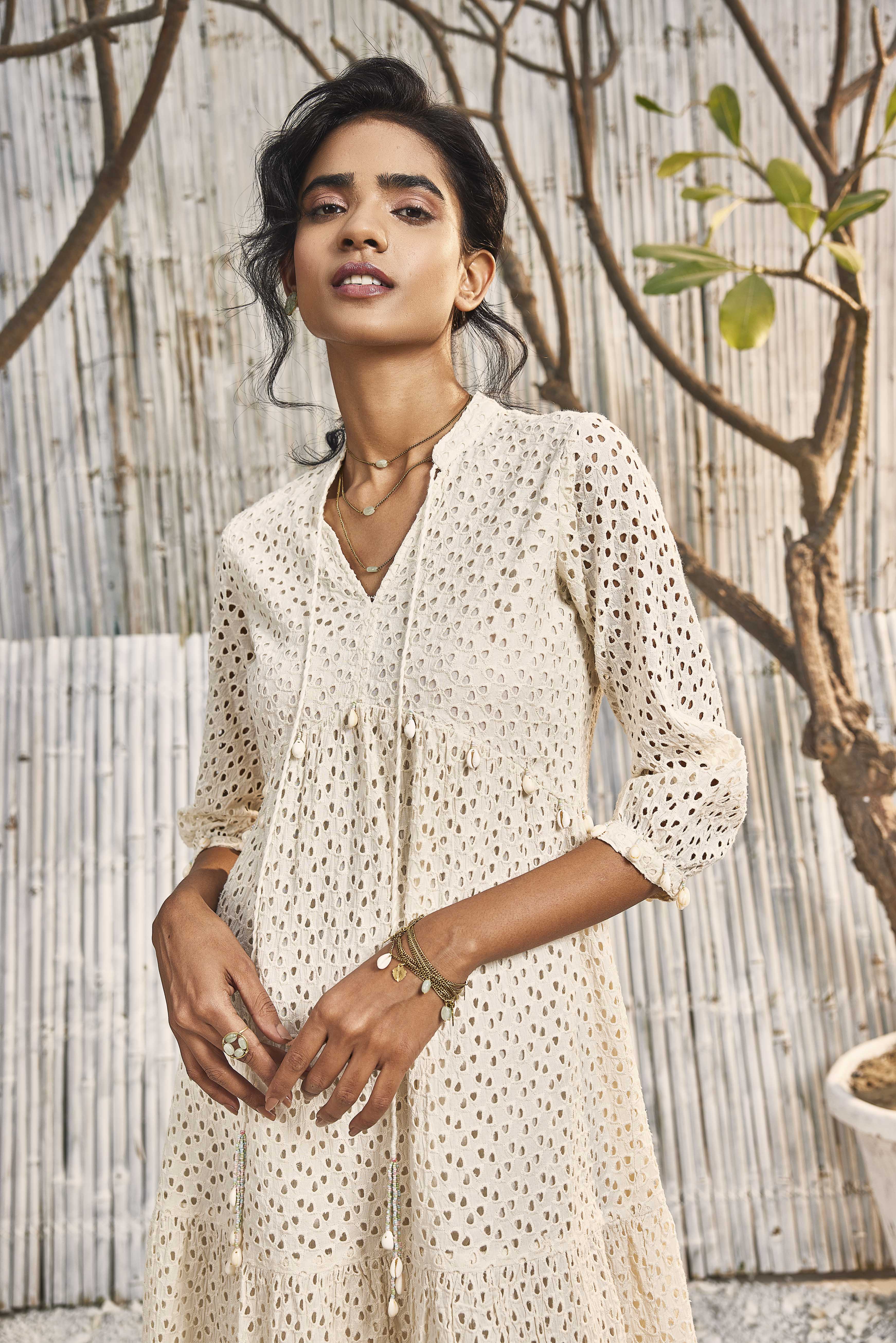 This breezy dress in charming schiffli fabric that sways with you is a must have in your summer wardrobe. Gather detailing at the tiers and handmade shell tassels adds up to the summer vibe.