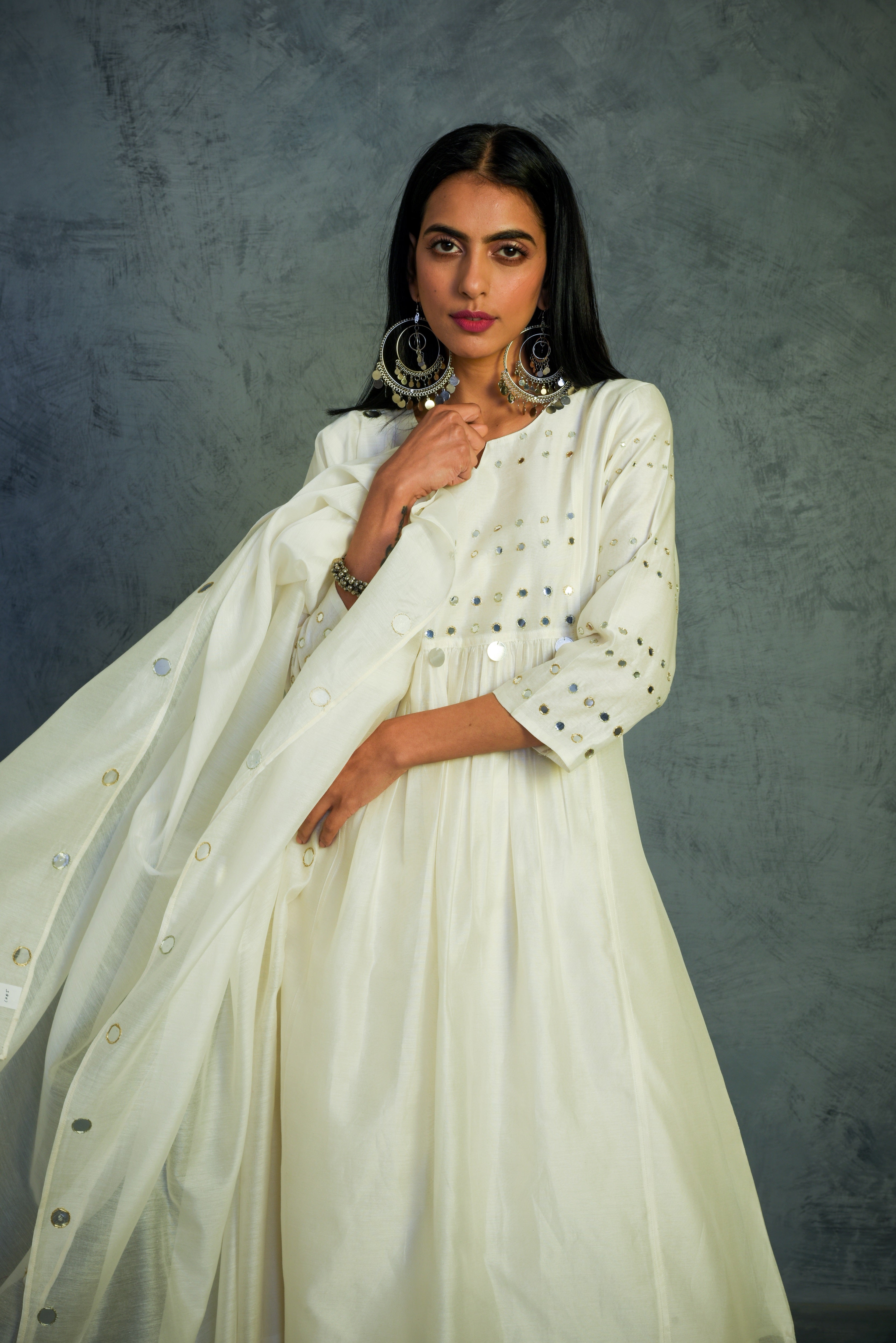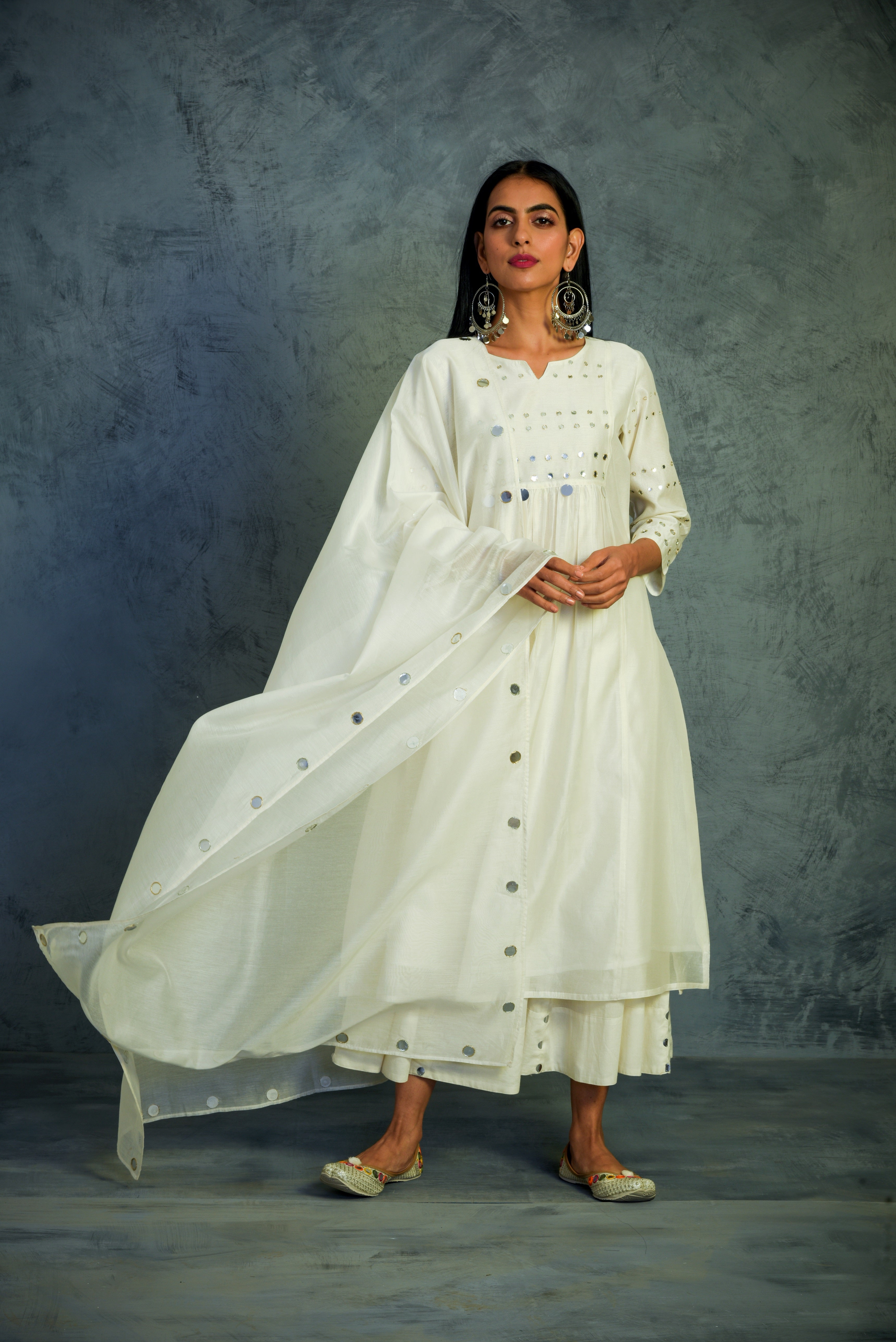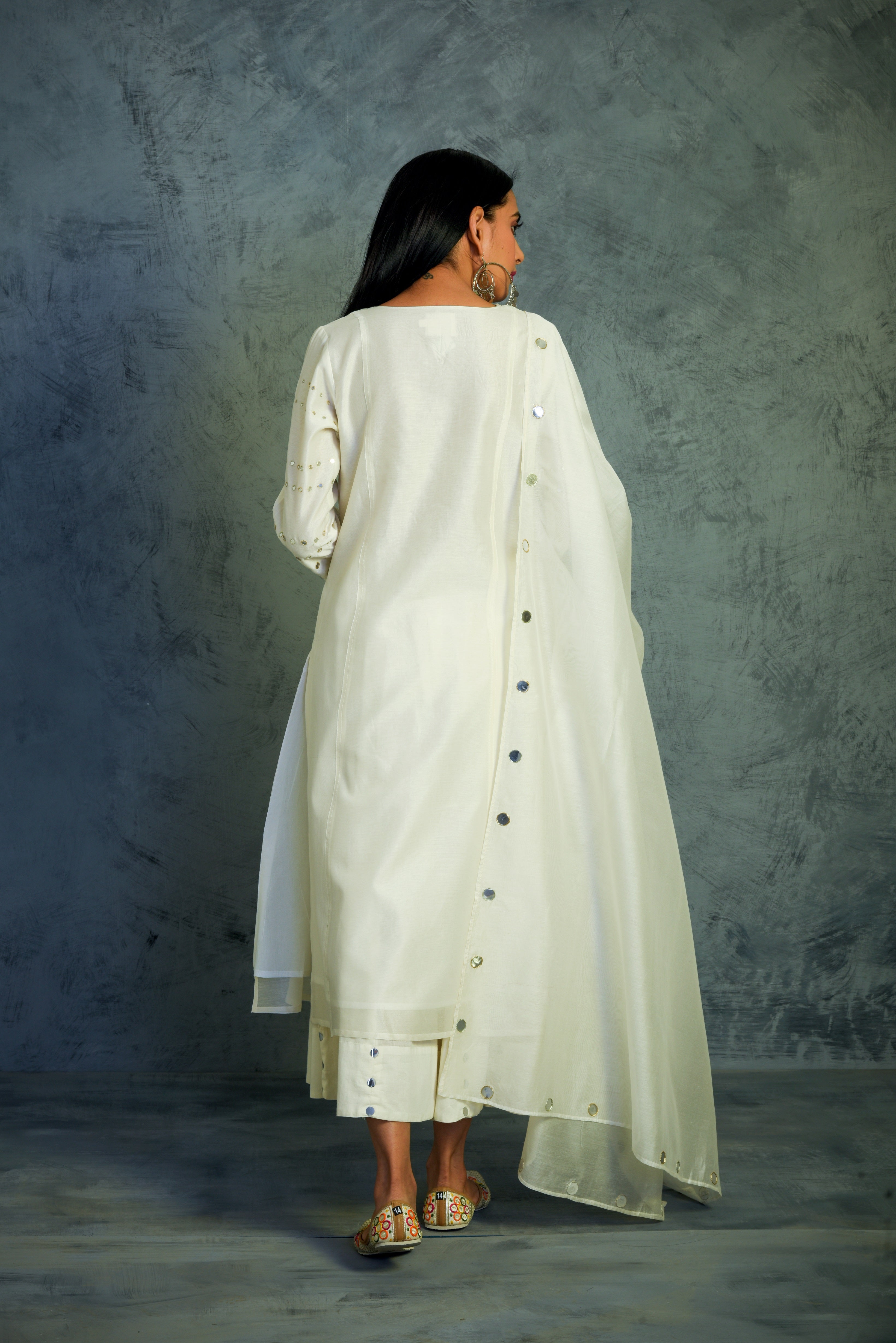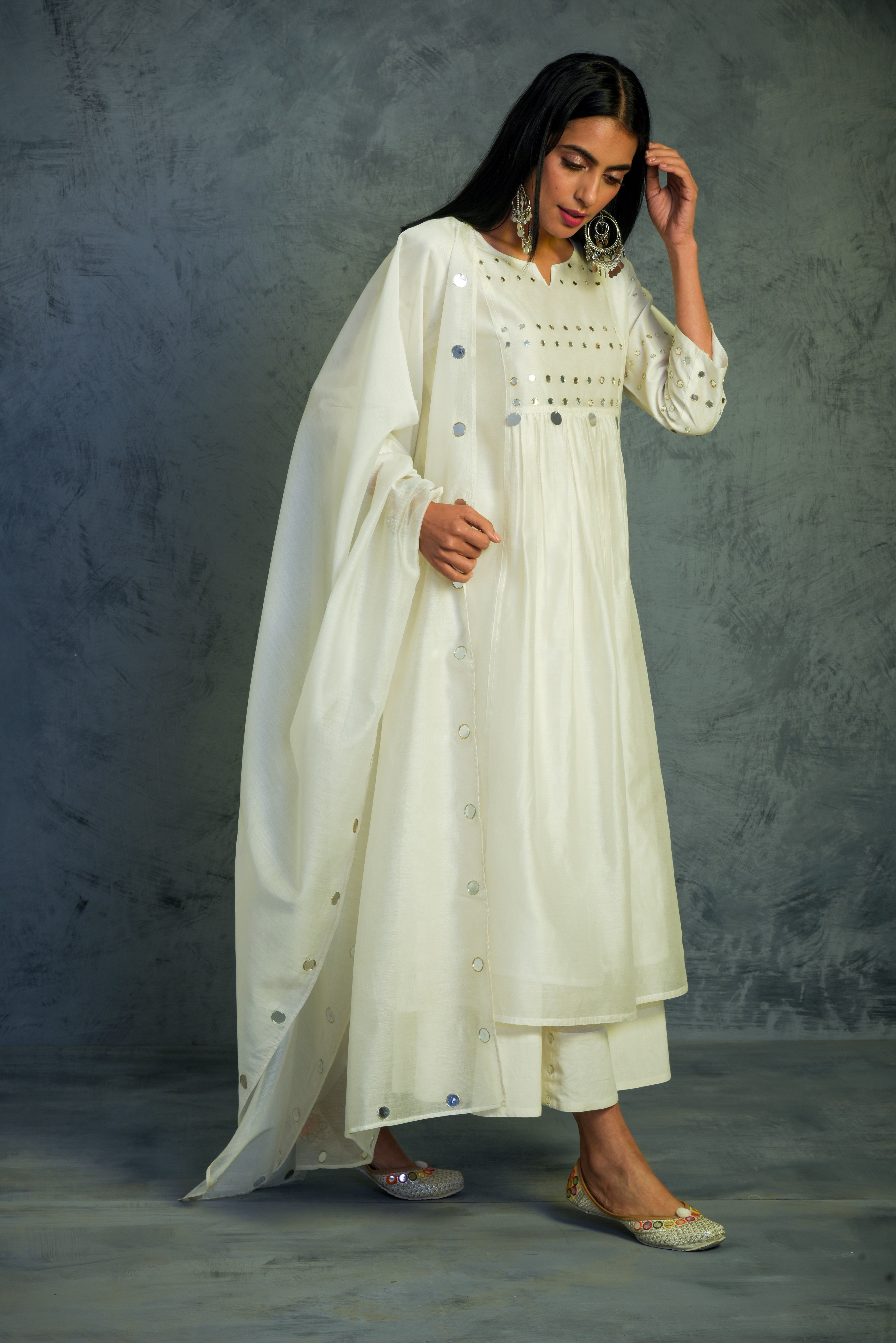 Chanderi kurta with mirror work on yoke and sleeves. This Front yoke gathered kurta set is paired with a chanderi dupatta with mirror work on borders and comes along with cotton wide flared palazzos highlighted with mirrors. Perfect festive dressing for a glittery evening.