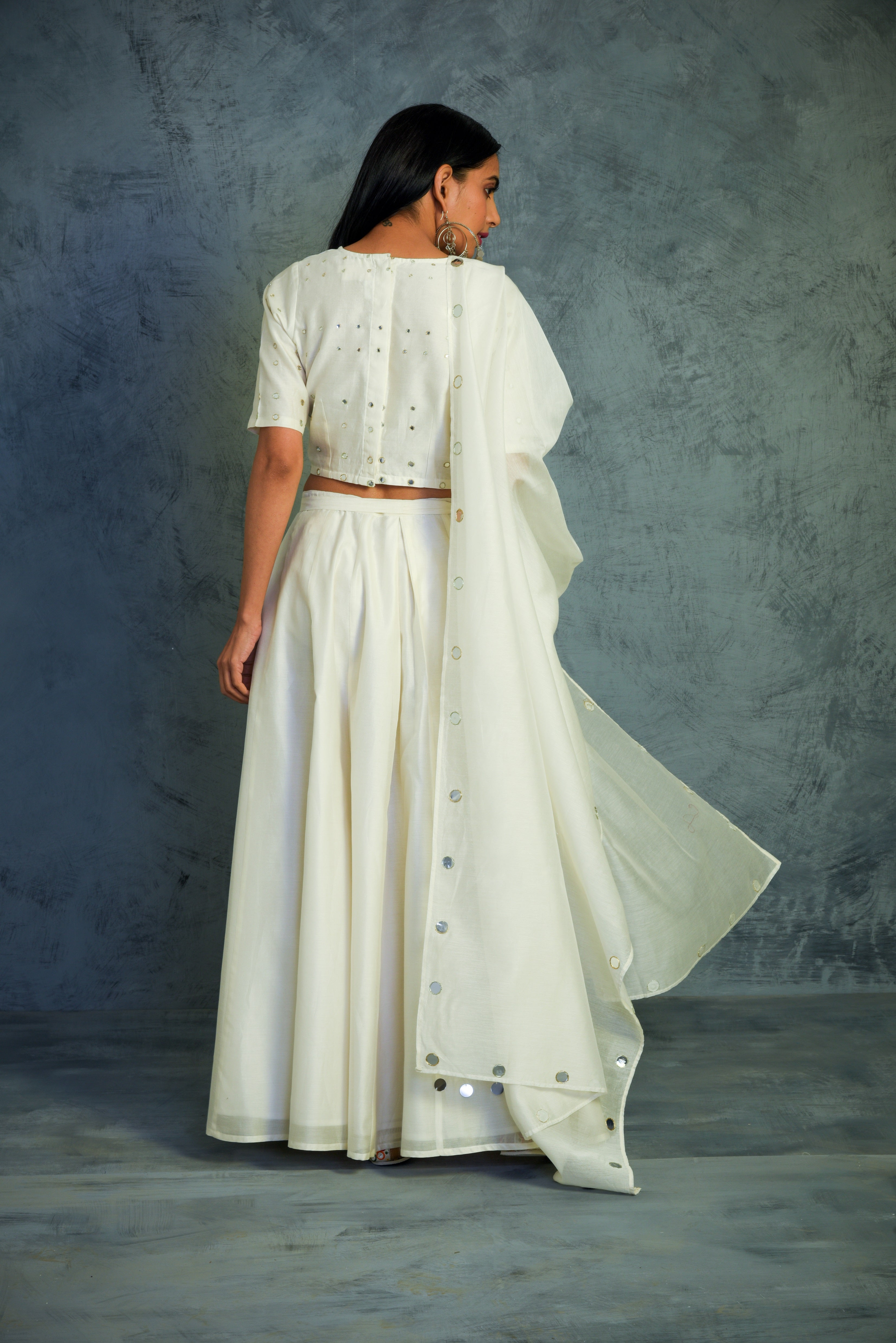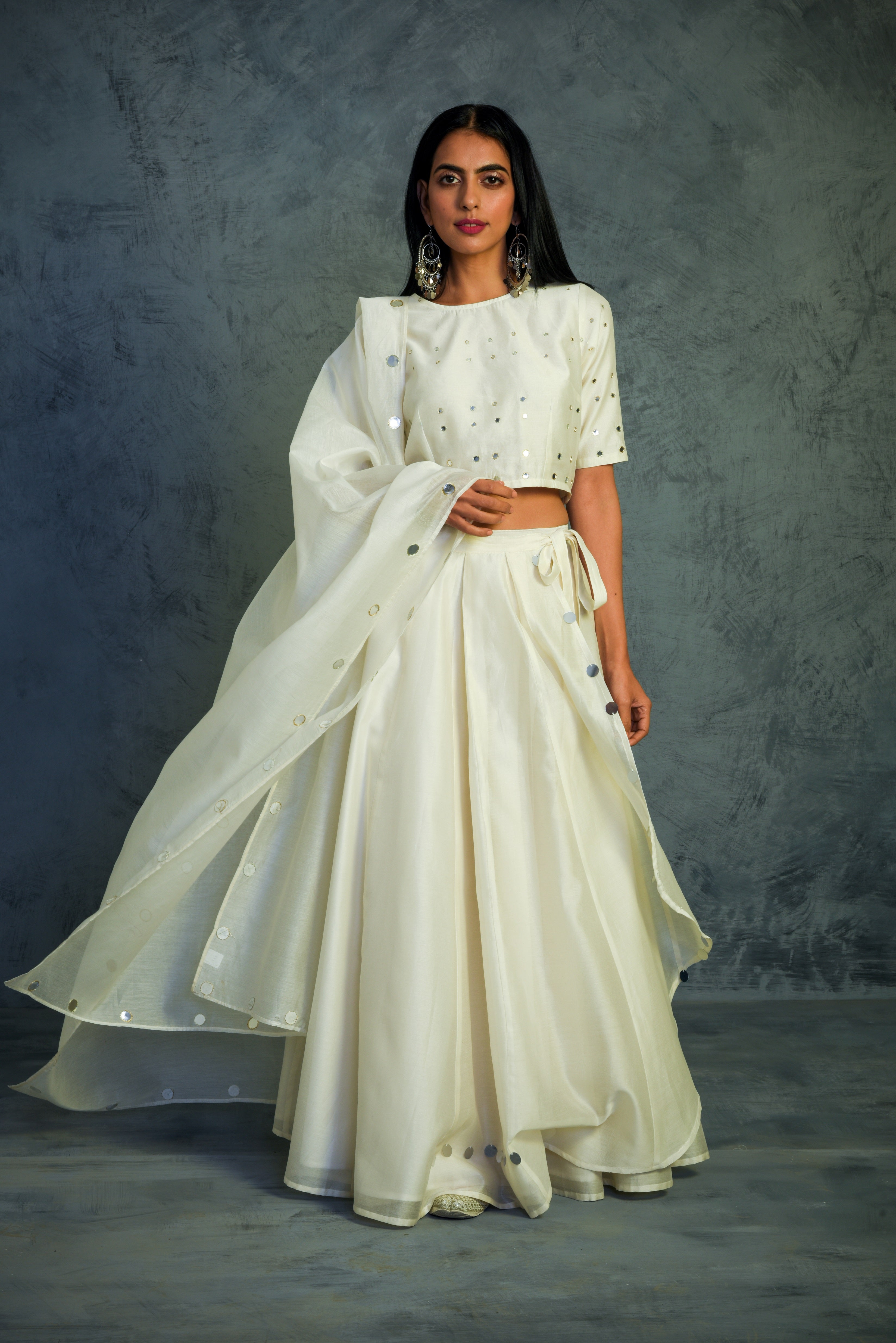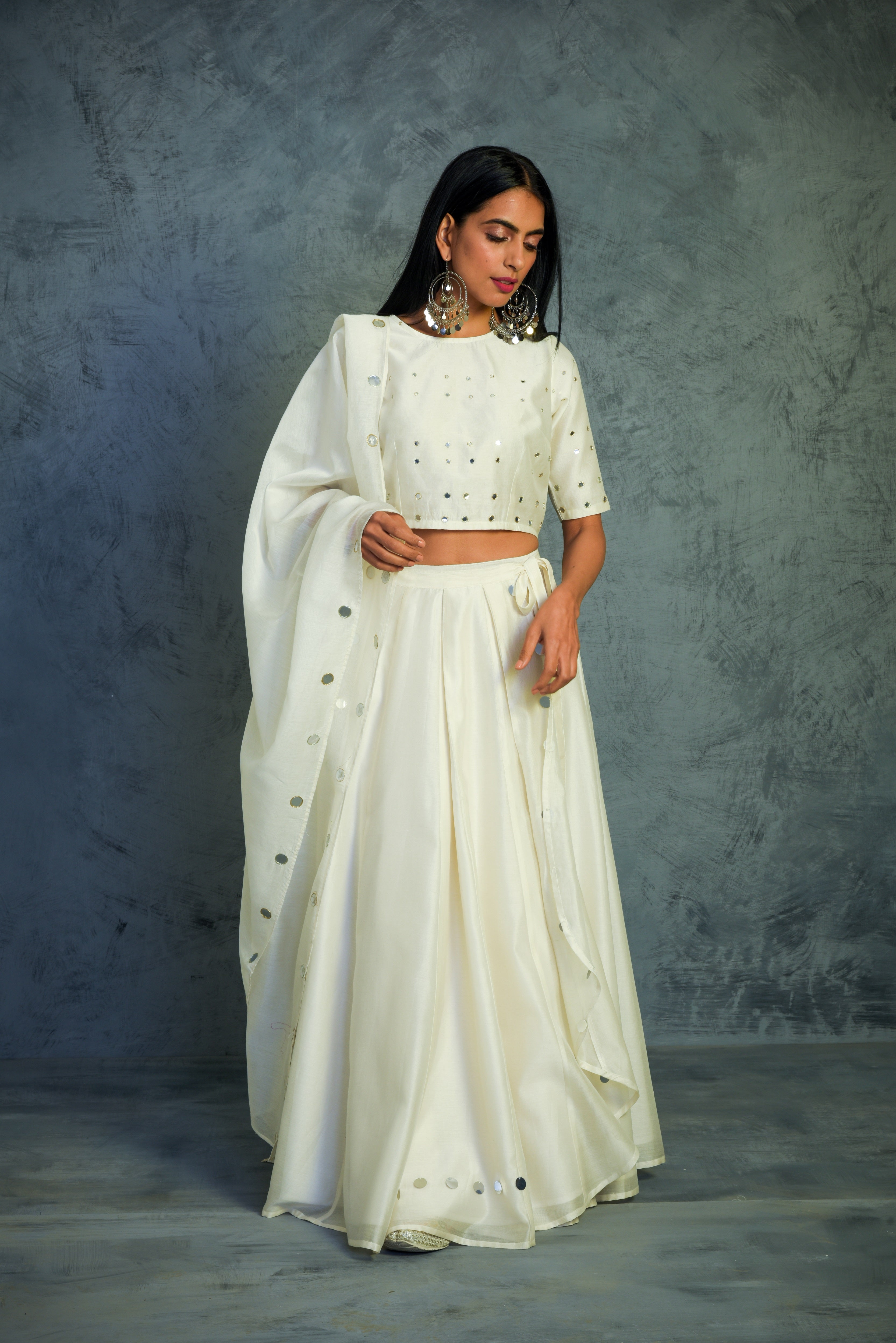 Chanderi wrap around lehenga in Off-White color with contrast panels paired with a mirror work embellished crop top and chanderi dupatta highlighted with mirror on borders.