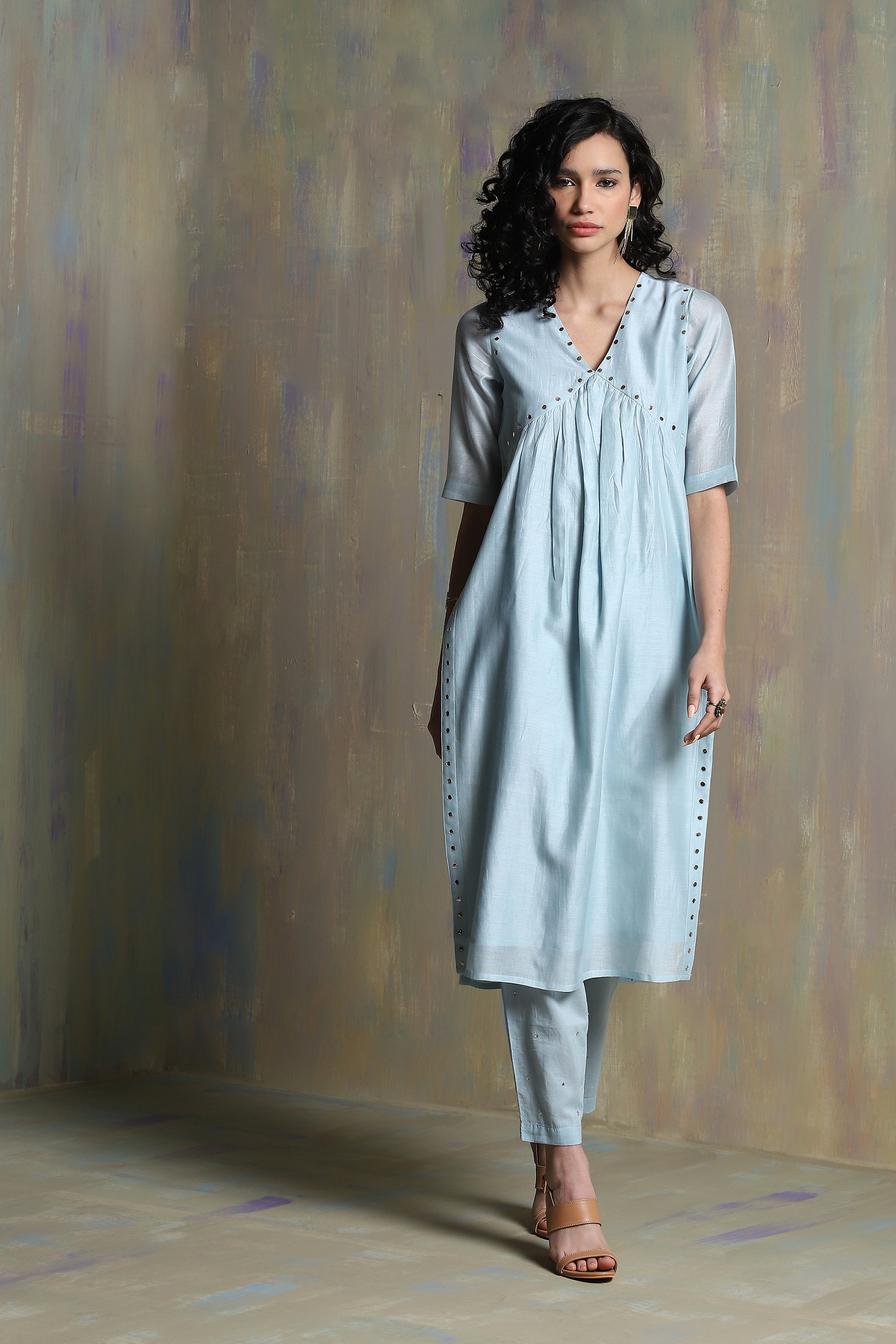 Chanderi kurta with embroidery, embedded with mirrors on yoke and side slits. This kurta is paired with straight pants & chanderi dupatta embellished with mirrors on its border.