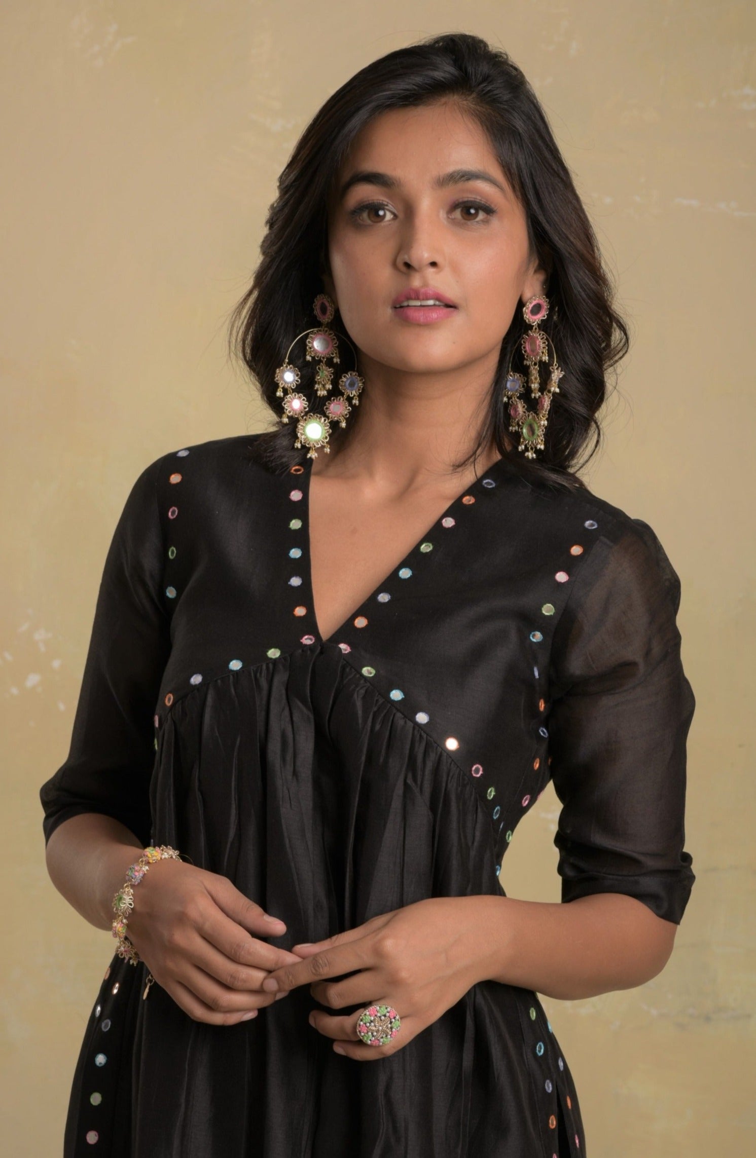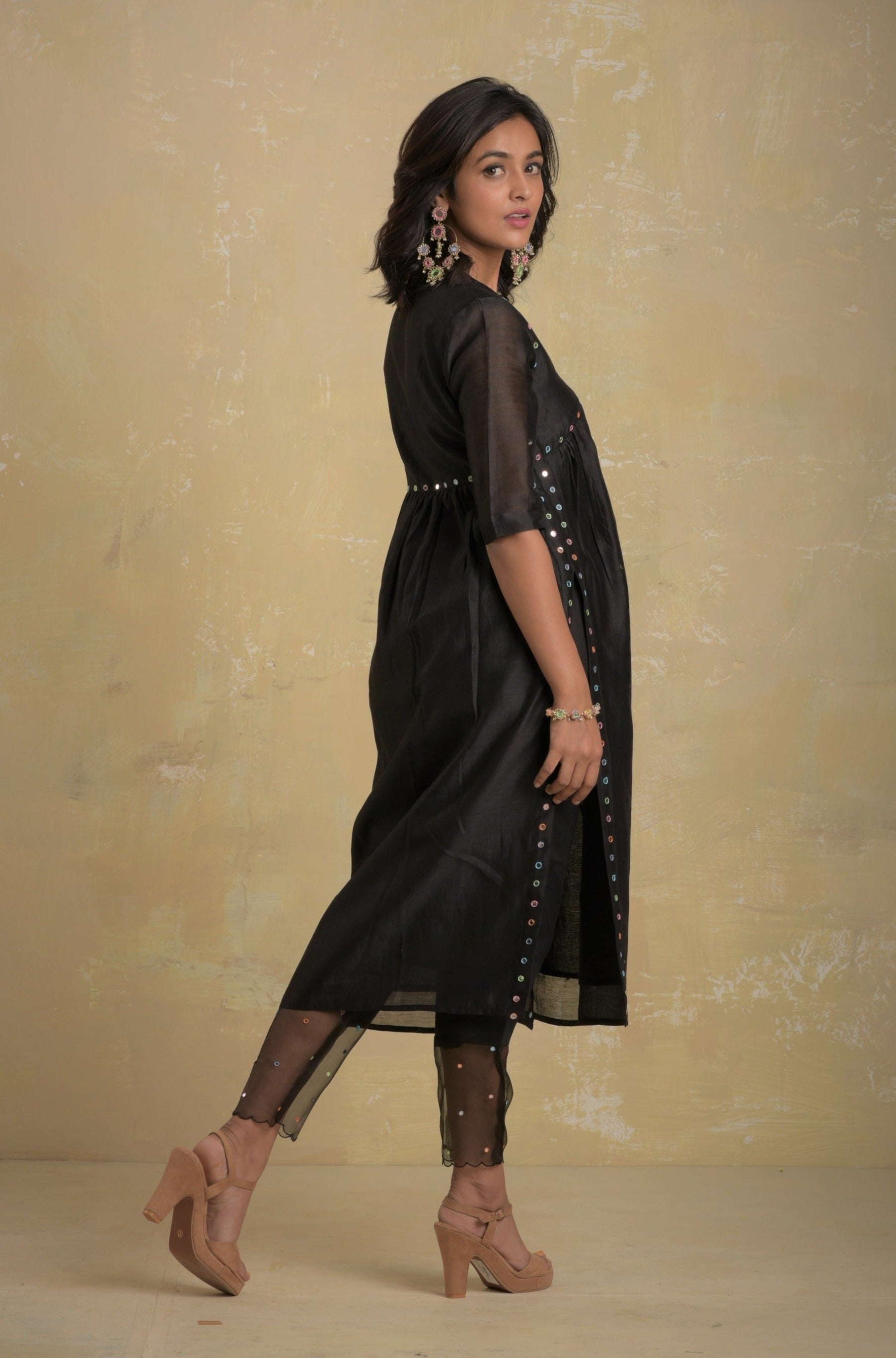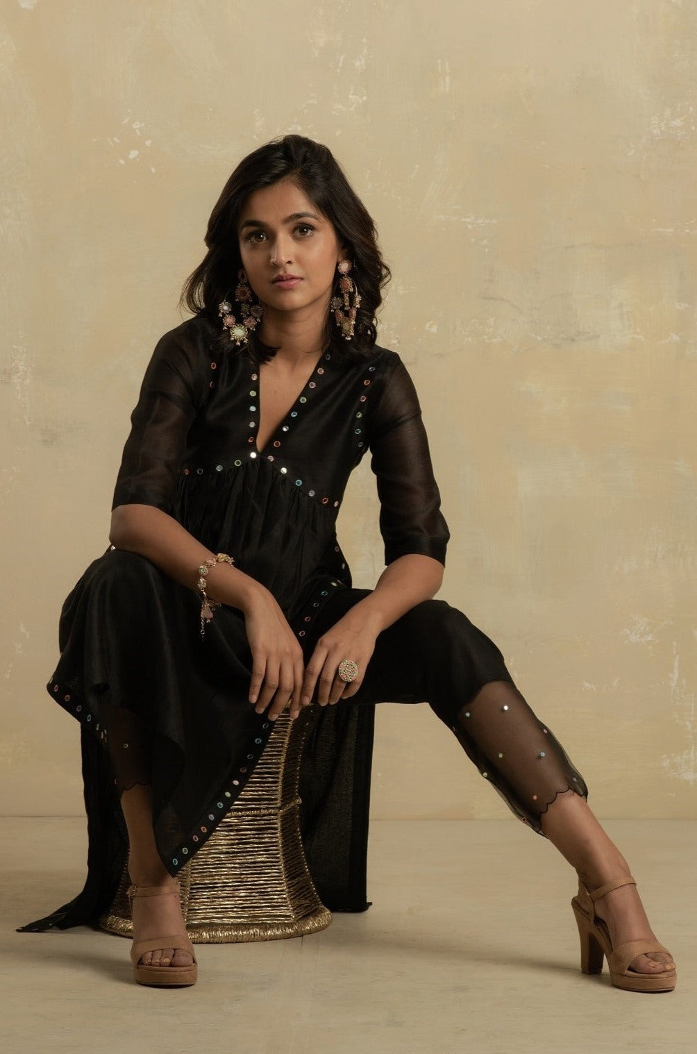 Chanderi kurta with colored embroidery, embedded with mirrors on yoke and side slits. This kurta is paired with straight organza panel pants & sheer organza dupatta embellished with silver sequins.