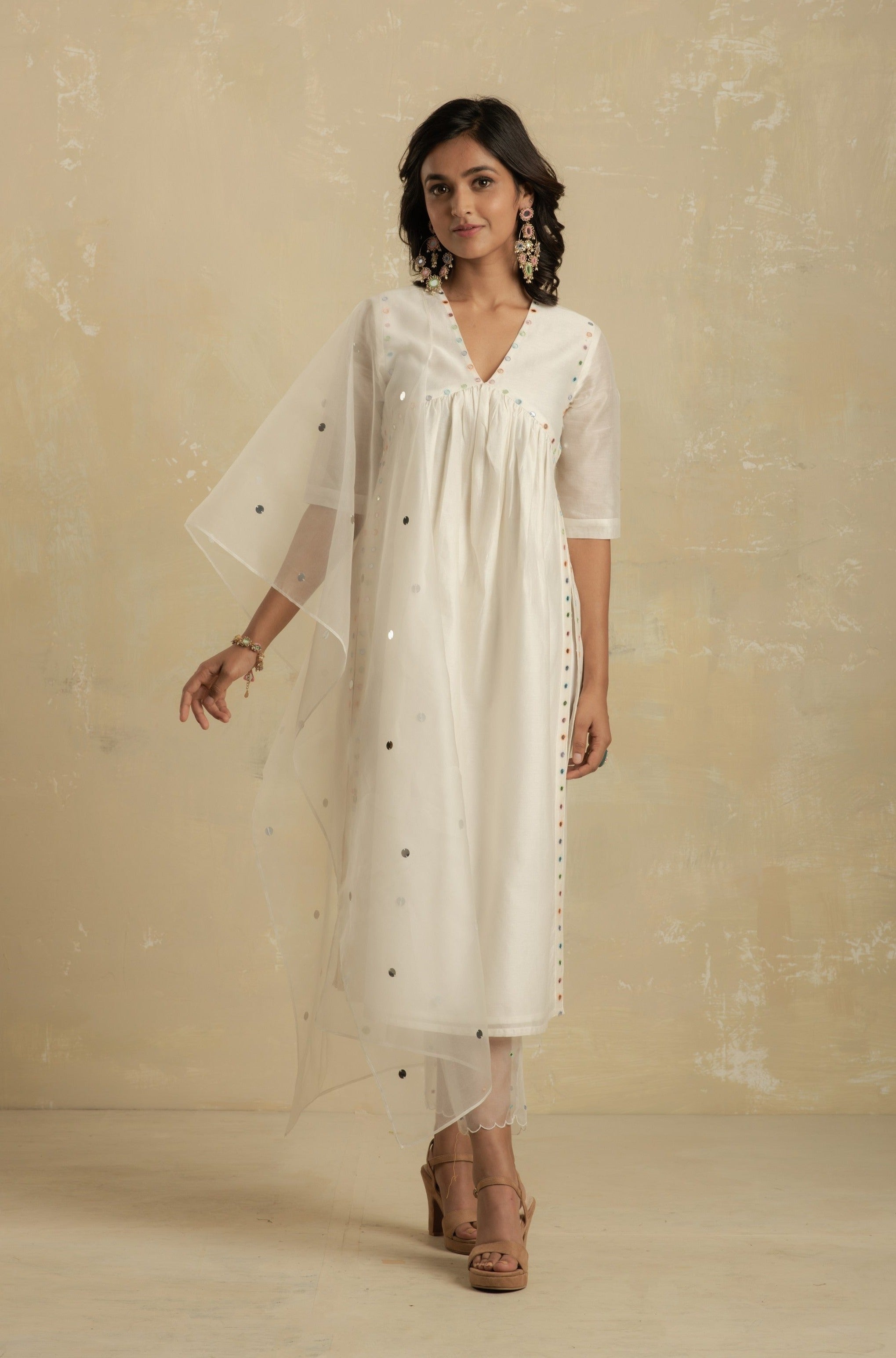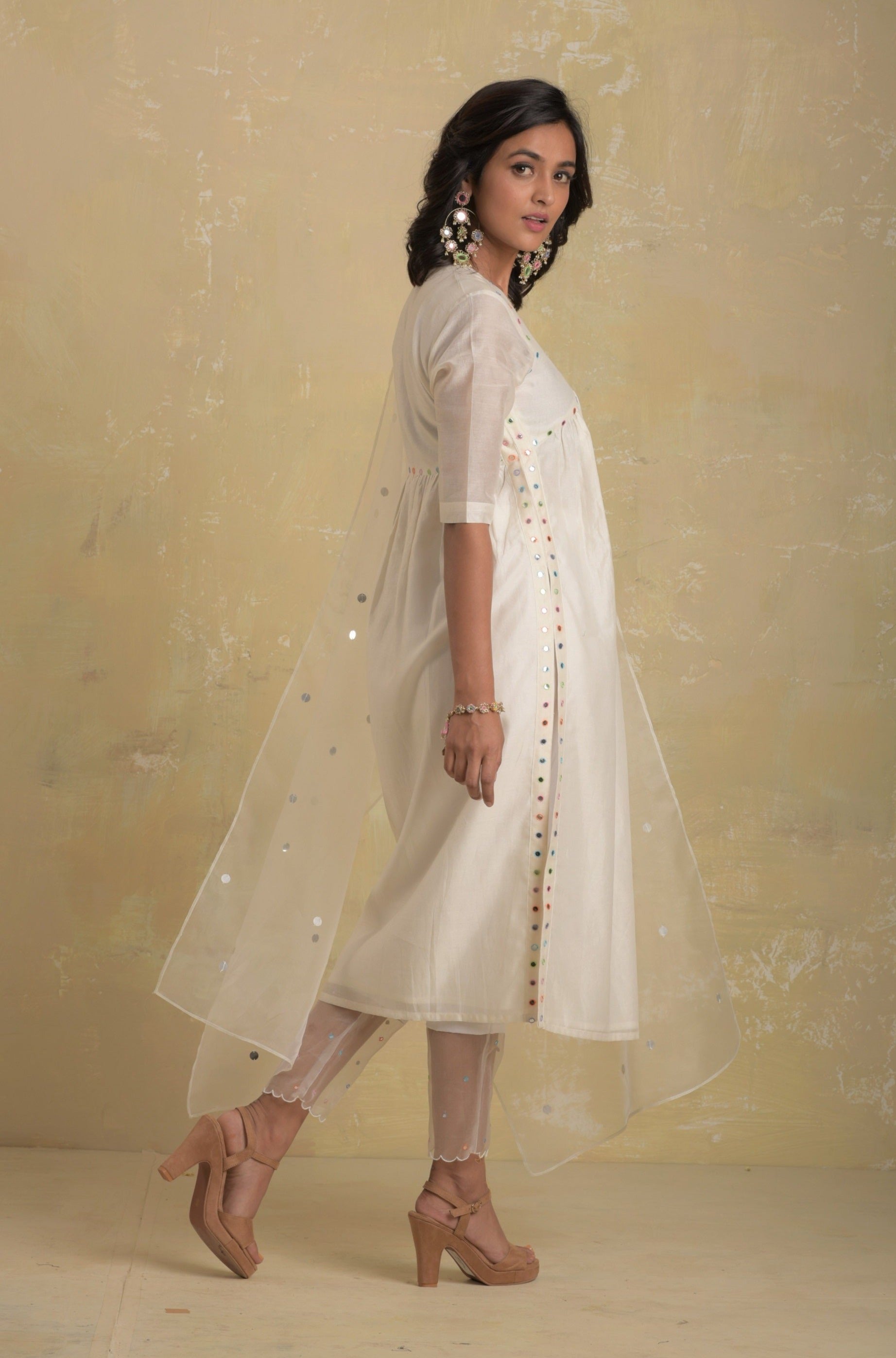 Chanderi Chanderi kurta with colored embroidery, embedded with mirrors on yoke and side slits. This kurta is paired with straight organza panel pants & sheer organza dupatta embellished with silver sequins.