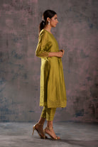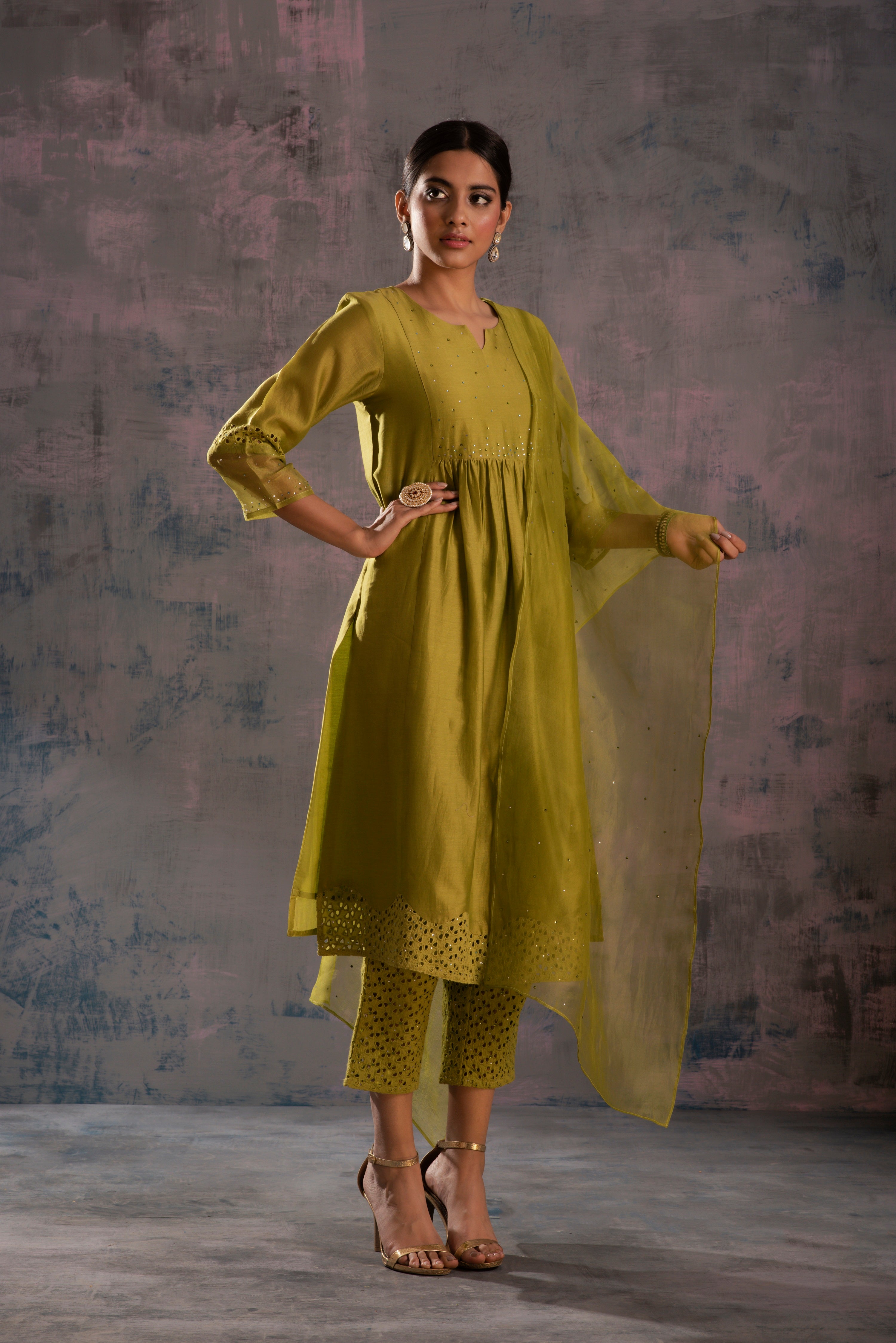 Chanderi berry green kurta with swarovski work on yoke & sleeves. This front gathered kurta is paired with straight cutwork pants studded with swarovski and organza dupatta embellished with swarovski.