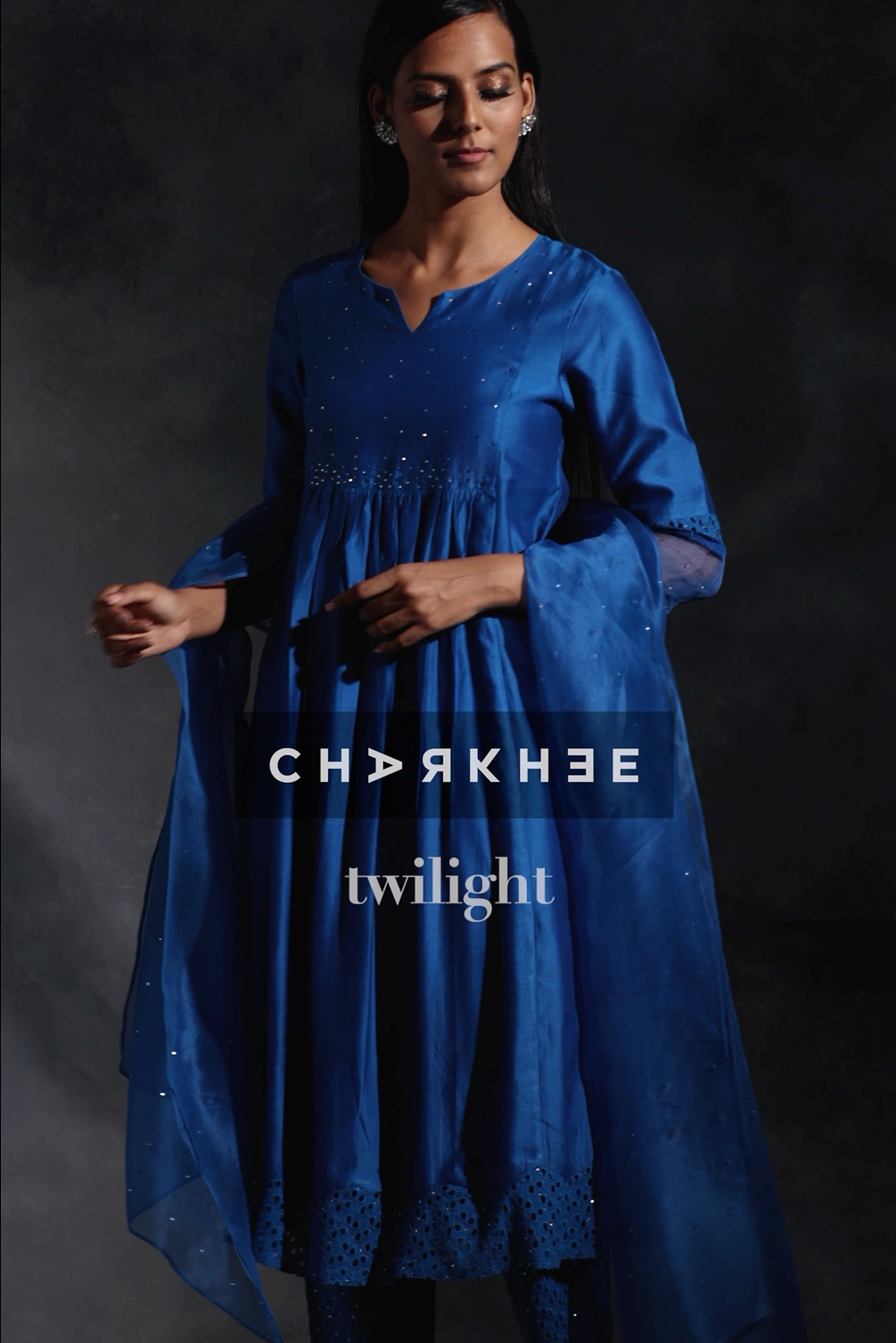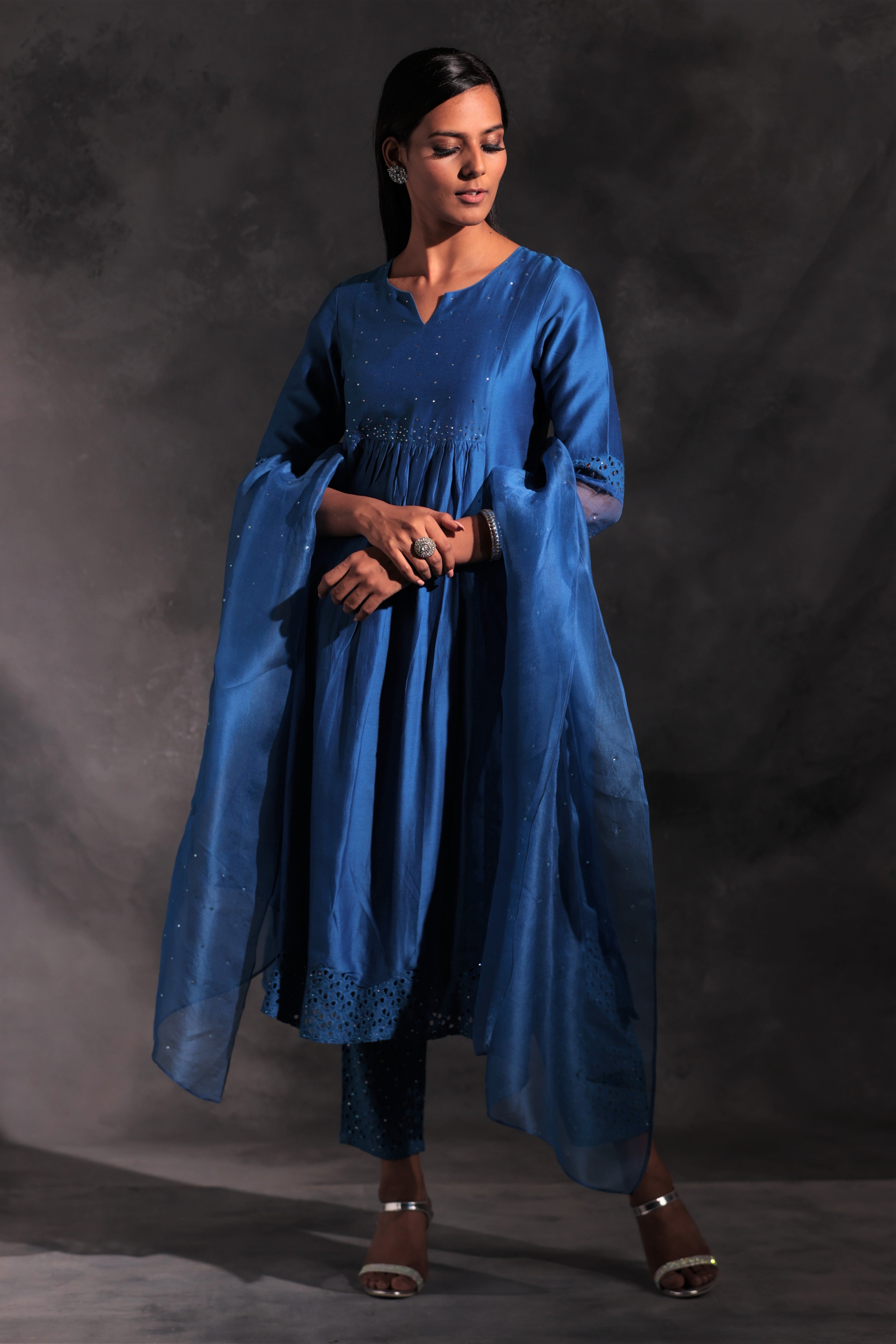 Chanderi egyptian blue kurta with swarovski work on yoke & sleeves. This front gathered kurta is paired with straight cutwork pants studded with swarovski and organza dupatta embellished with swarovski.