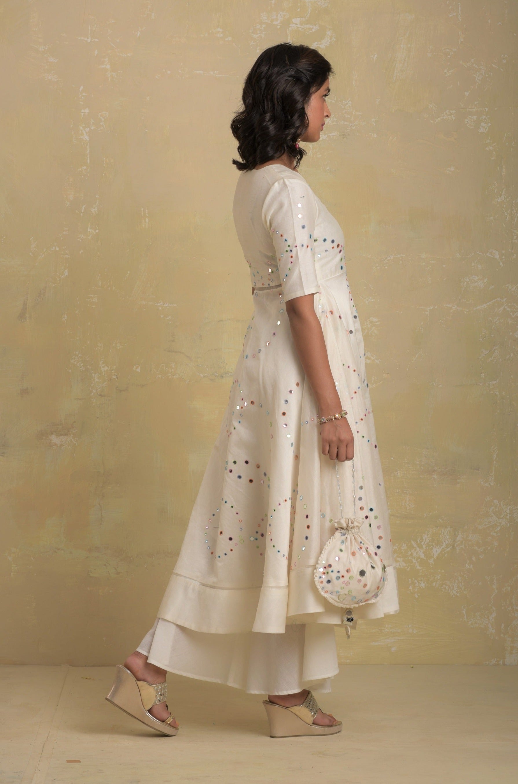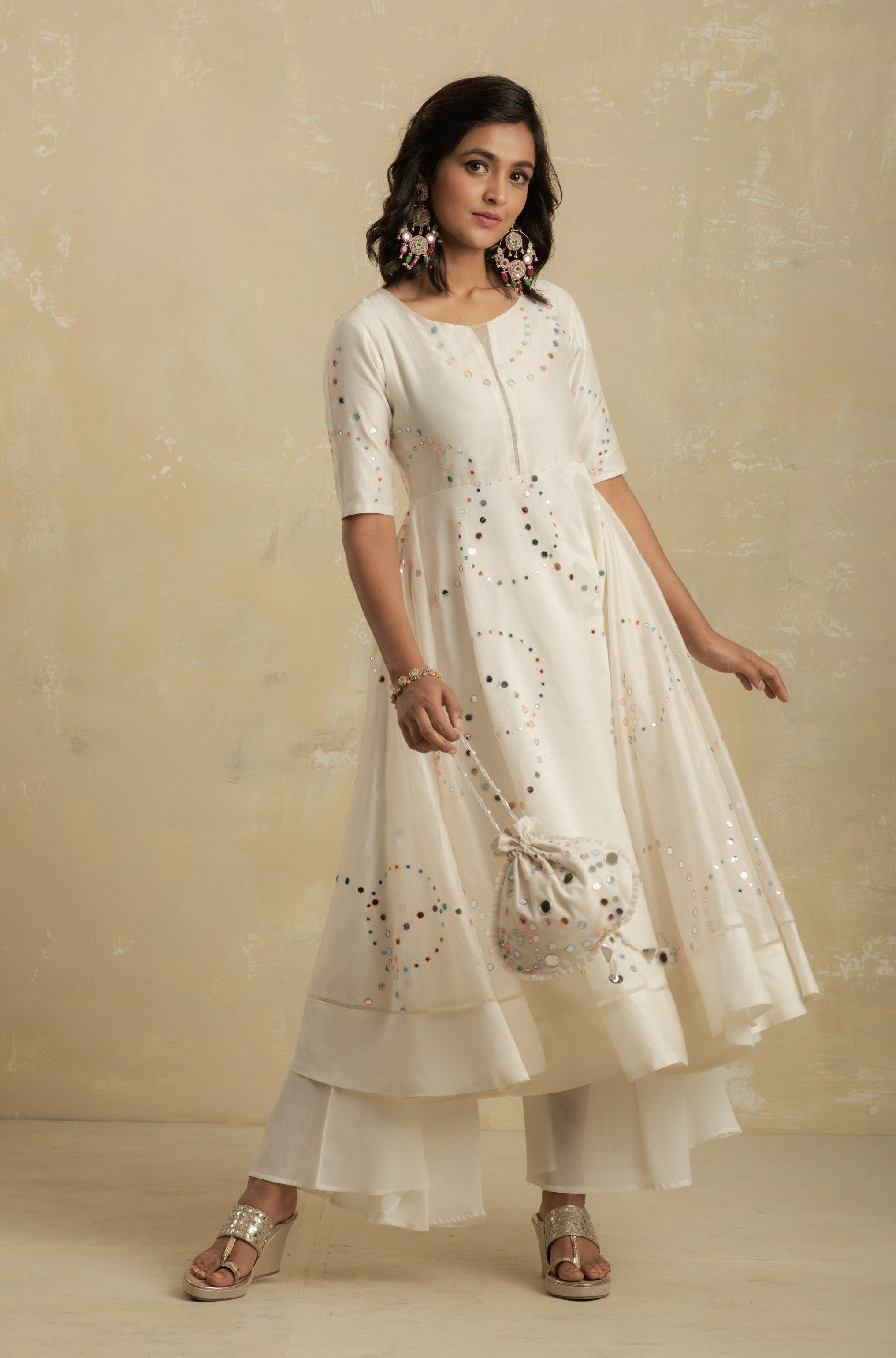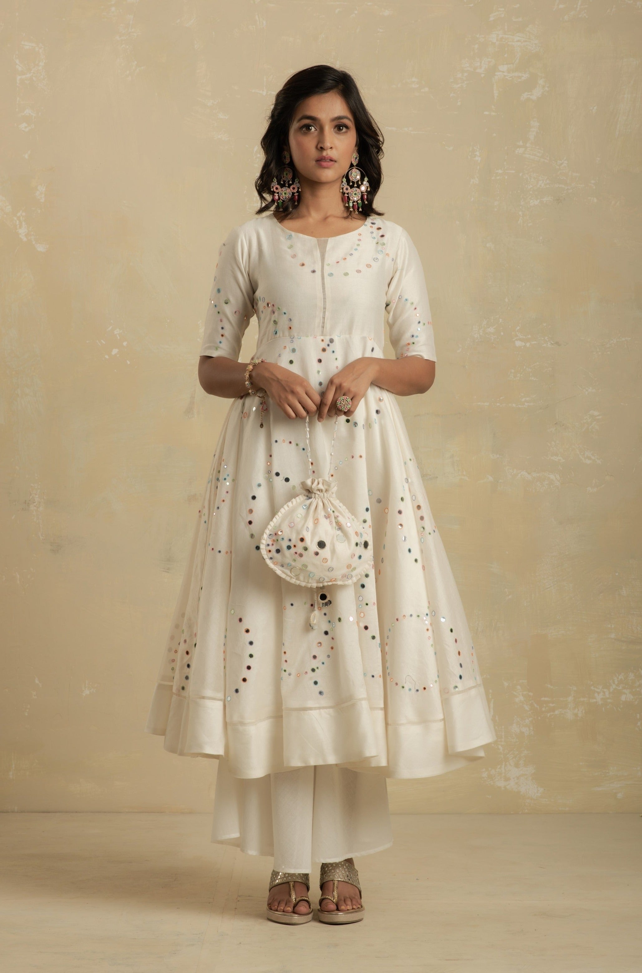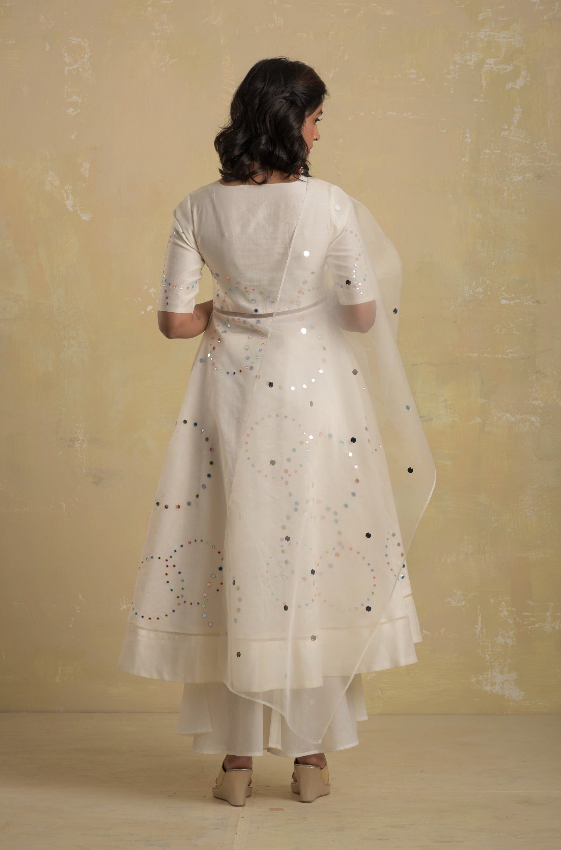 Chanderi flared anarkali with sheer organza detailing on front and back, has beautiful colored embroidery with both foil and real mirrors. This uneven flared anarkali is paired with flared palazzo and organza dupatta embellished with silver sequins.