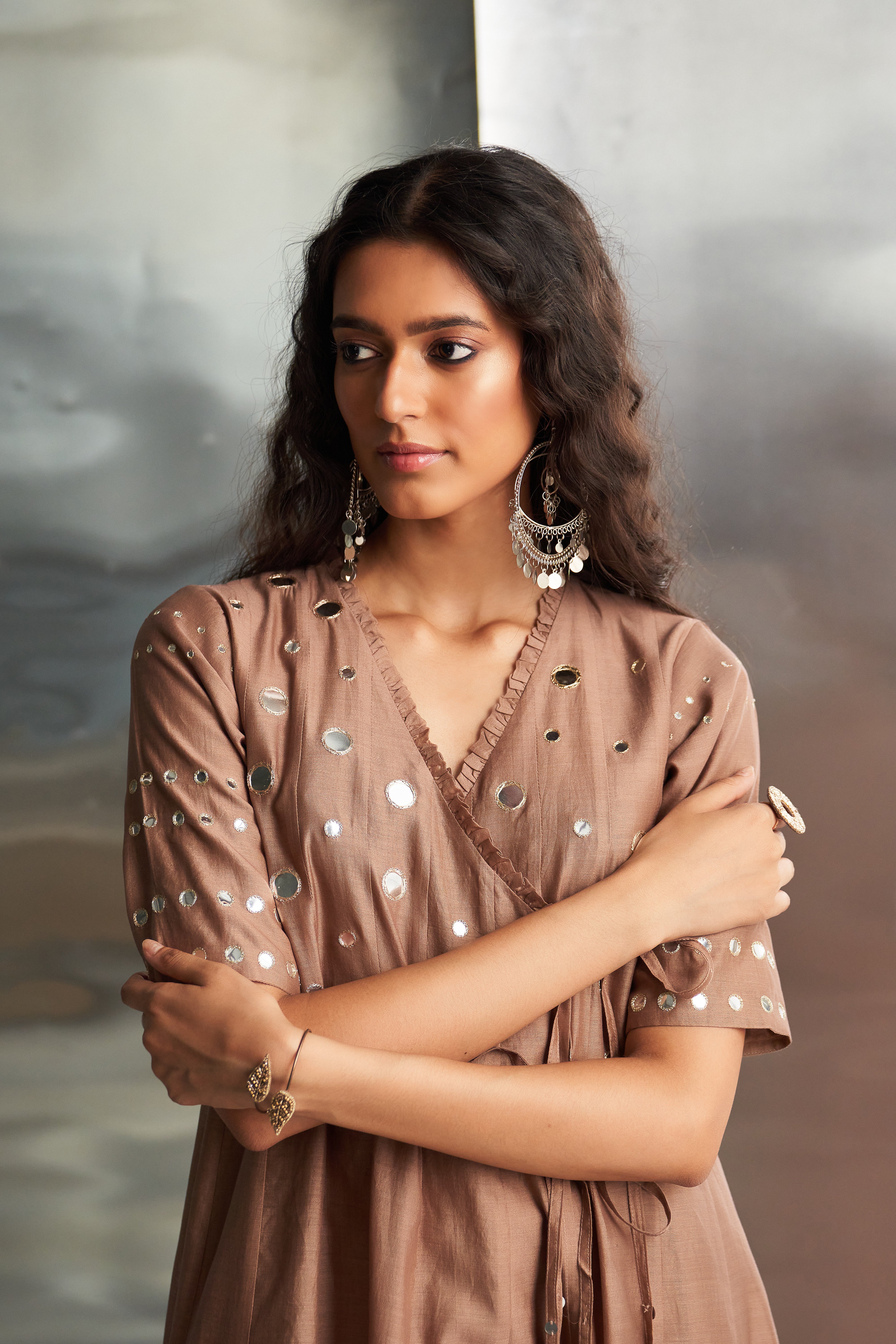 Chanderi angrakha wrap-around anarkali in a vibrant ginger hue features intricate mirror work on the sleeves and charming mirror tassels.