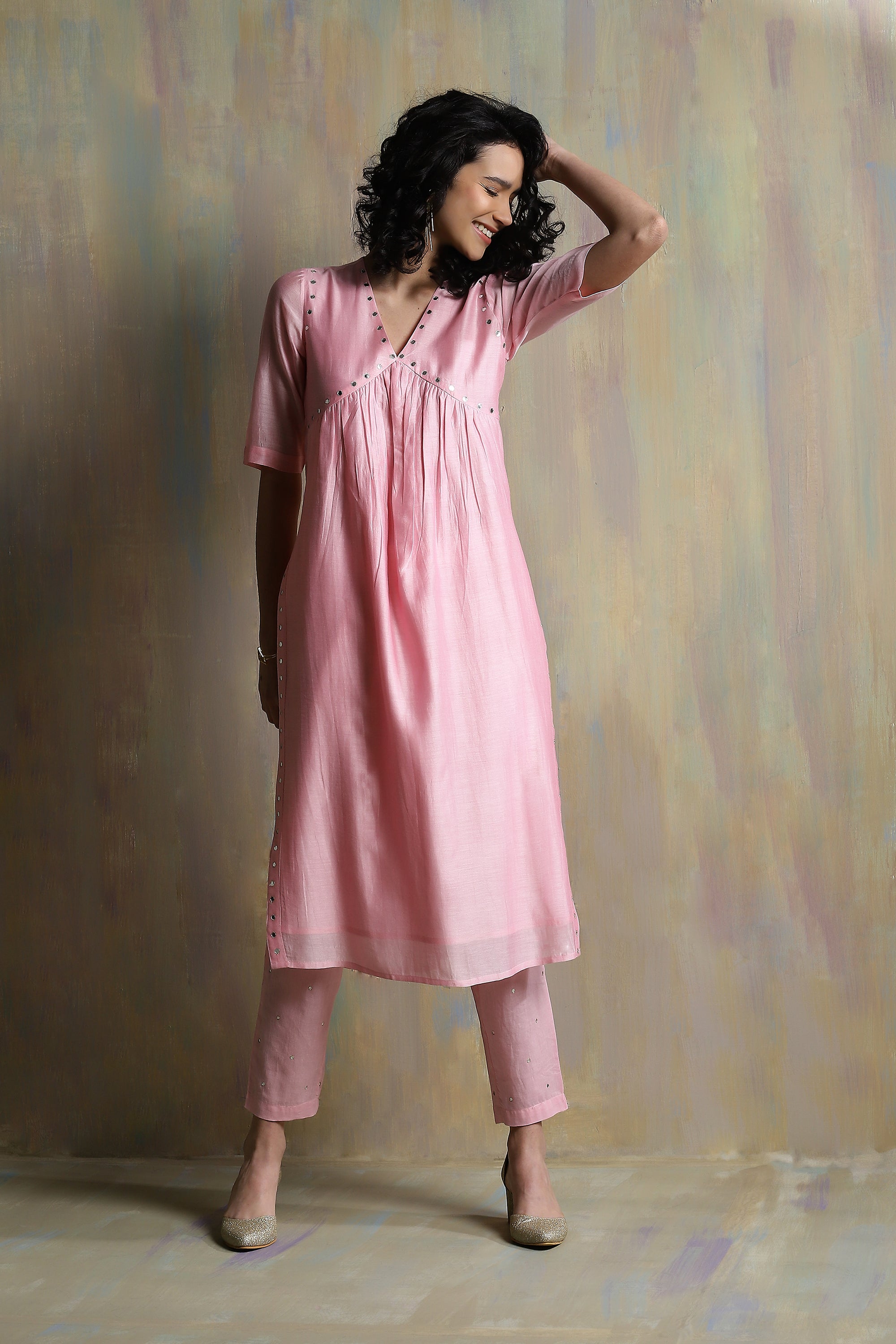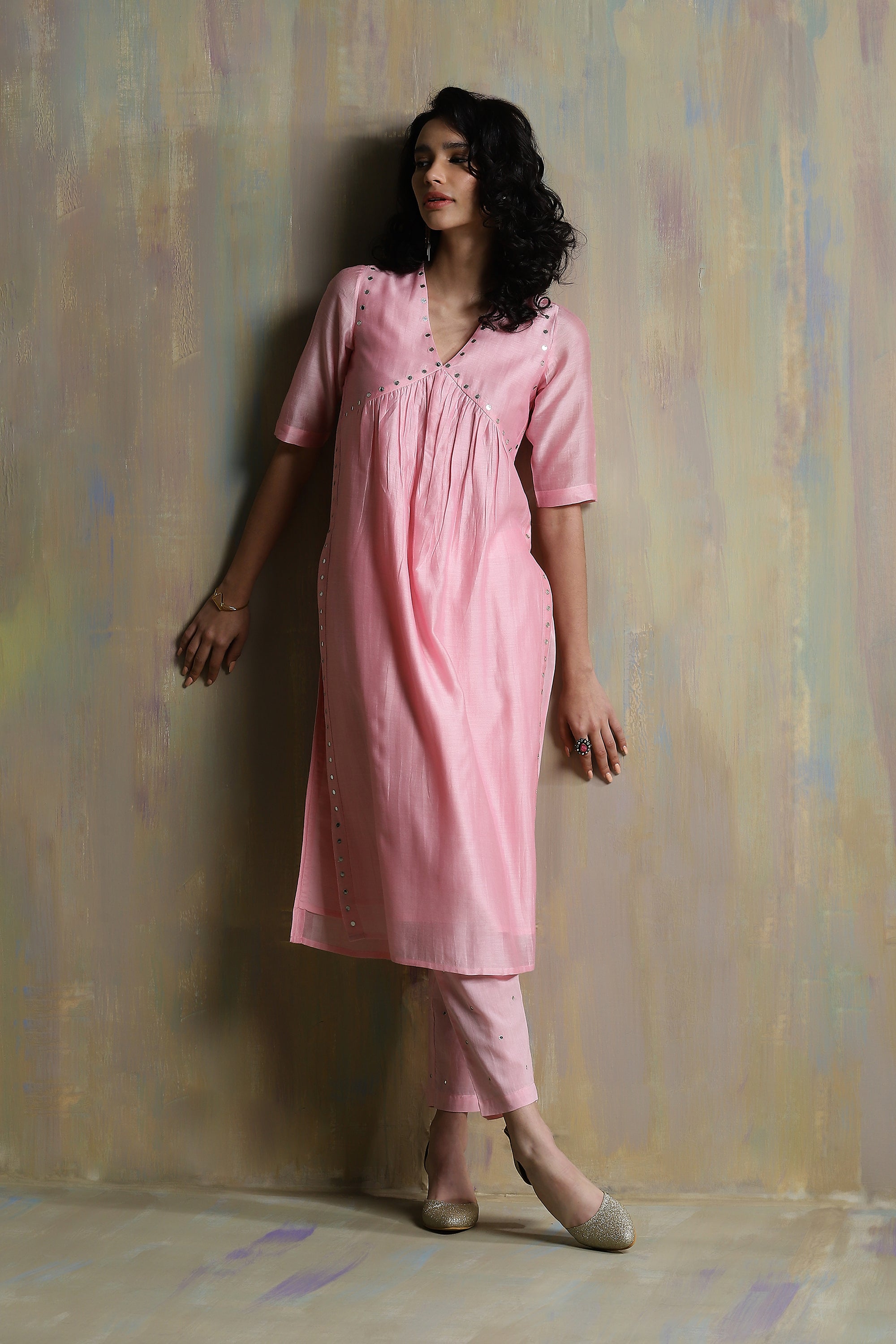 Chanderi kurta with embroidery, embedded with mirrors on yoke and side slits. This kurta is paired with straight pants & dupatta embellished with mirrors on its border.