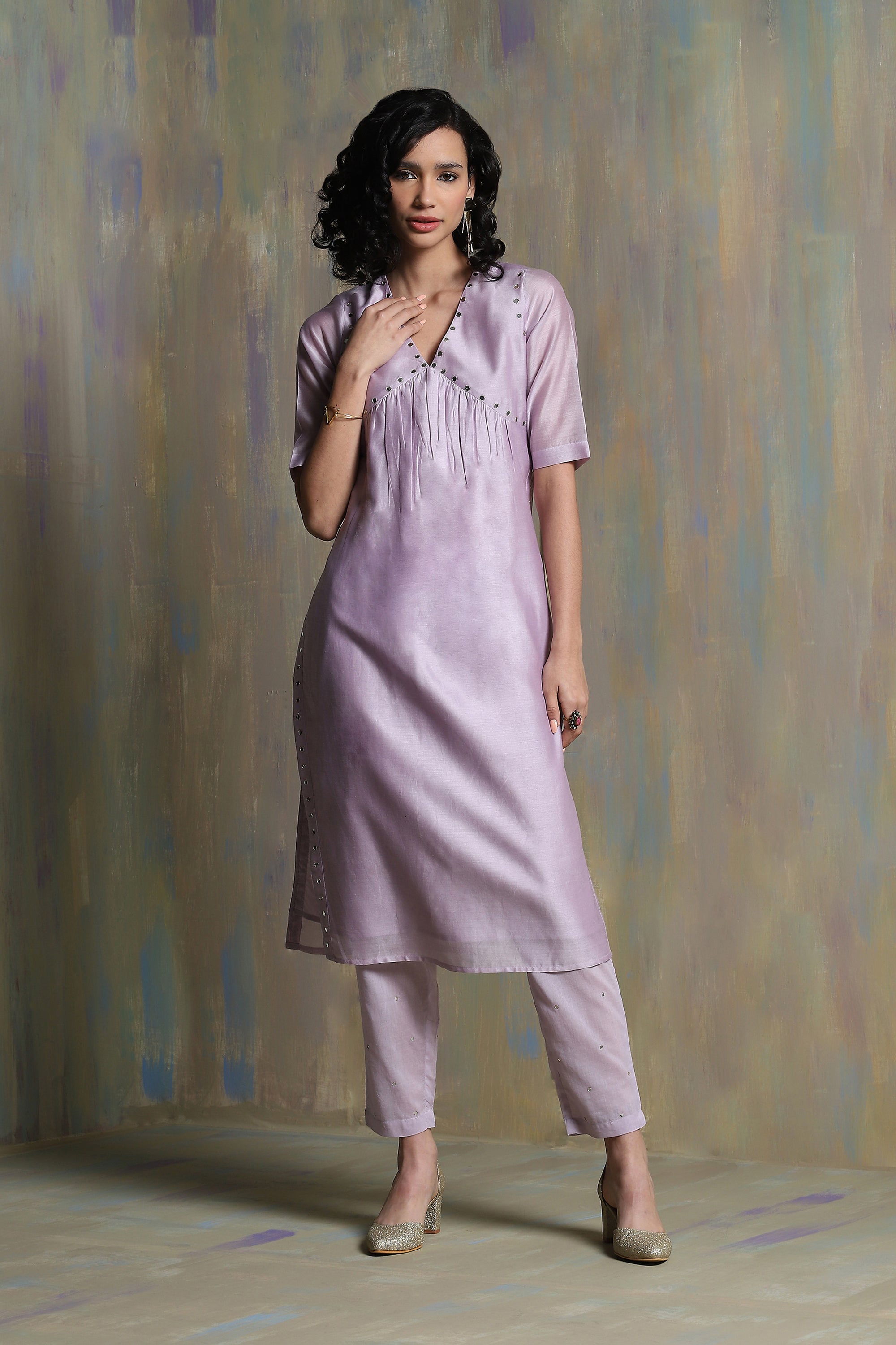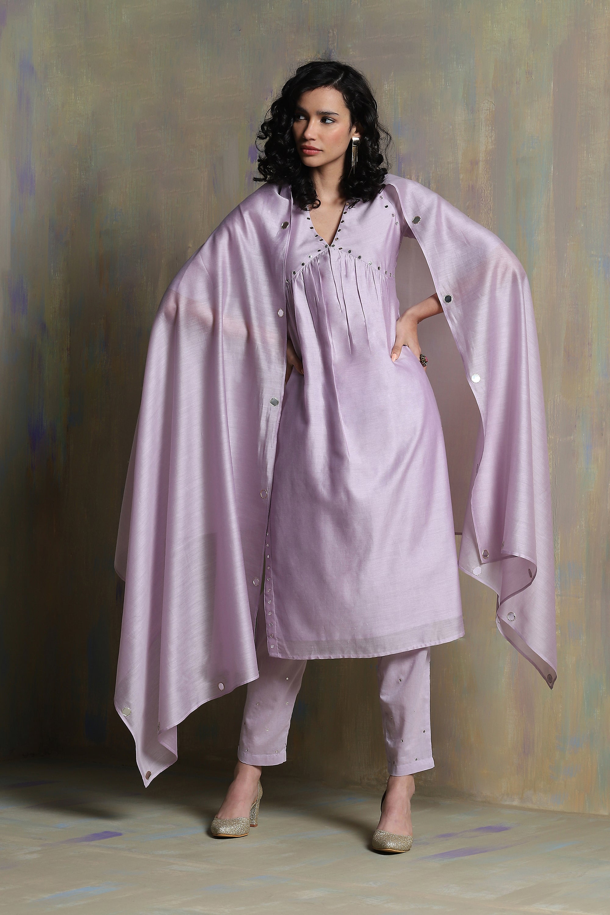 Chanderi kurta with embroidery, embedded with mirrors on yoke and side slits. This kurta is paired with straight pants & dupatta embellished with mirrors on its border.