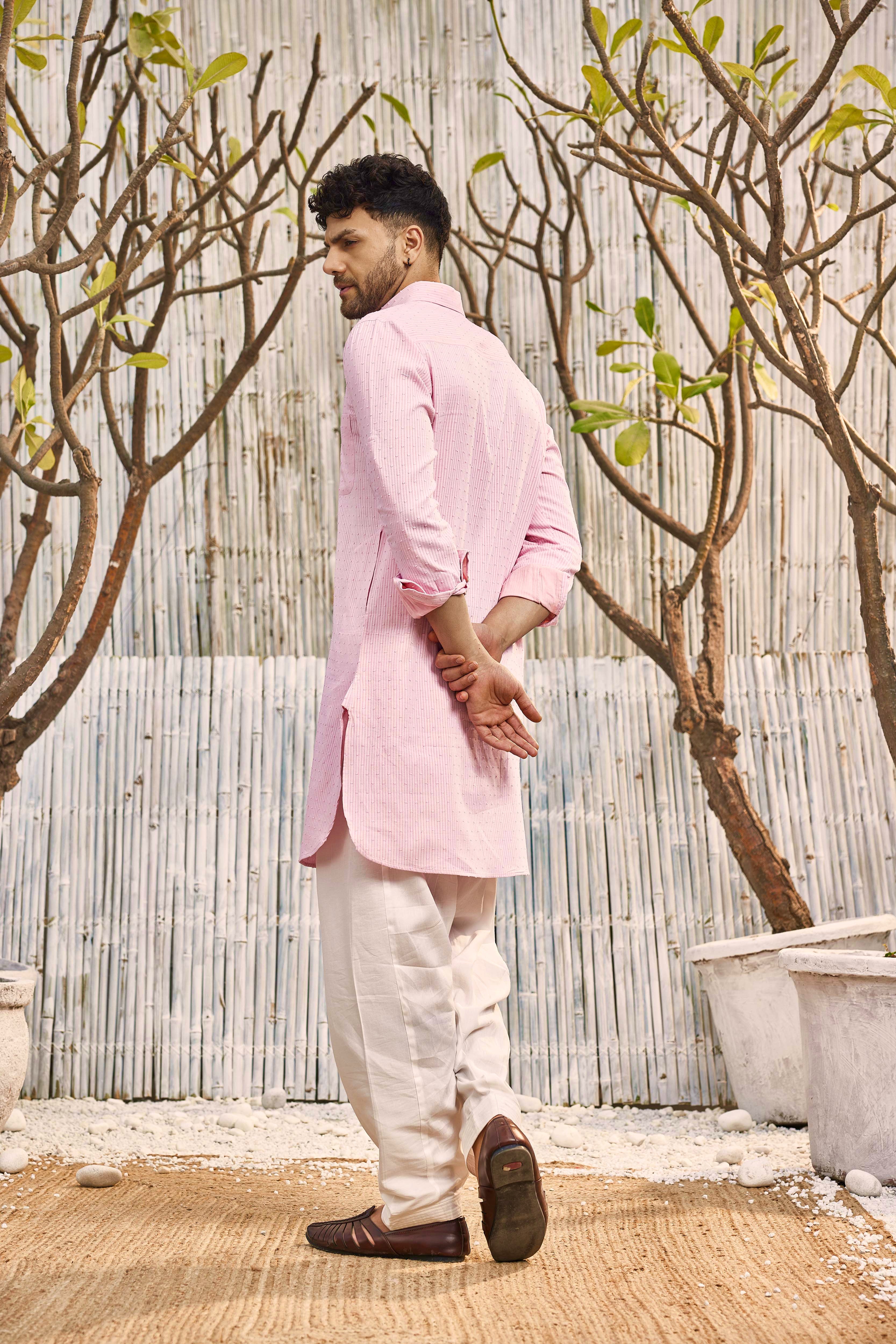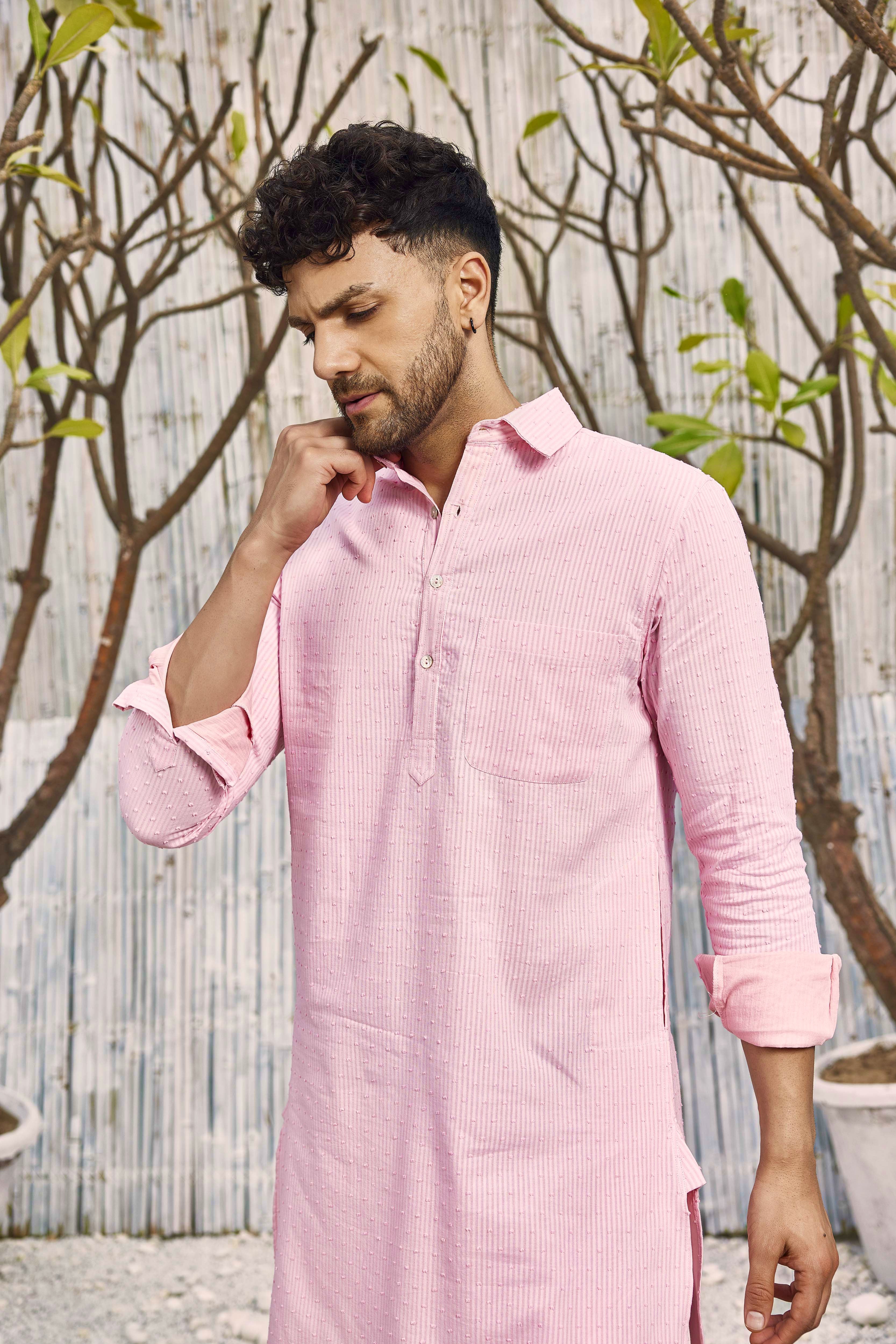 Our classic pathani in pink textured cotton. It features, classic shirt collar, foldable sleeve, side pockets & a round shape bottom. Kurta is paired with salwar.