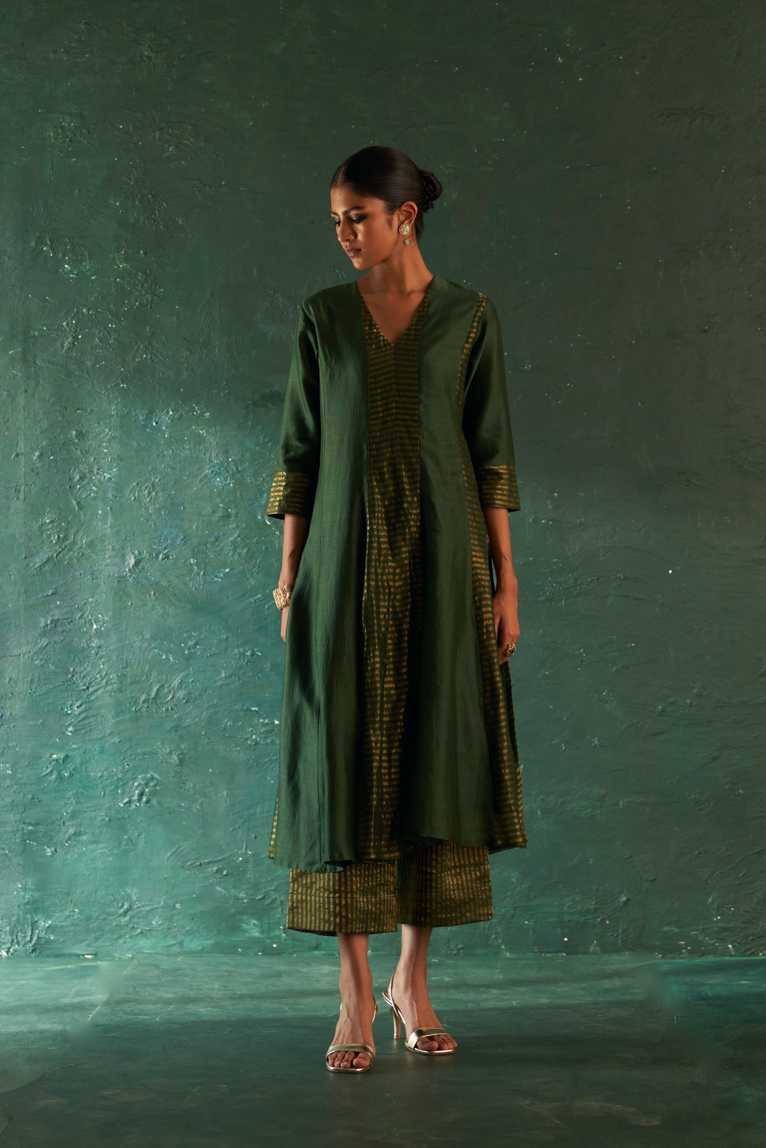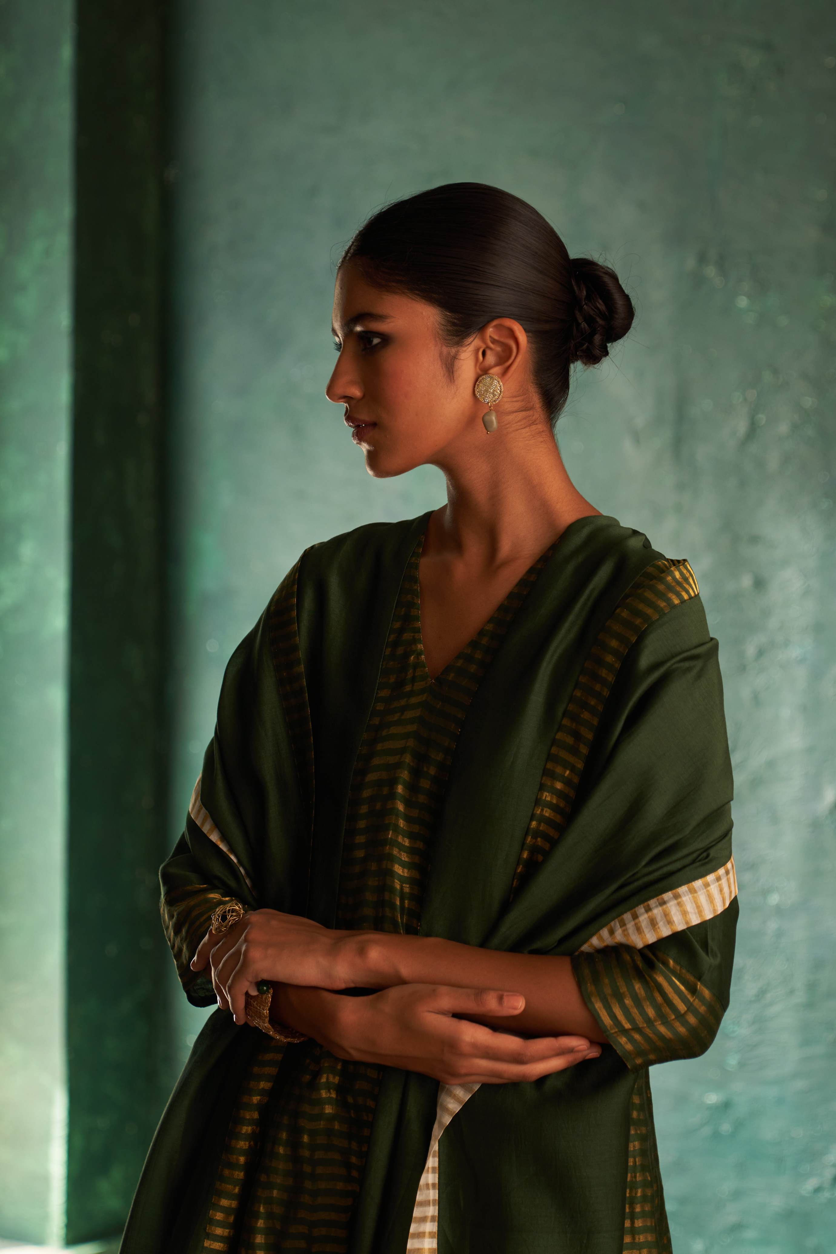 Crafted with a mix of solid and striped sections made from chanderi and tissue fabric, this modern anarkali kurta set offers an eye-catching outfit for special occasions. With striped panel pants and a matching dupatta, you can make a stylish statement with this designer ensemble.