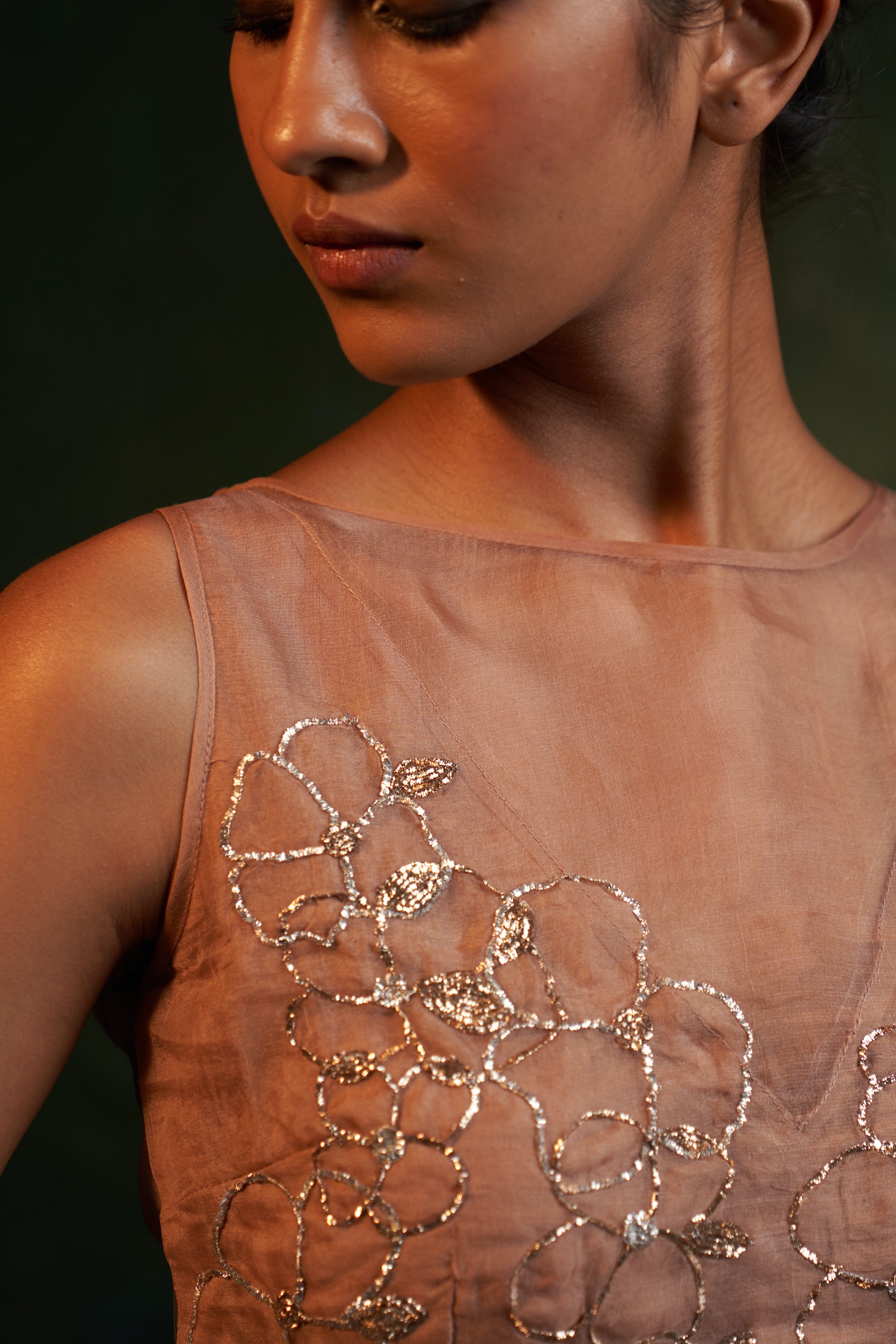 Look stunning in this hand-embroidered Midas Ginger Organza Lehenga. The light fawn color and delicate organza make it perfect for understated glam. This ensemble features gleaming embroidery with handcrafted floral tassels, an abstract embroidered sleeveless blouse with a sheer organza back, and an organza dupatta with an embroidered border. Strike a balance between minimalism and extravagance with this beautiful set.