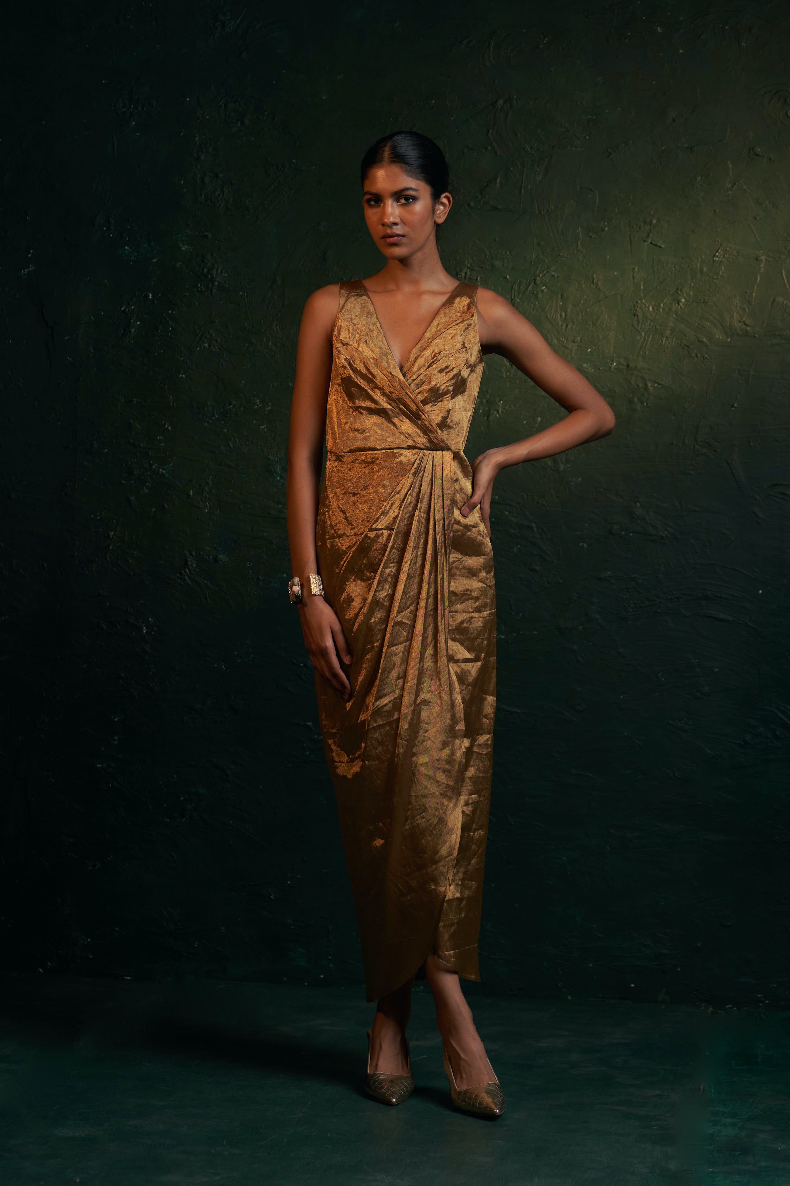 Must have is this gold tissue drape dress, simple yet chique that makes the heads turn while you walk like a diva in gold. The simple sophistication of this dress will give it an enduring grace in your wardrobe. Style it with our gota potli shimmer bag or our twisted knot Neckpiece to enhance your look. This dress is perfect for a cocktail or any other formal event.