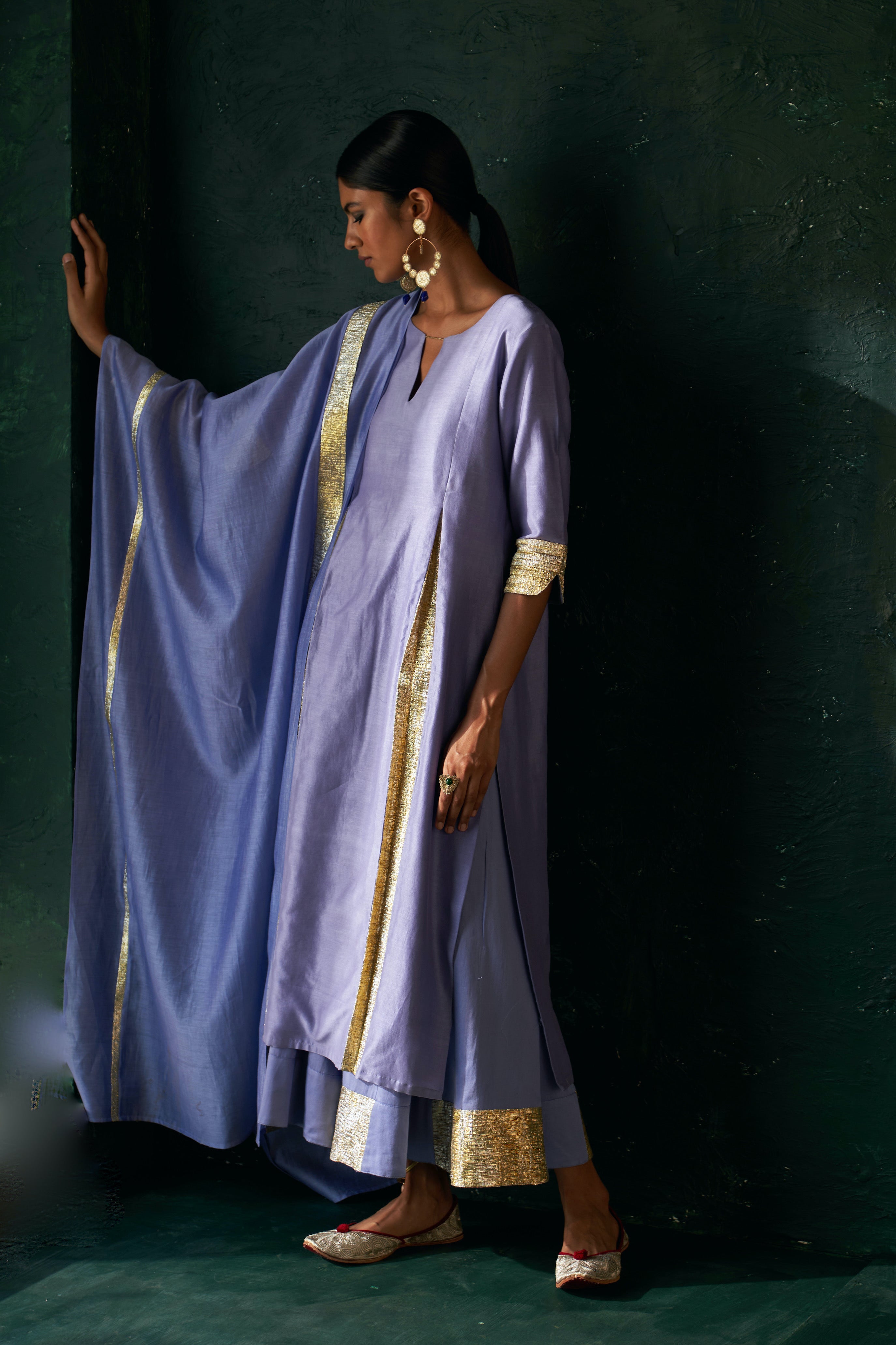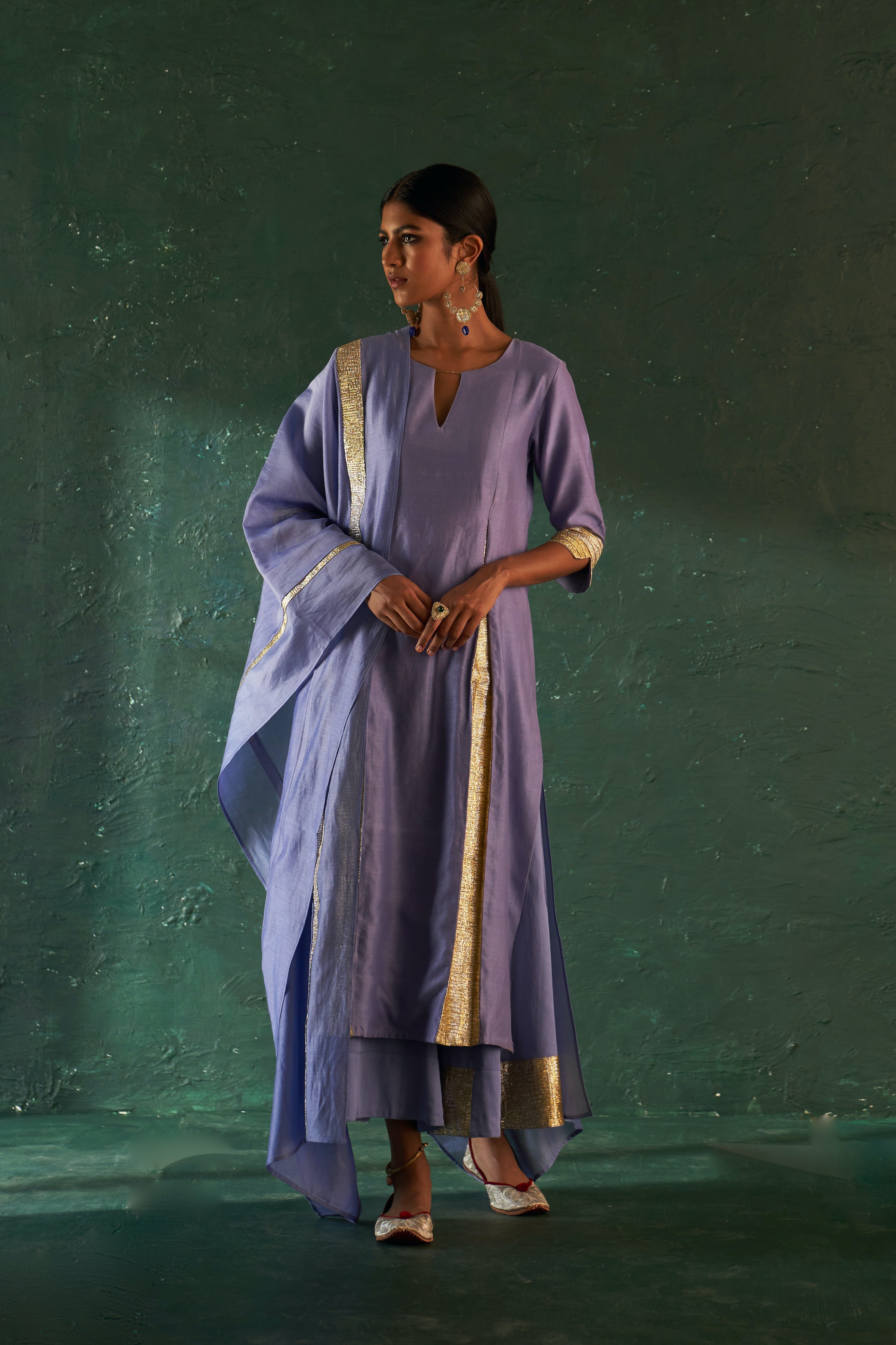 A chanderi kurta set in decadent lavender colour embellished with beautiful crinkled gota in front and back. Paired with gota embellished pants and dupatta, this designer ensemble is ideal for your festive celebrations.