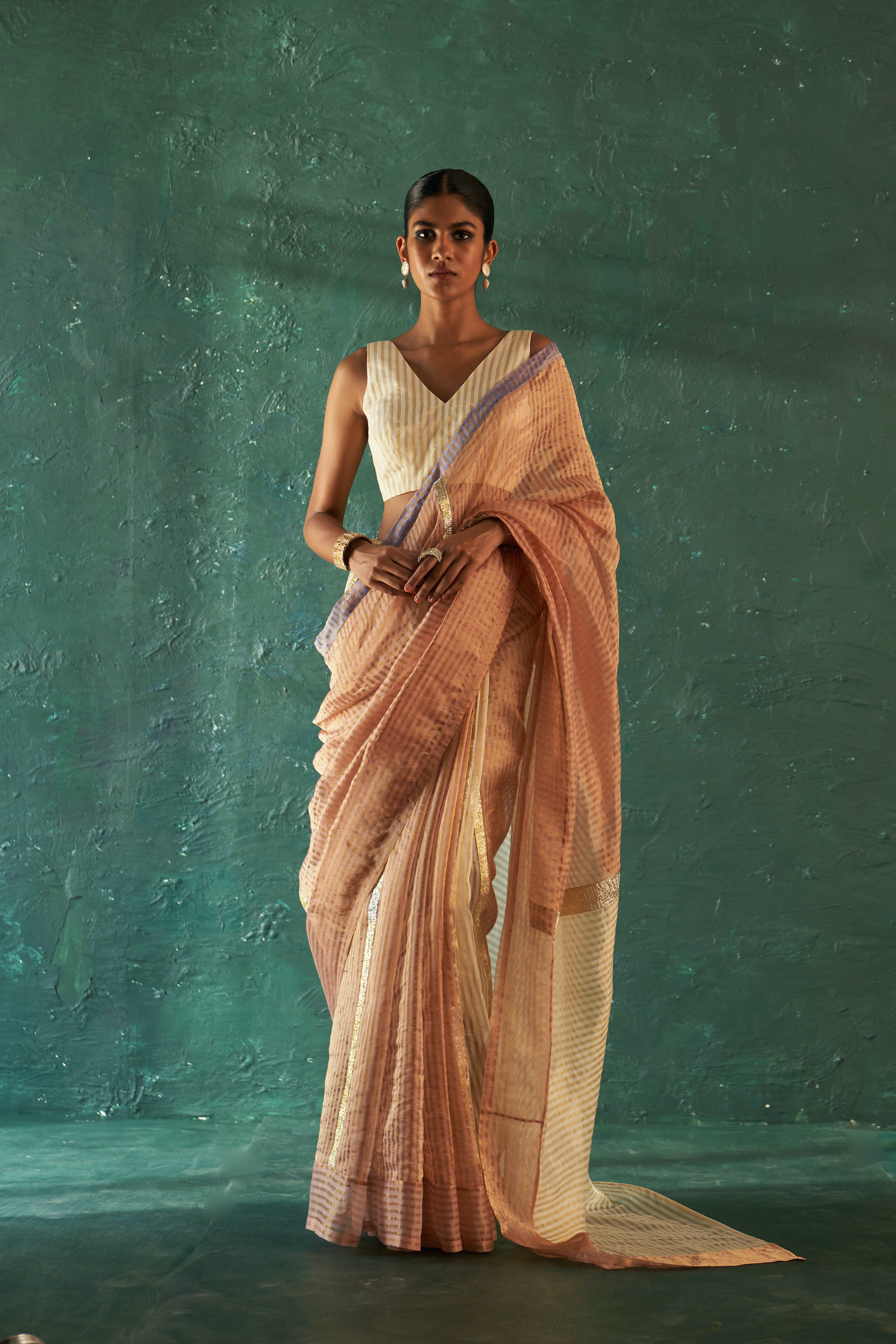 A colour mix gota infused striped saree with a contrasting border, paired with a striped tissue sleeveless blouse, perfect for any daytime event. Drape it the classic way or style it up as per the occasion. Add shimmer to your eyes along with any of our handcrafted jewellery pieces to glam up.