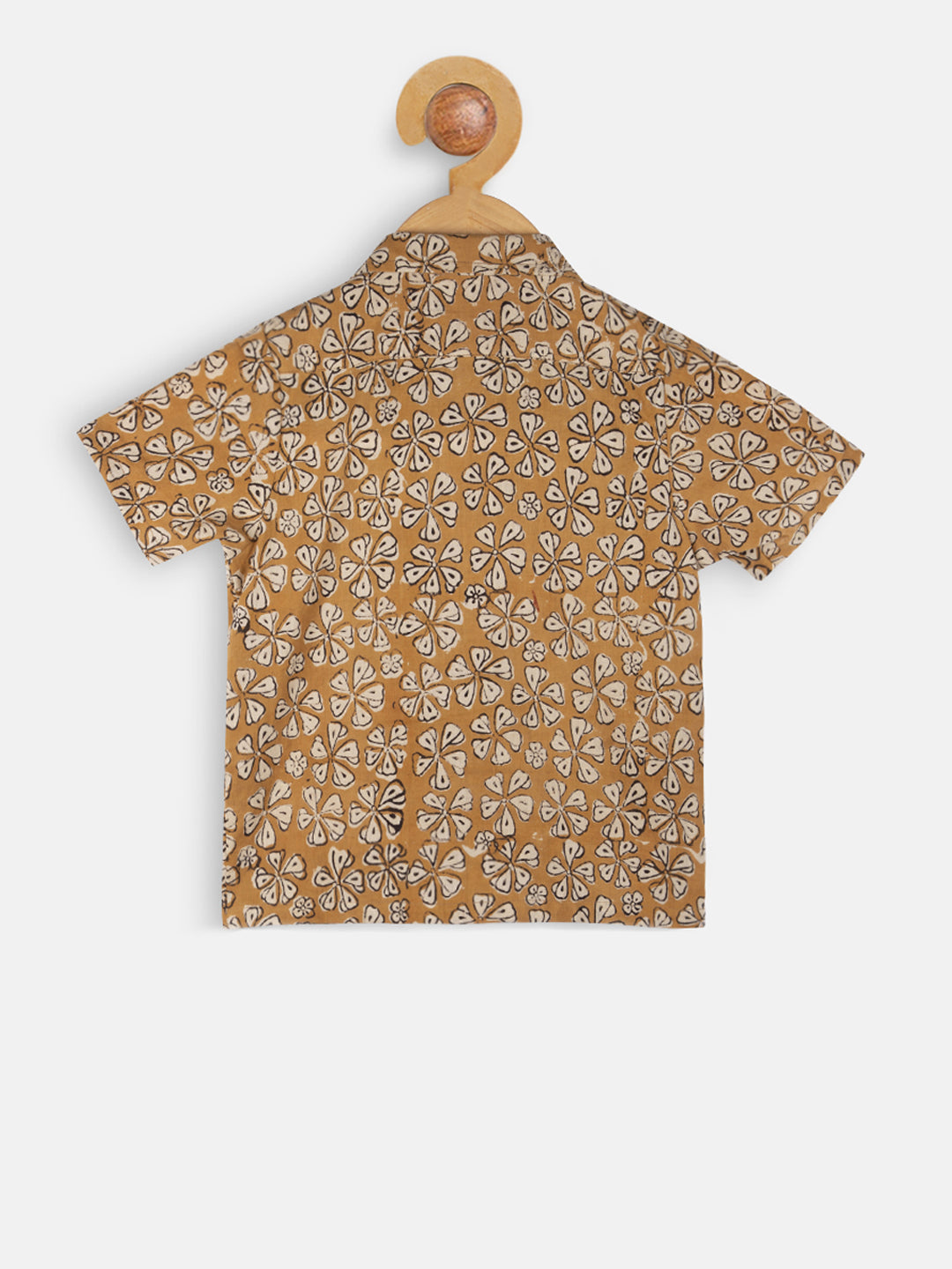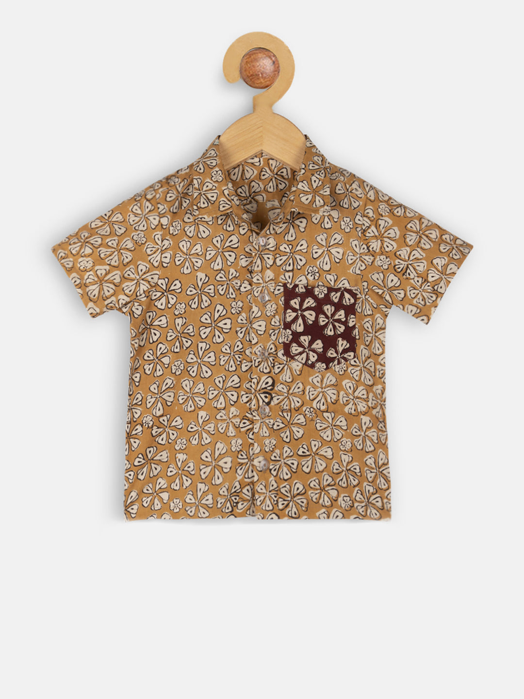 Mustard and off white printed shirt, has a spread collar, button placket, short sleeves, a chest pocket