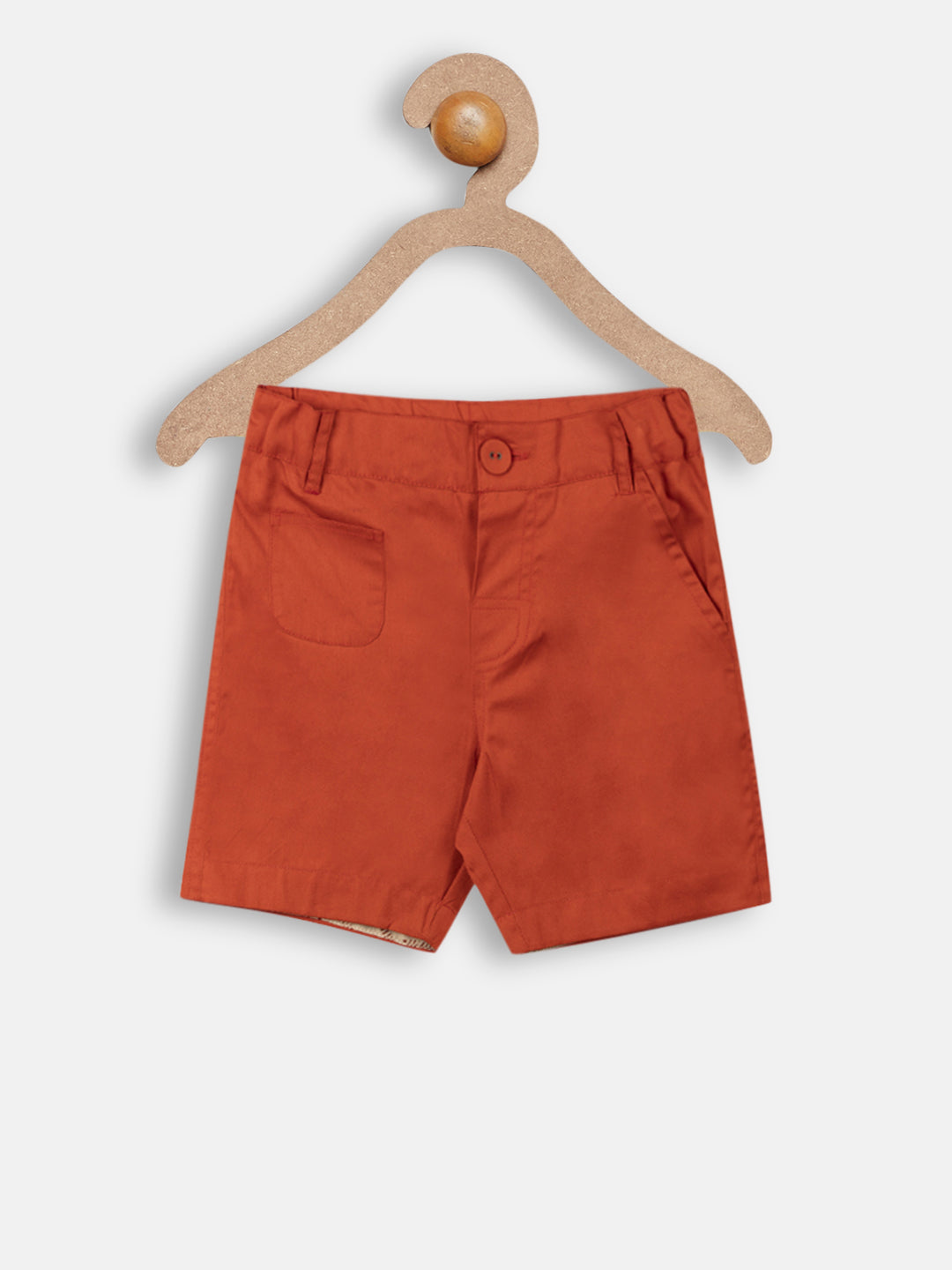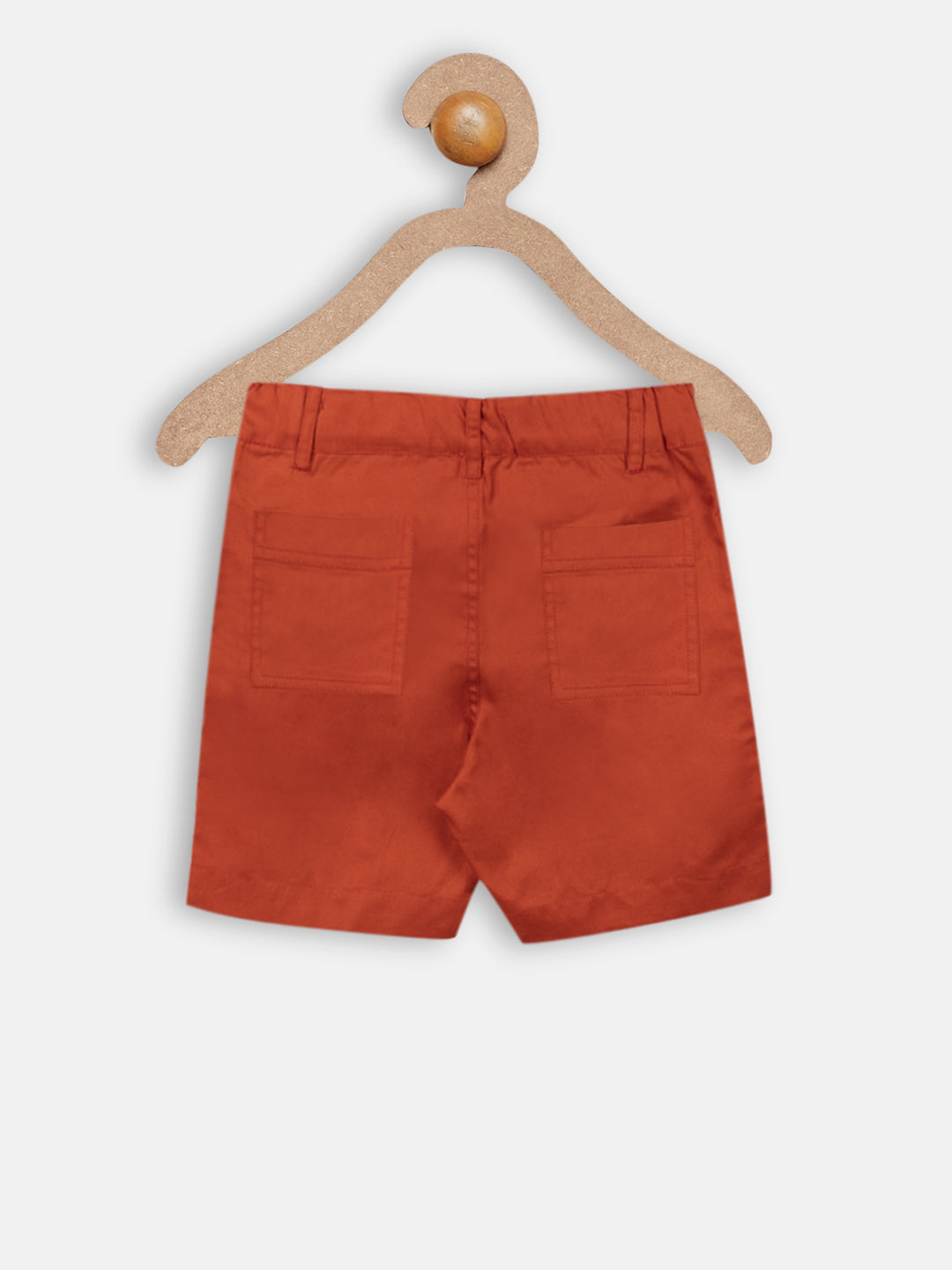 A pair of orange shorts, a fly with button closure,partially elasticated waistband with belt loops