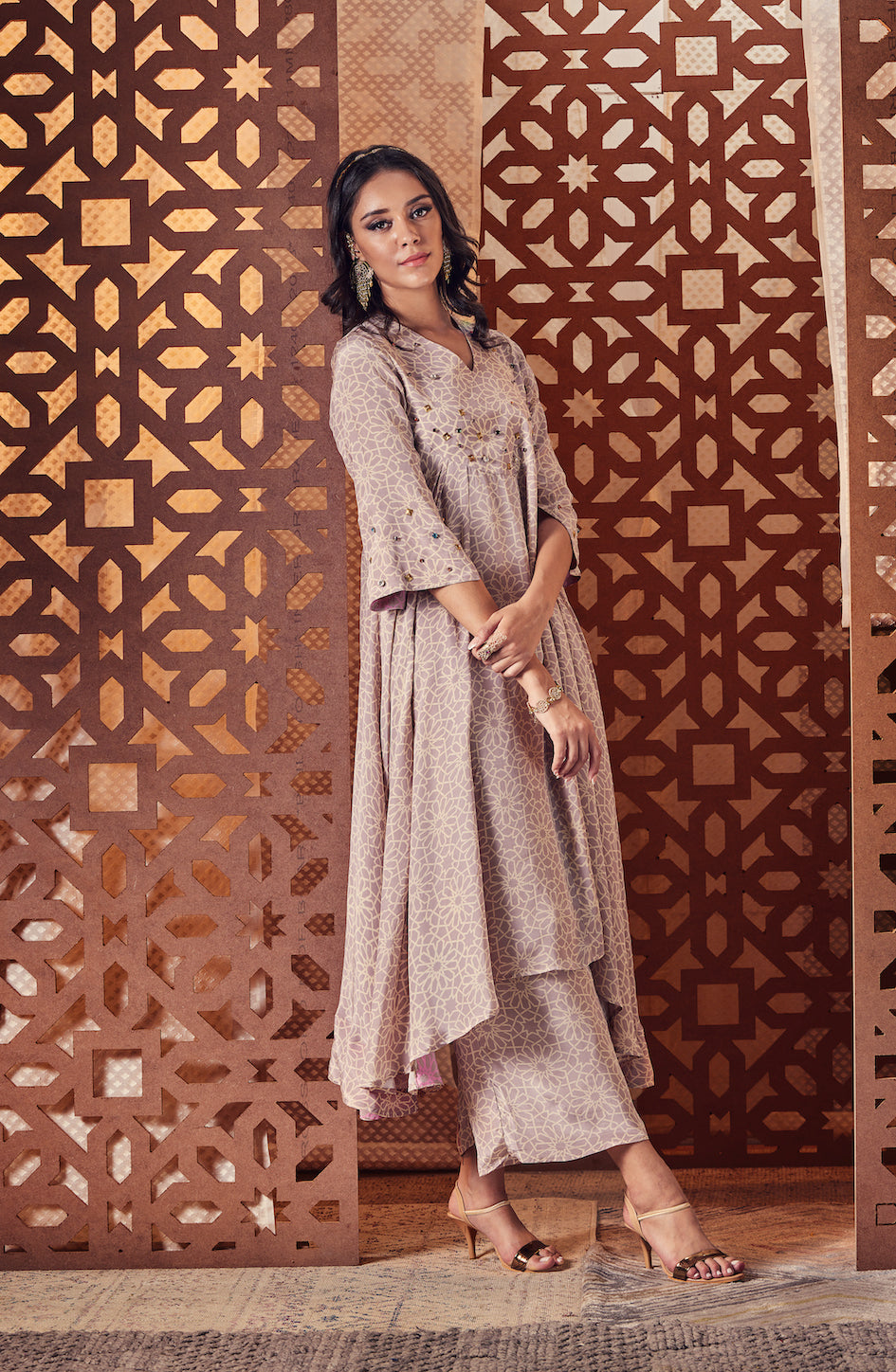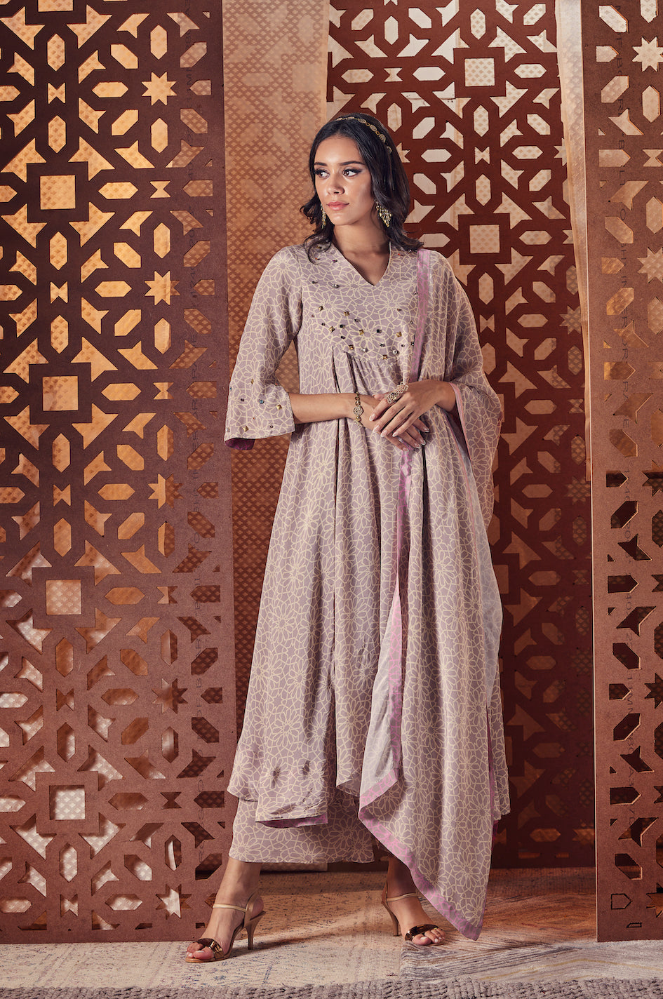 With a soft sheen, this bespoke printed crepe anarkali set in a subtle palette is sure to make you look like royalty with its glimmering embroidery work set in gems and studs. This kurta set with three quarter sleeves and embroidery detailing on front yoke, back yoke and sleeves along with the flowy silhouette that moves with you is sure to become one of your wardrobe treasures.