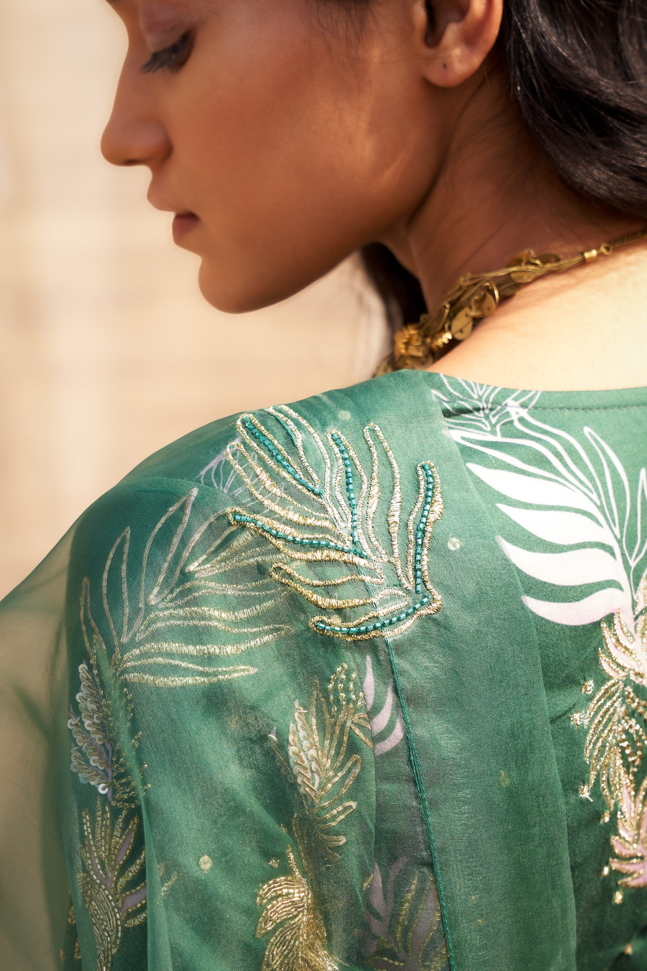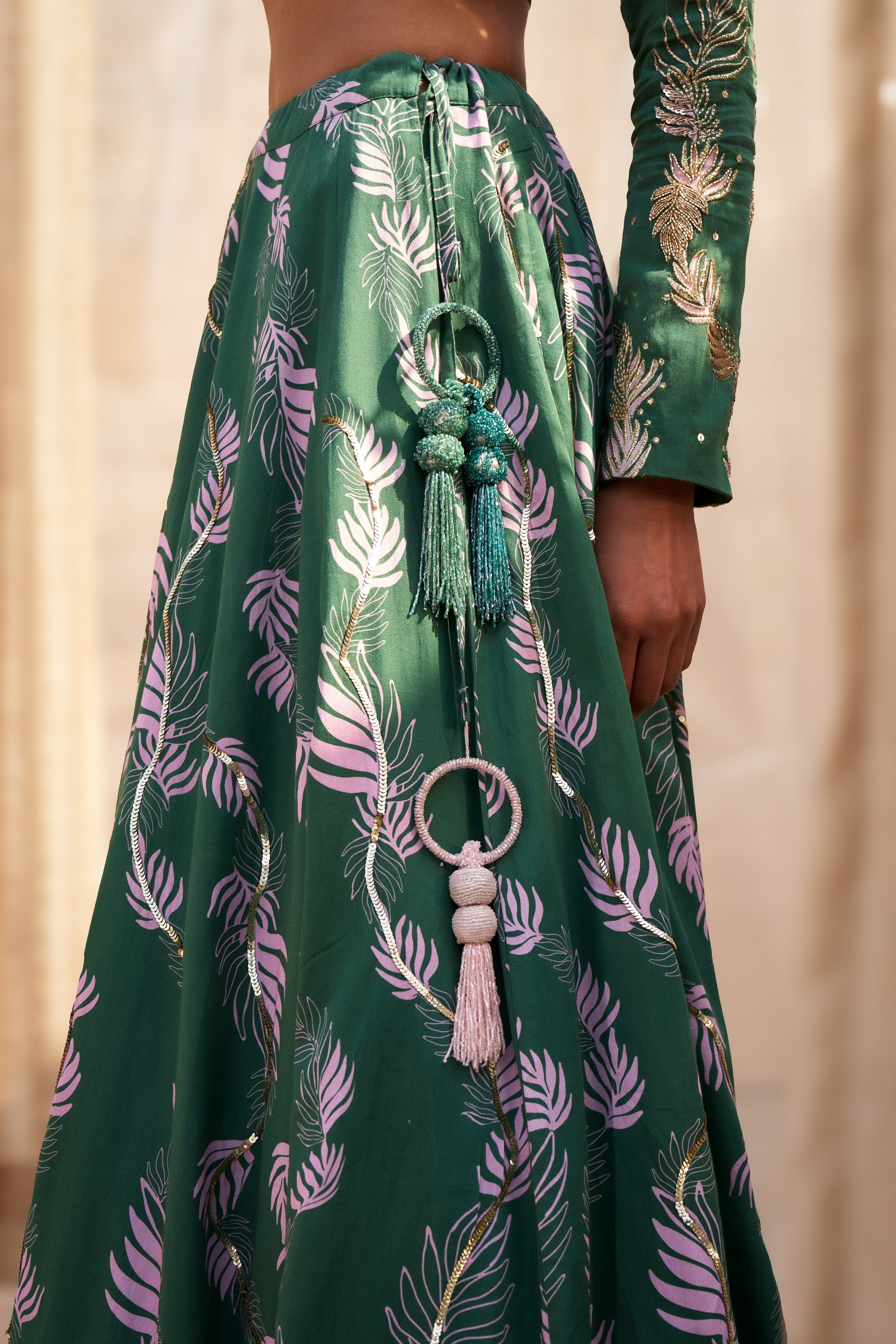 Embrace timeless elegance with this exquisite Printed Cotton Satin Lehenga in a stunning green shade adorned with delicate light pink motifs. The ensemble features a hand-embroidered blouse enriched with intricate Dabka, Zari, Cutdana, and sequins work, complete with a deep V-neckline and full sleeves with stylish long cuffs for a contemporary yet traditional look.