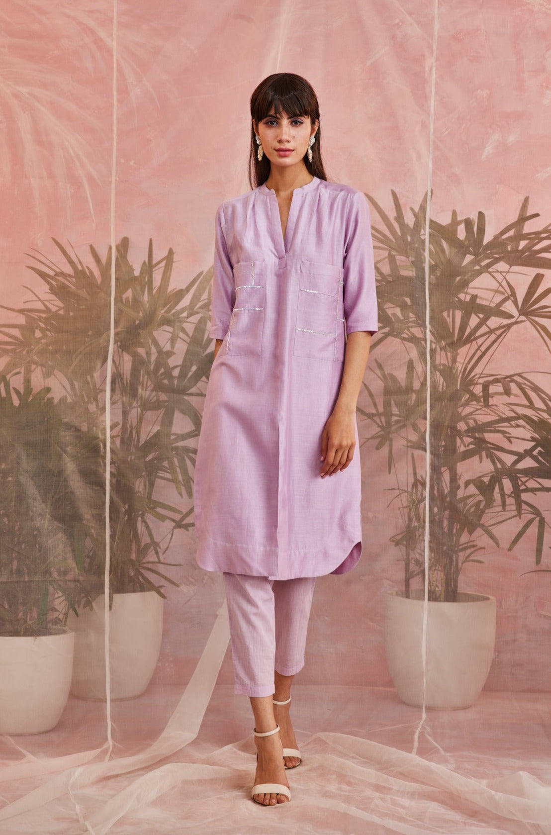 Contemporary style comfort fit straight kurta with front slit. Sequin hand work on big patch pockets in front paired with straight pants.