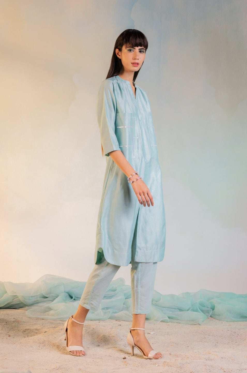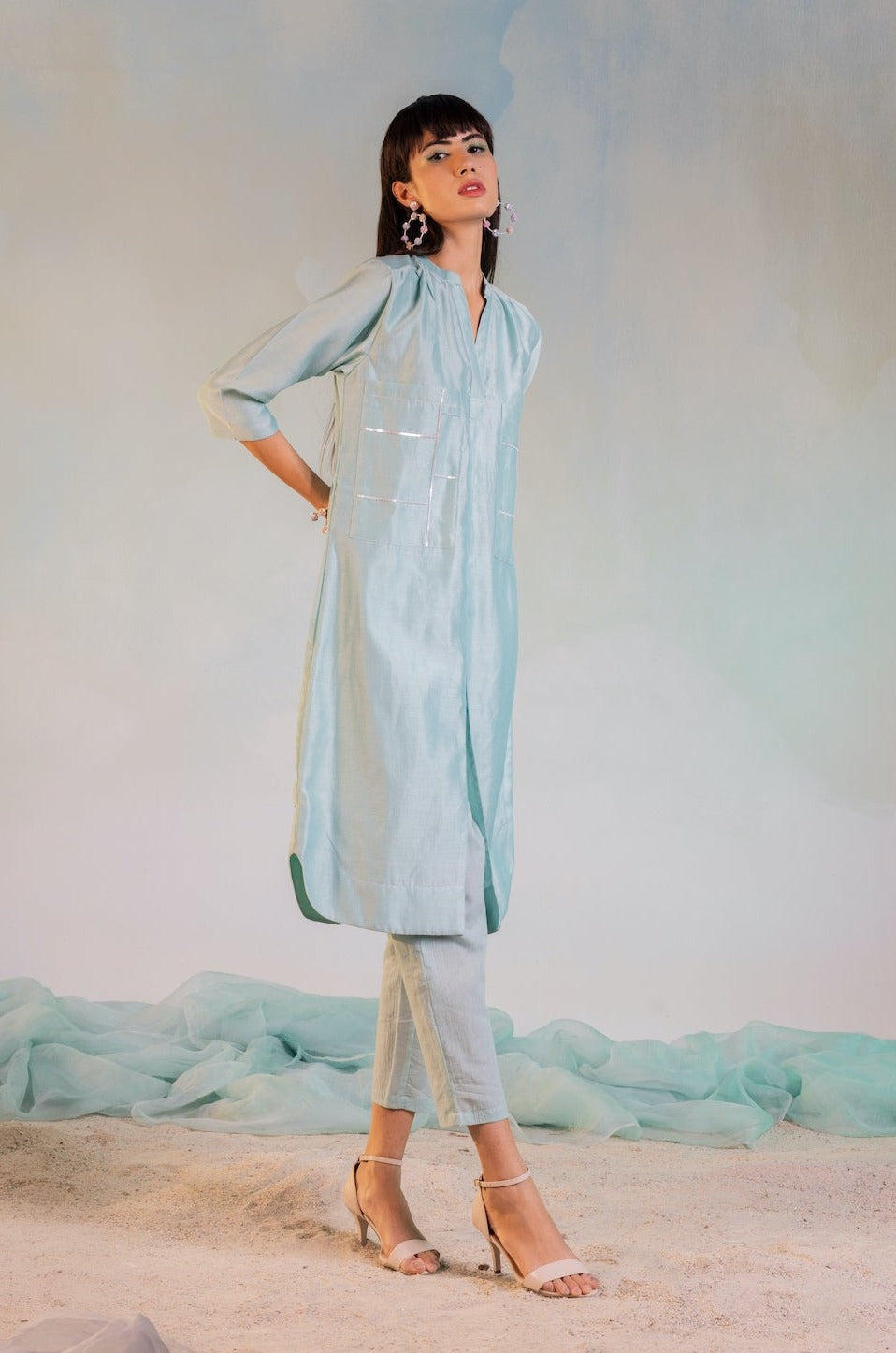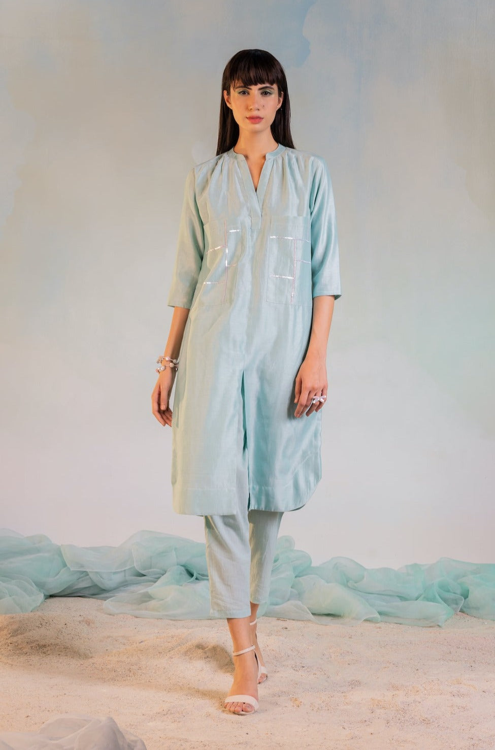 Contemporary style comfort fit straight kurta with front slit. Sequin hand work on big patch pockets in front paired with straight pants.