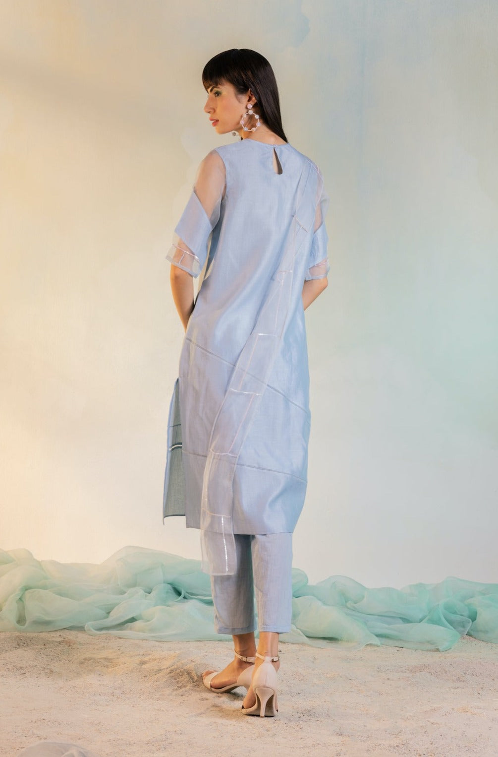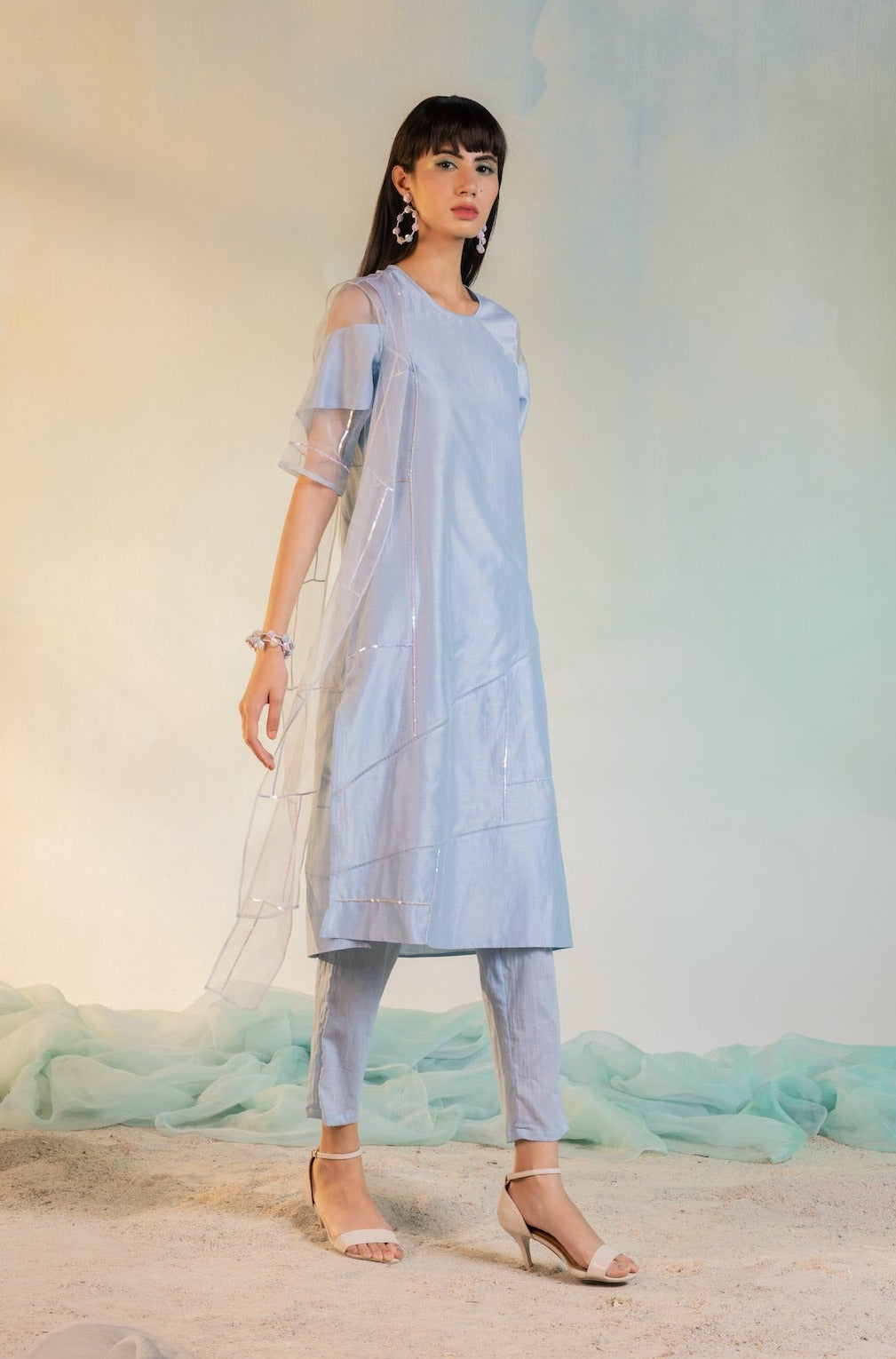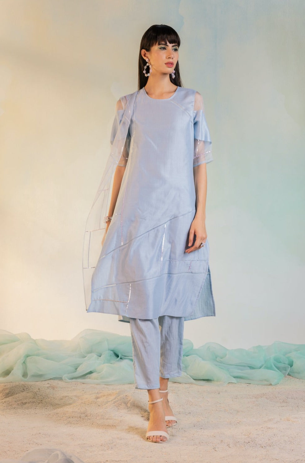 Straight panelled kurta with inlay of organza and sequin embroidery on front panel, paired with straight pants and sequin embroidered narrow organza dupatta.