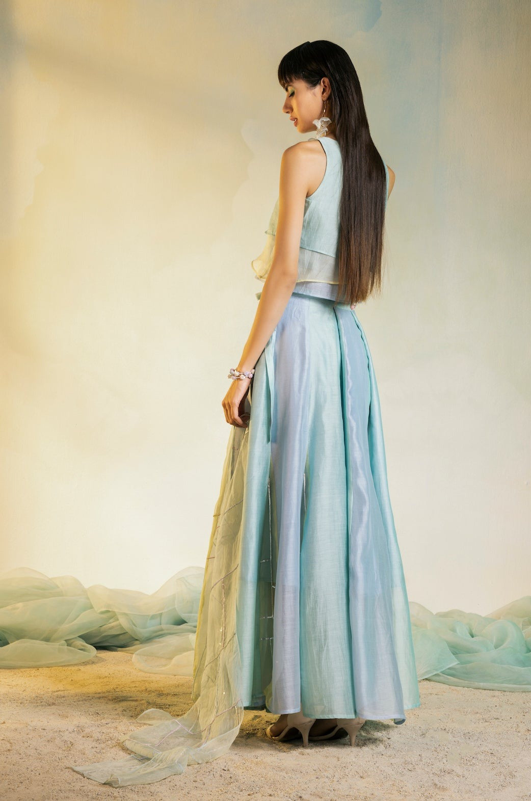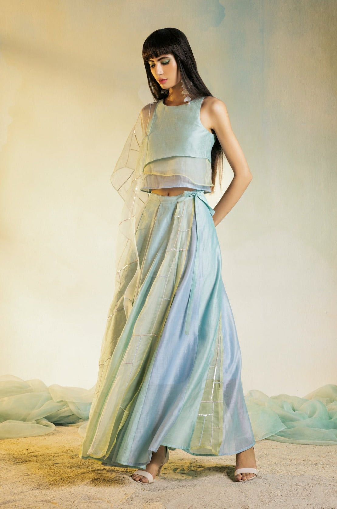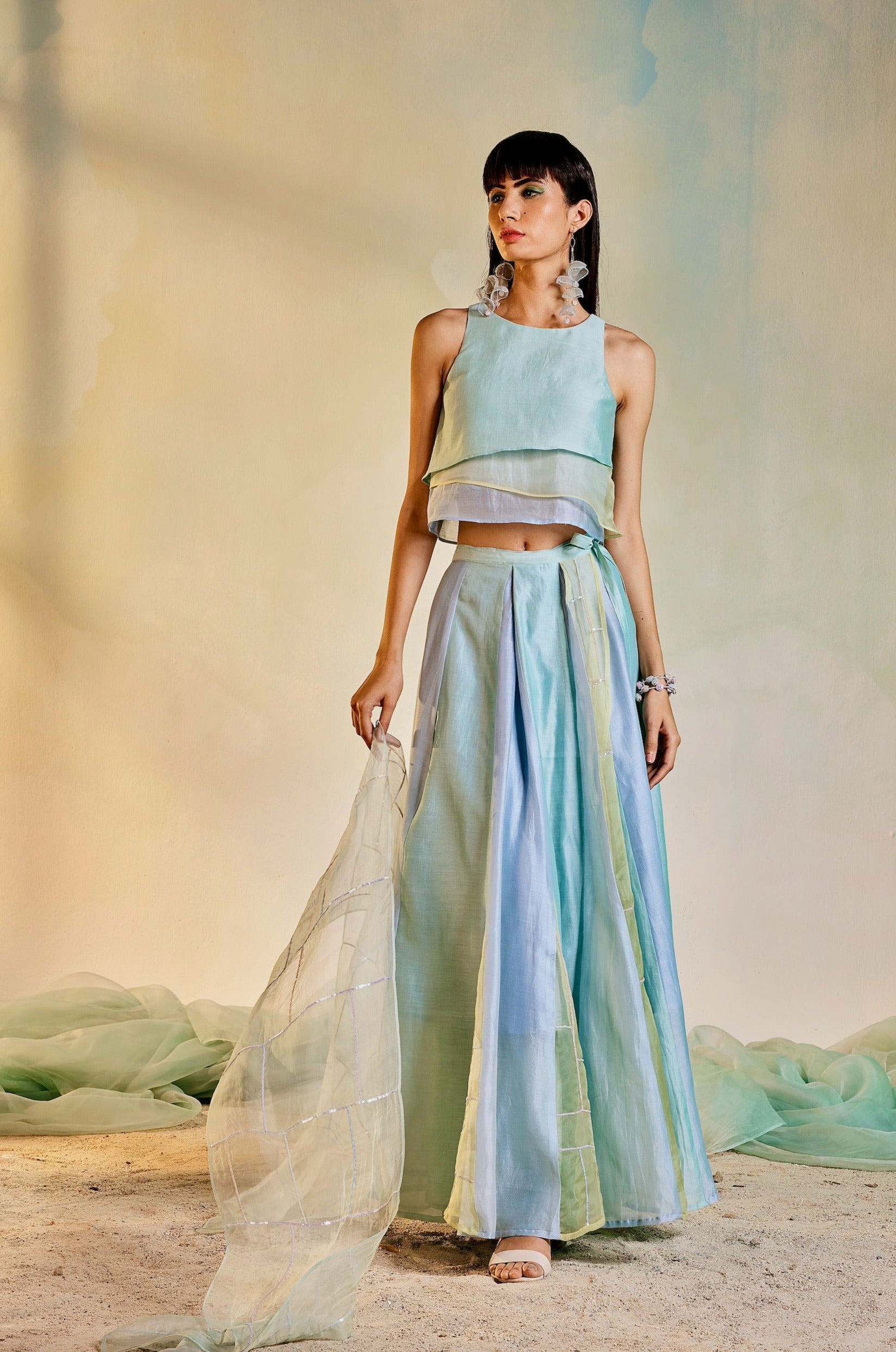 Multicolor layered pastel blouse paired with multicolor pastel wrap around lehenga, highlighted with sequin work and organza inlays. This pastel lehenga set comes with an organza dupatta with sequin hand embroidery.