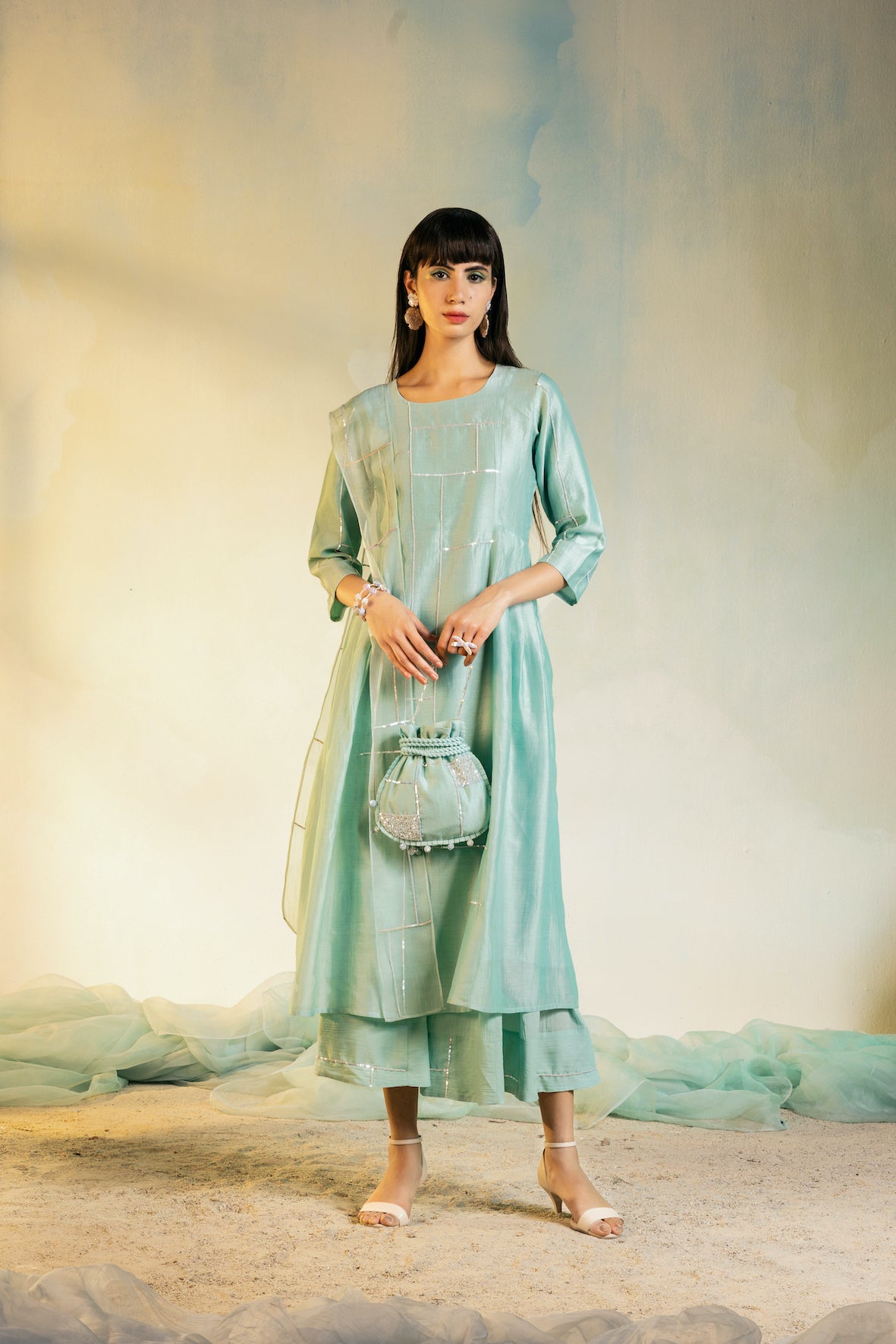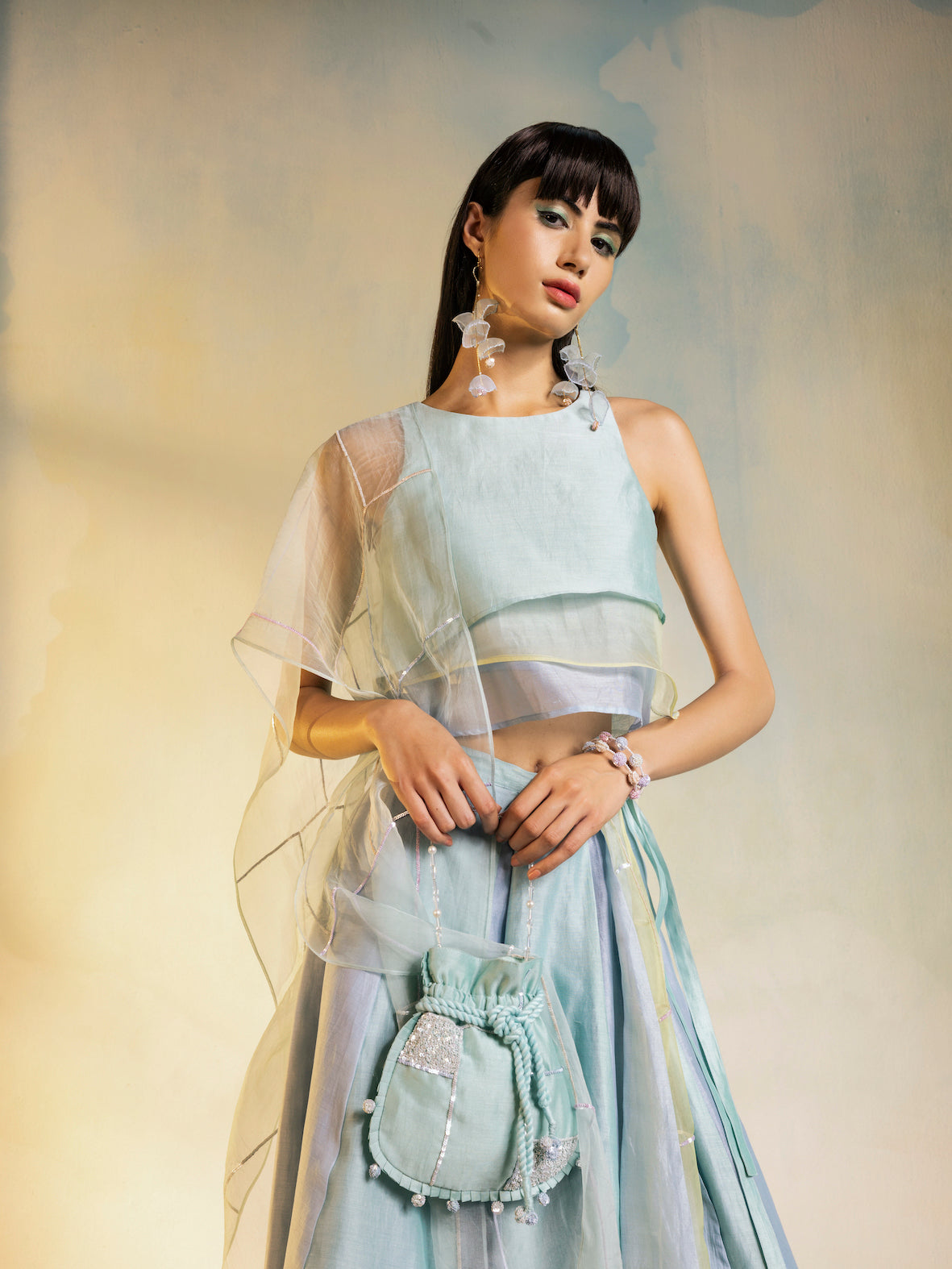 Unique hand embroidered potli with sequin work. Comes with a delicate glass beads string and sequin ball tassels. Carry it as per your mood and occasion with ease to complement our Aasma outfits.
