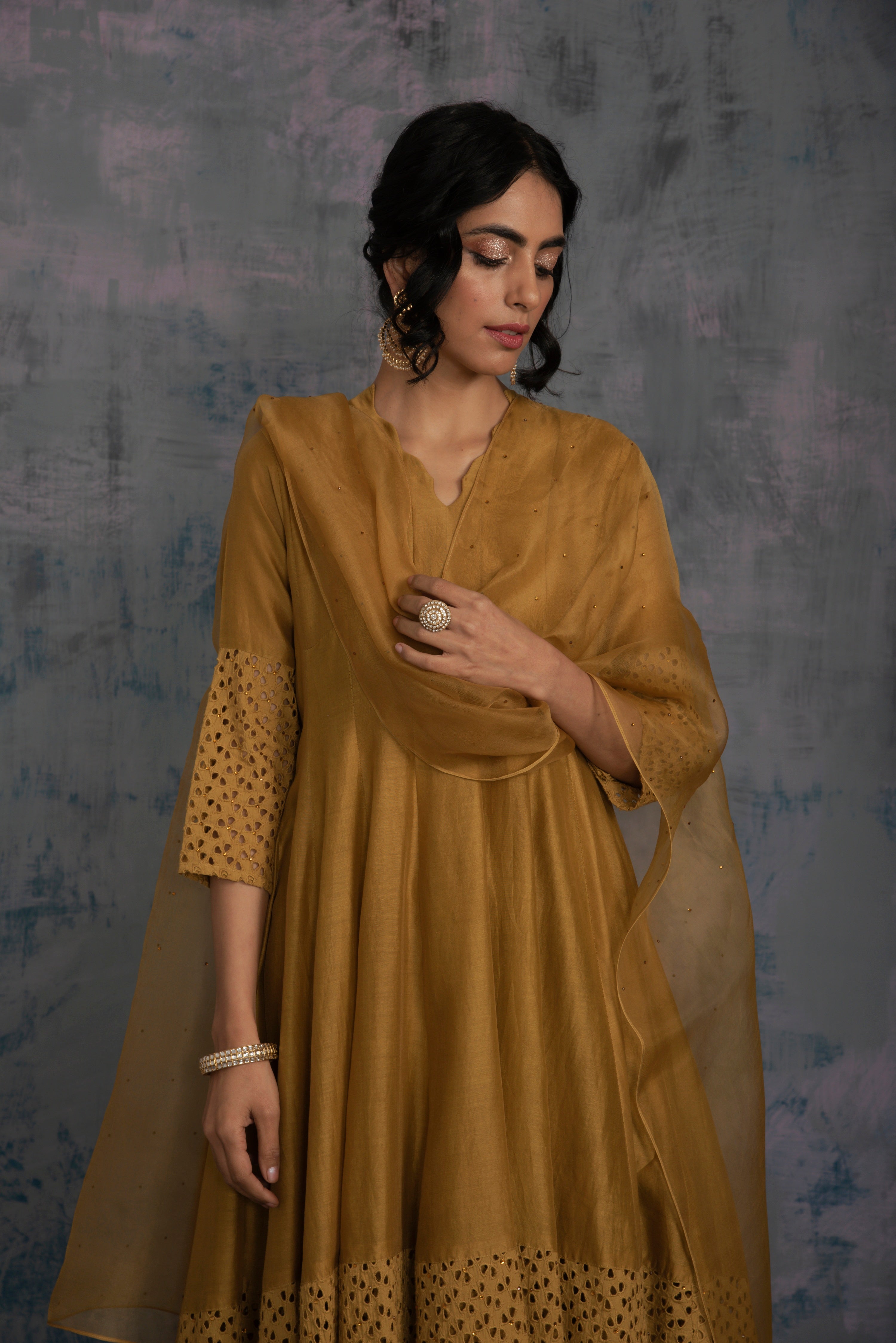 Chanderi golden kurta with jagged neckline and cutwork on sleeve & hem studded with swarovski. This kalidar kurta is paired with straight cutwork pants studded with swarovski and organza dupatta embellished with swarovski.