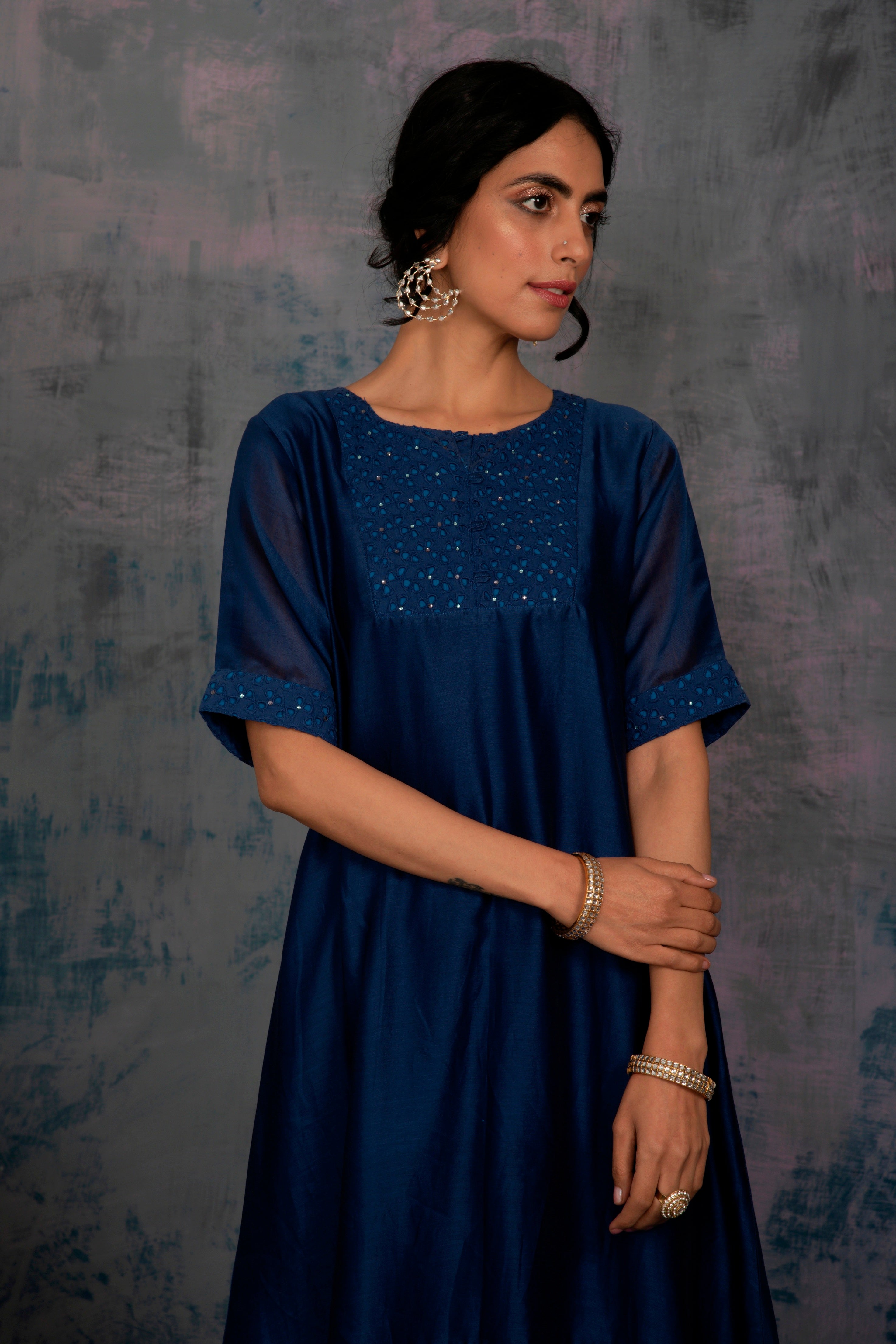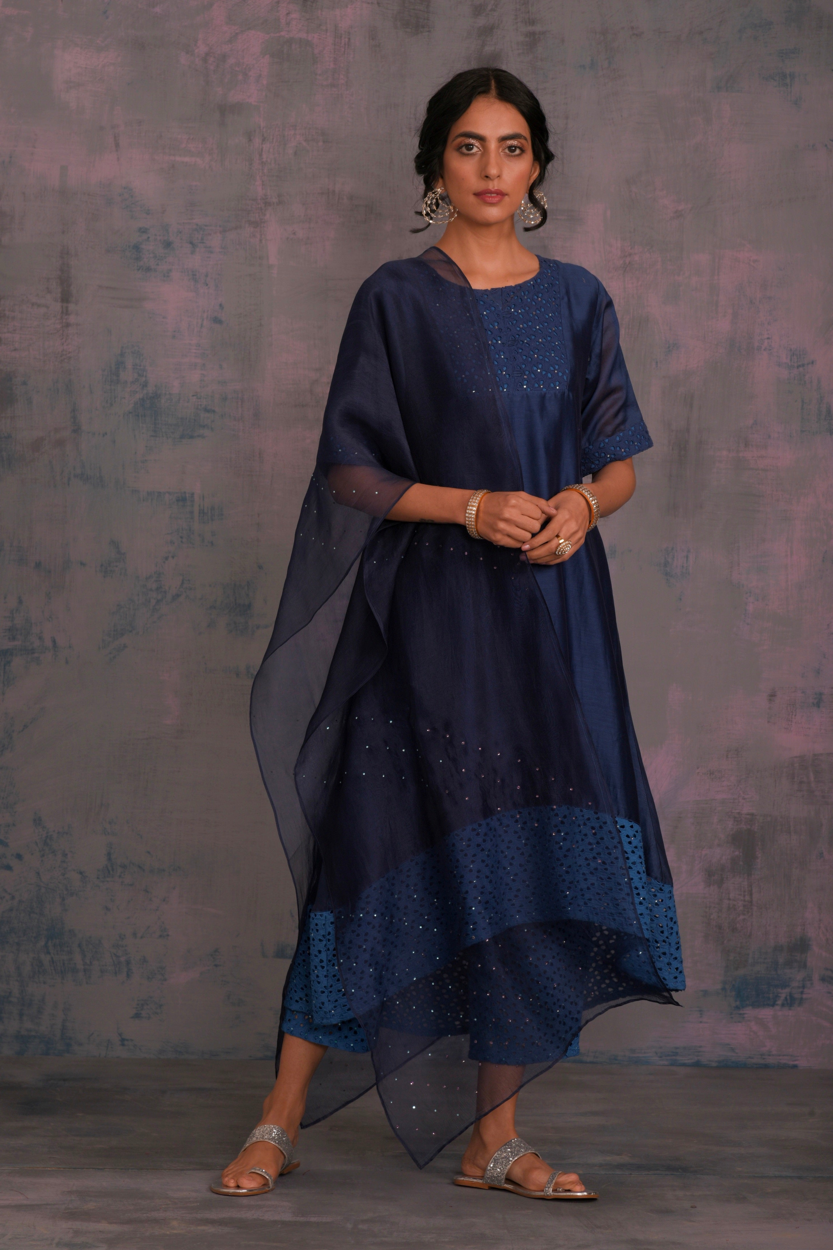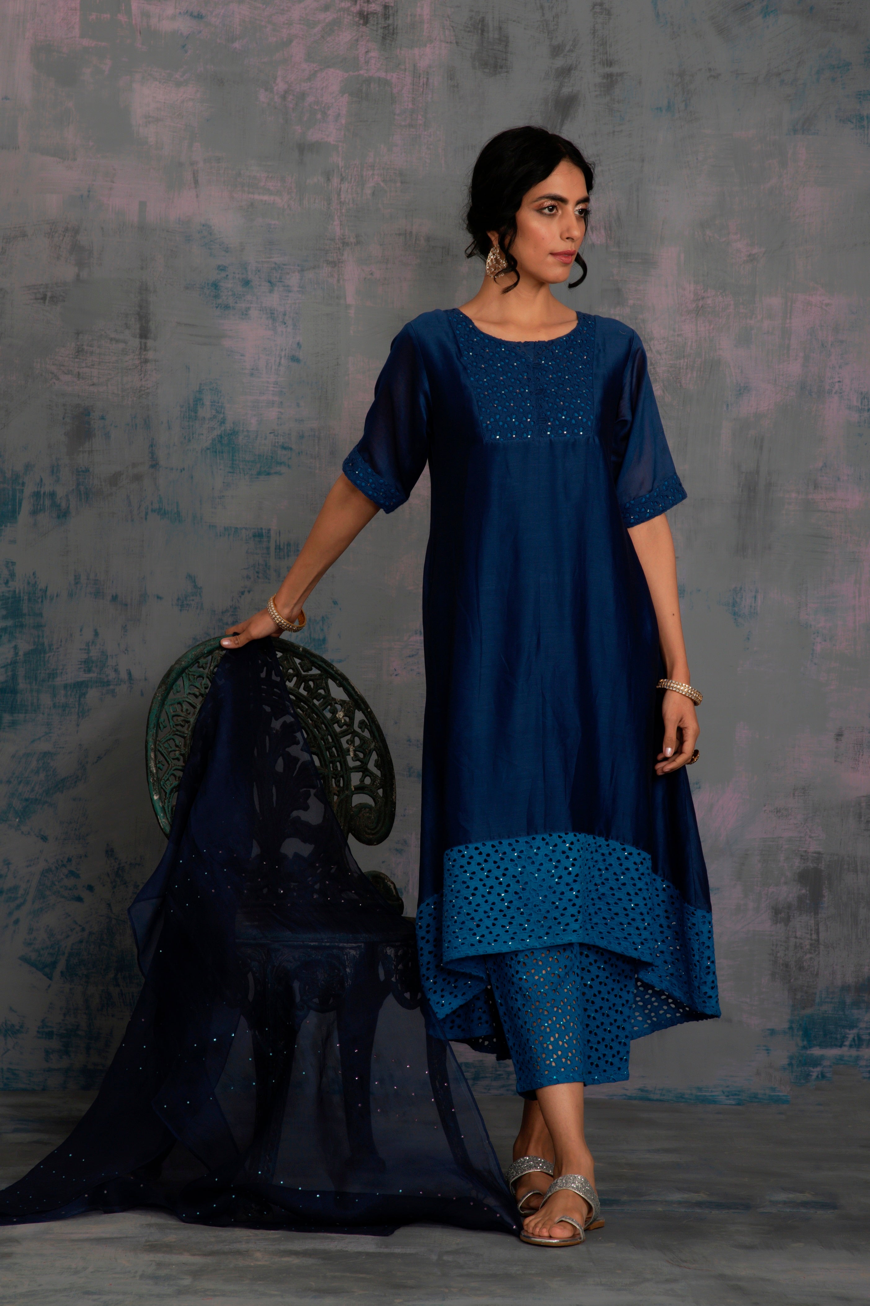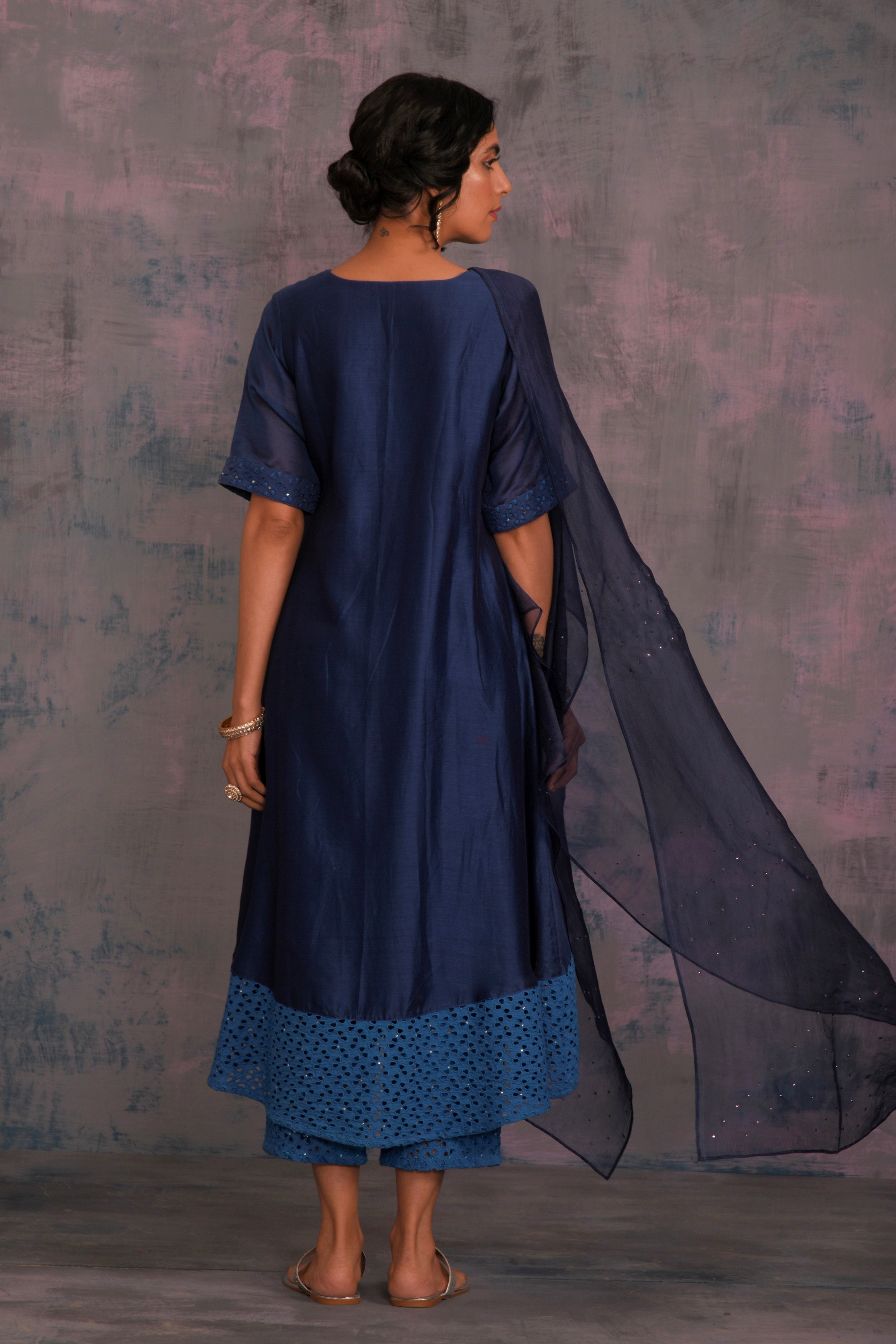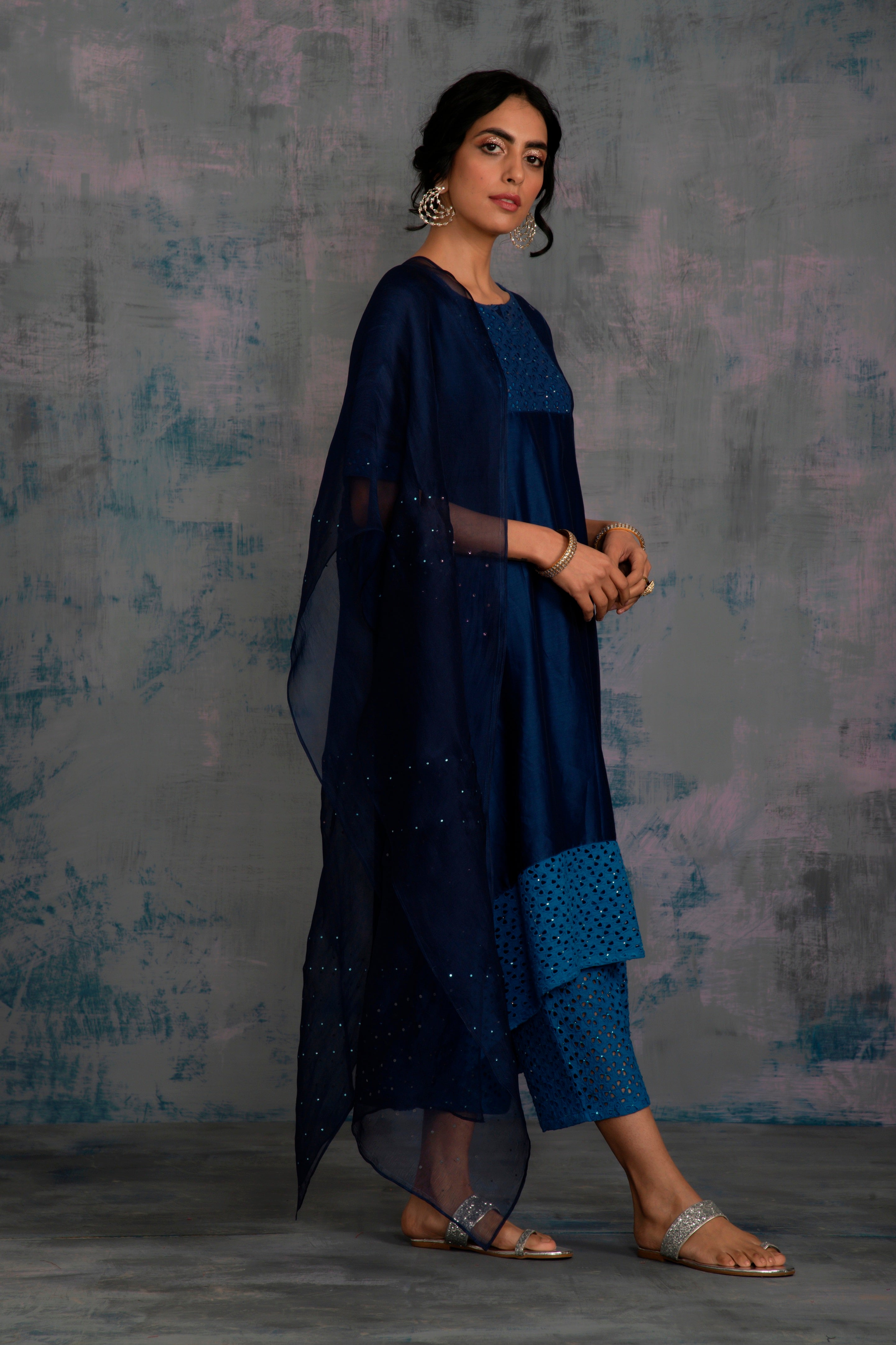 Chanderi midnight blue kurta with cutwork on yoke, sleeve & hem studded with swarovski. A contrast colour at the bottom hem. This high low kurta is paired with a straight cutwork contrast pant studded with swarovski and organza dupatta embellished with swarovski.