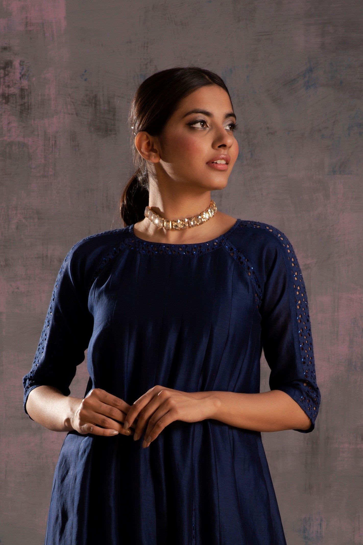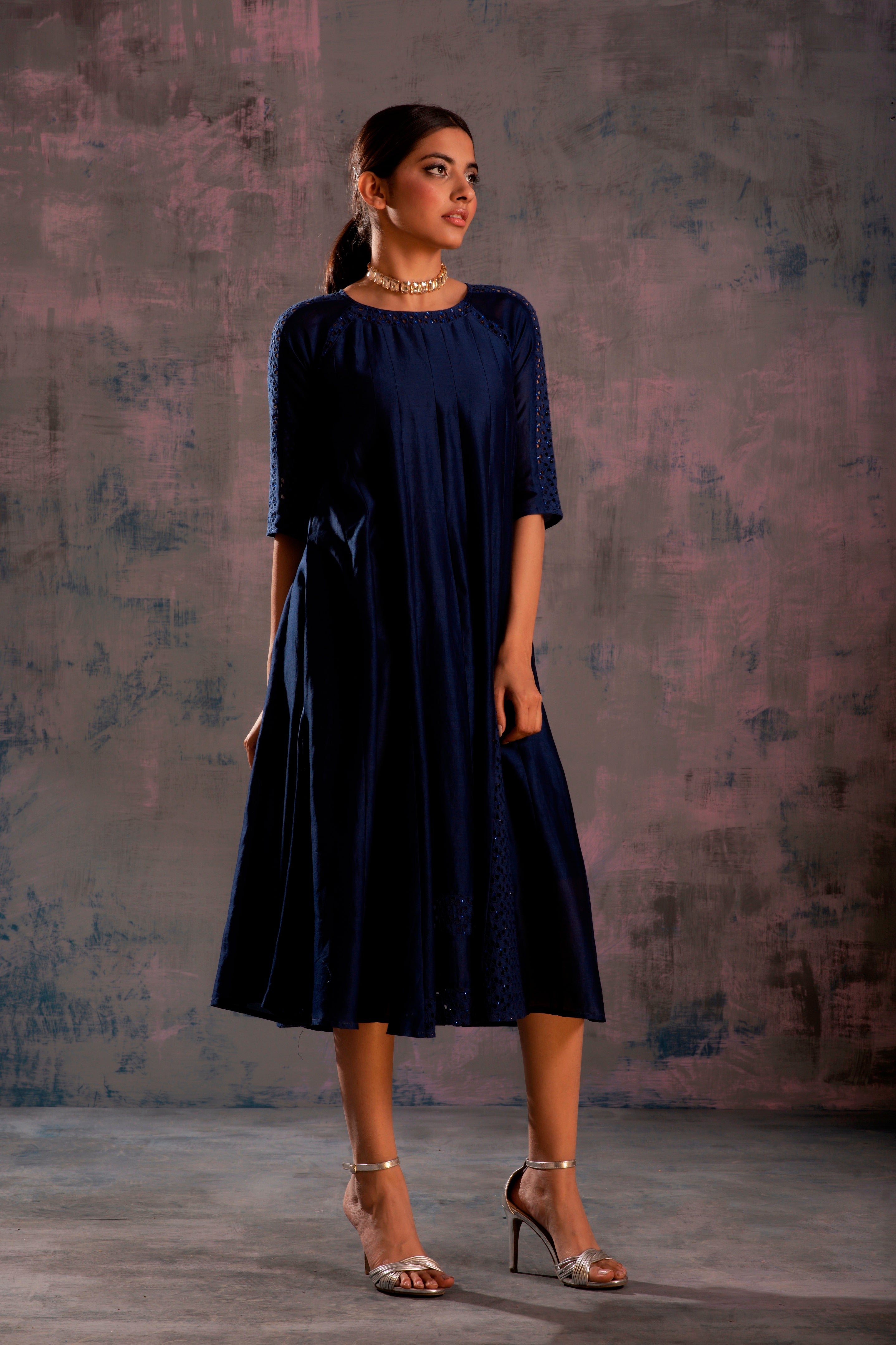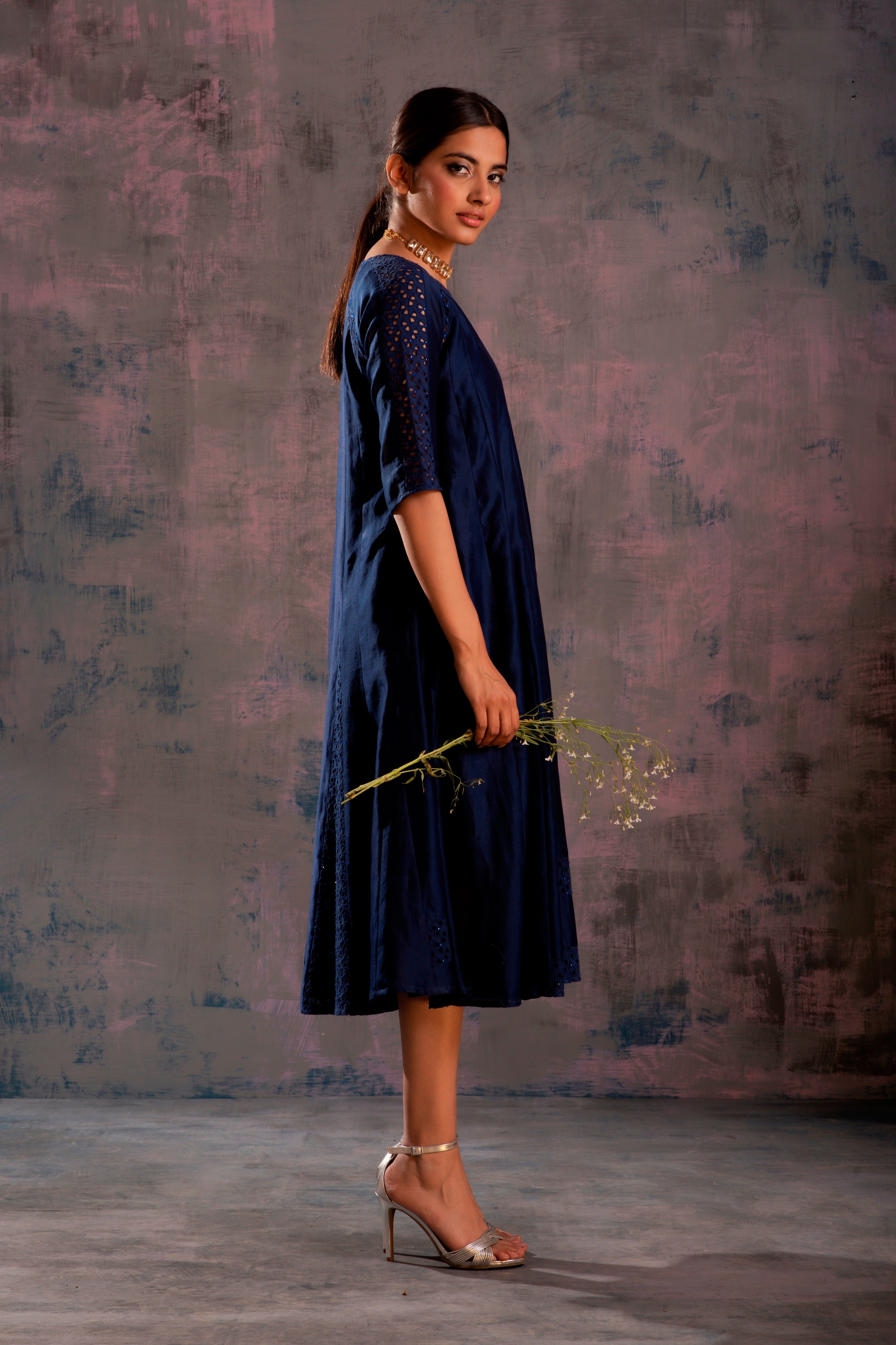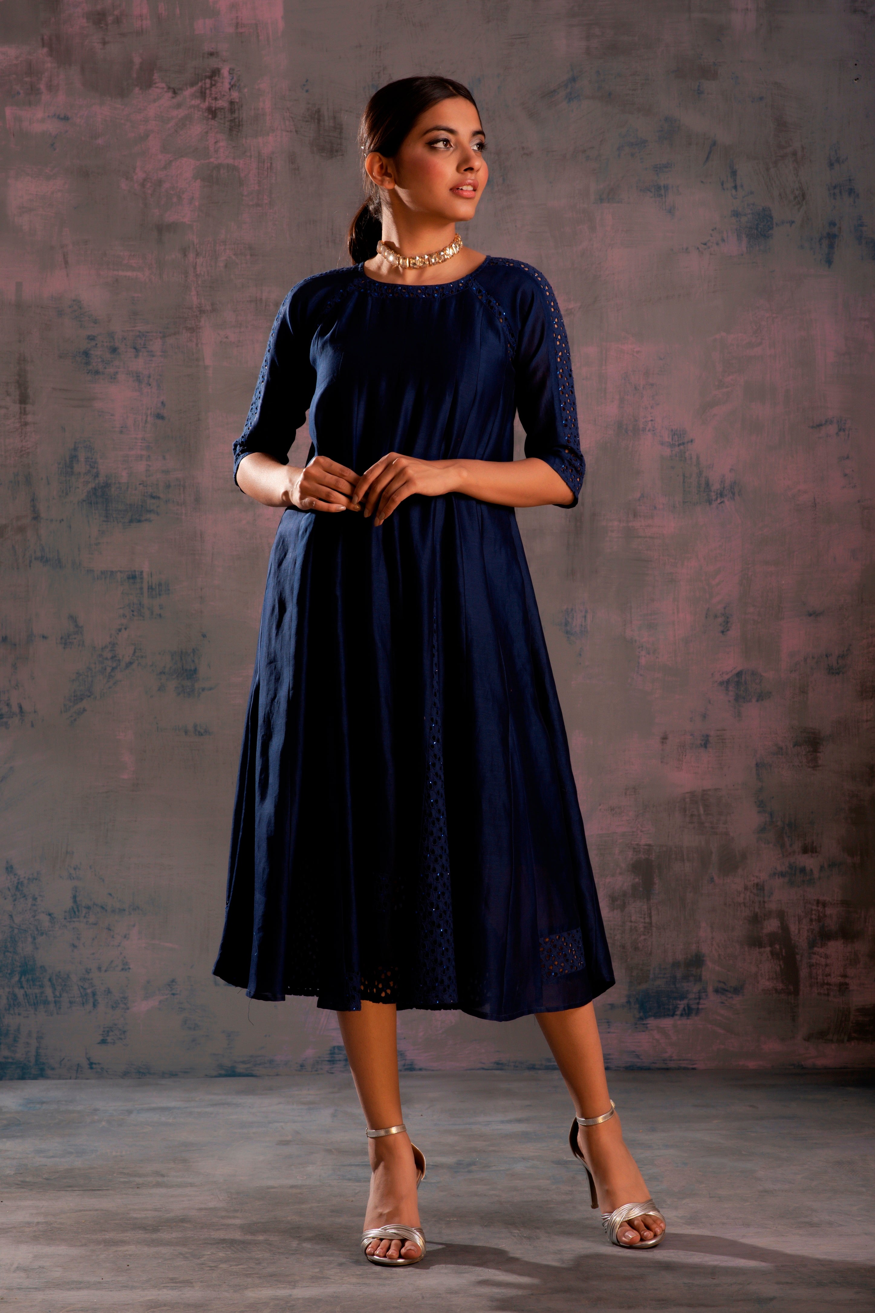Chanderi mid length dress with interplay of cutwork on neck, shoulder & panel highlighted with swarovski.