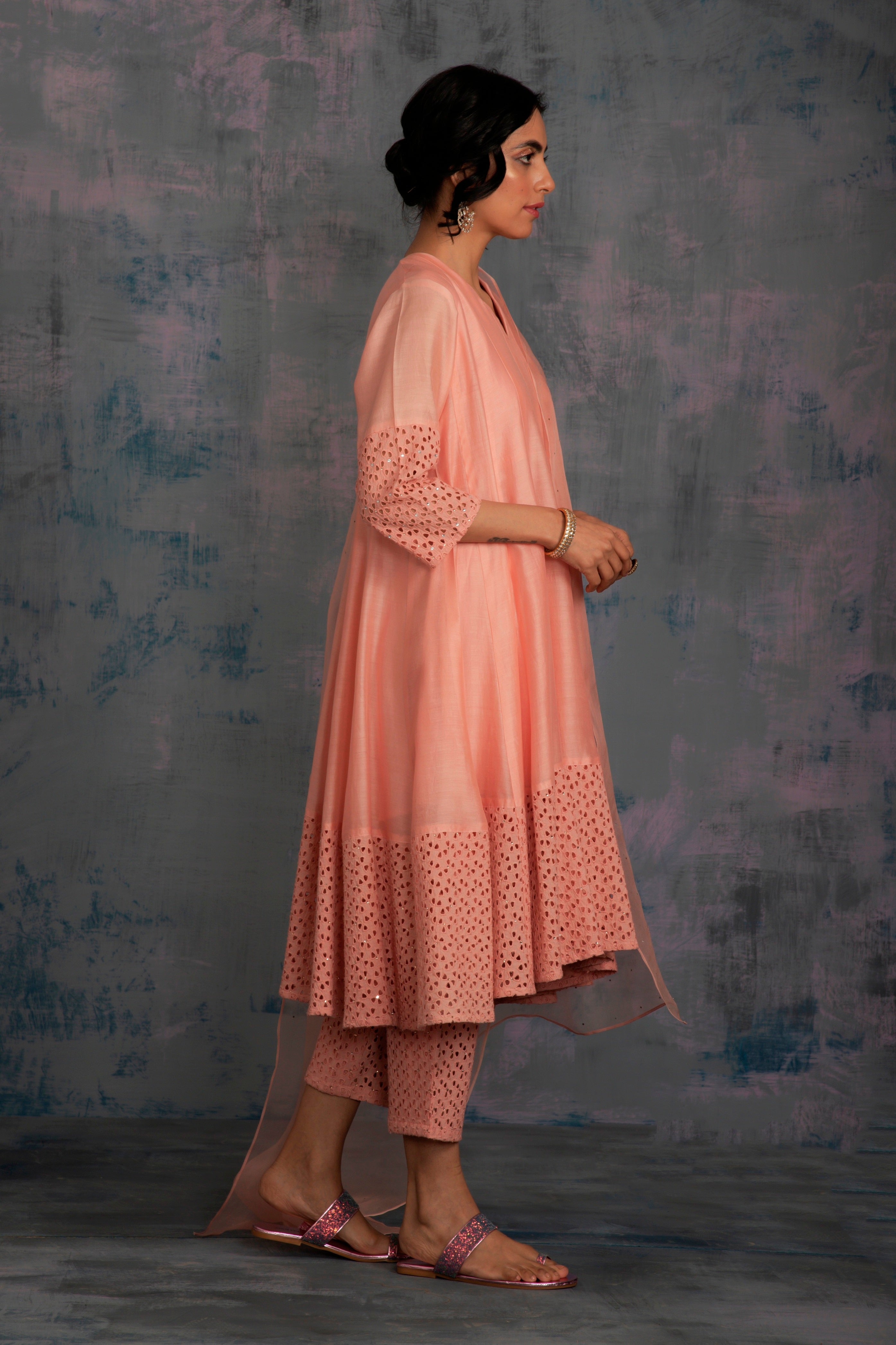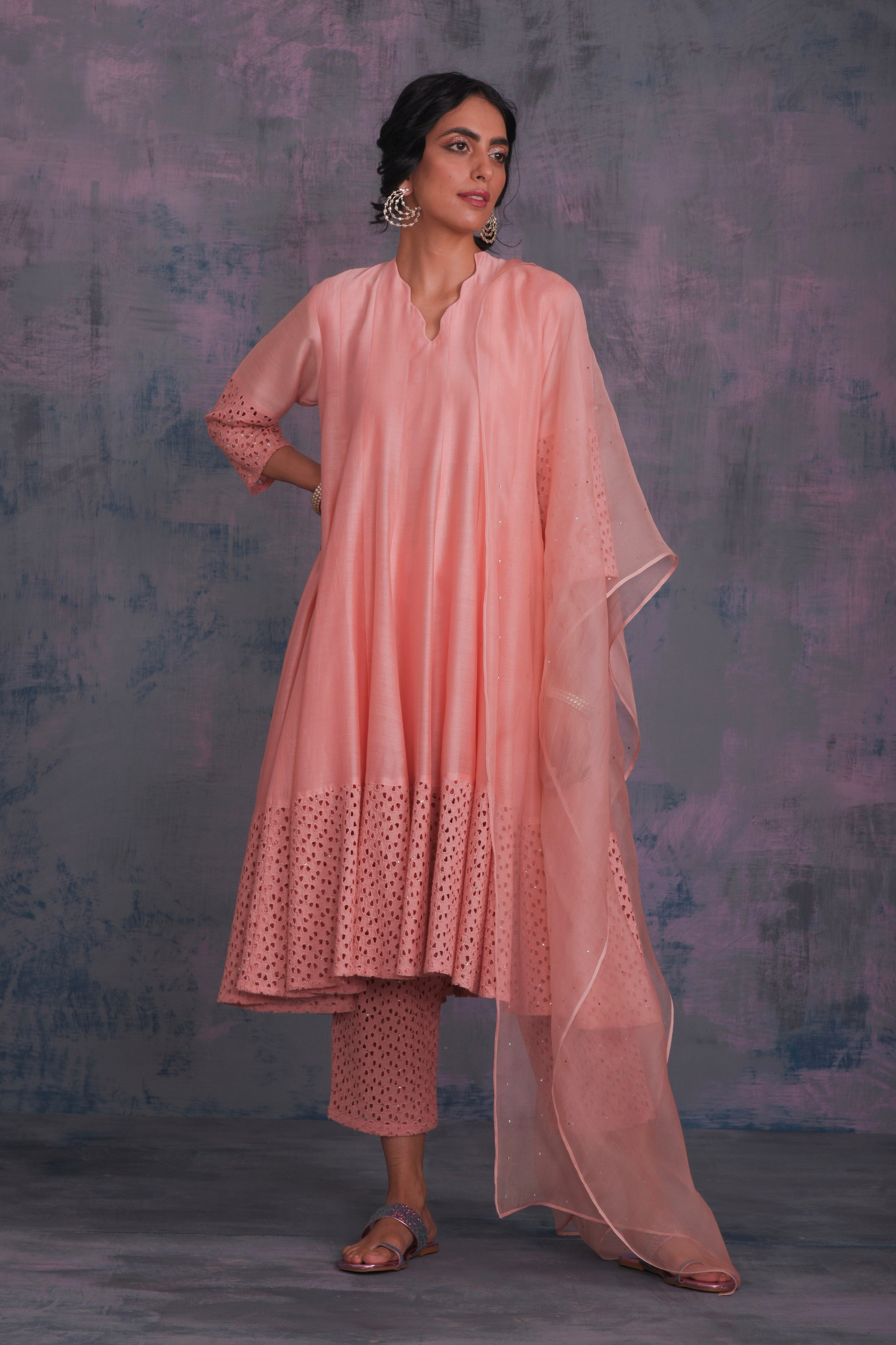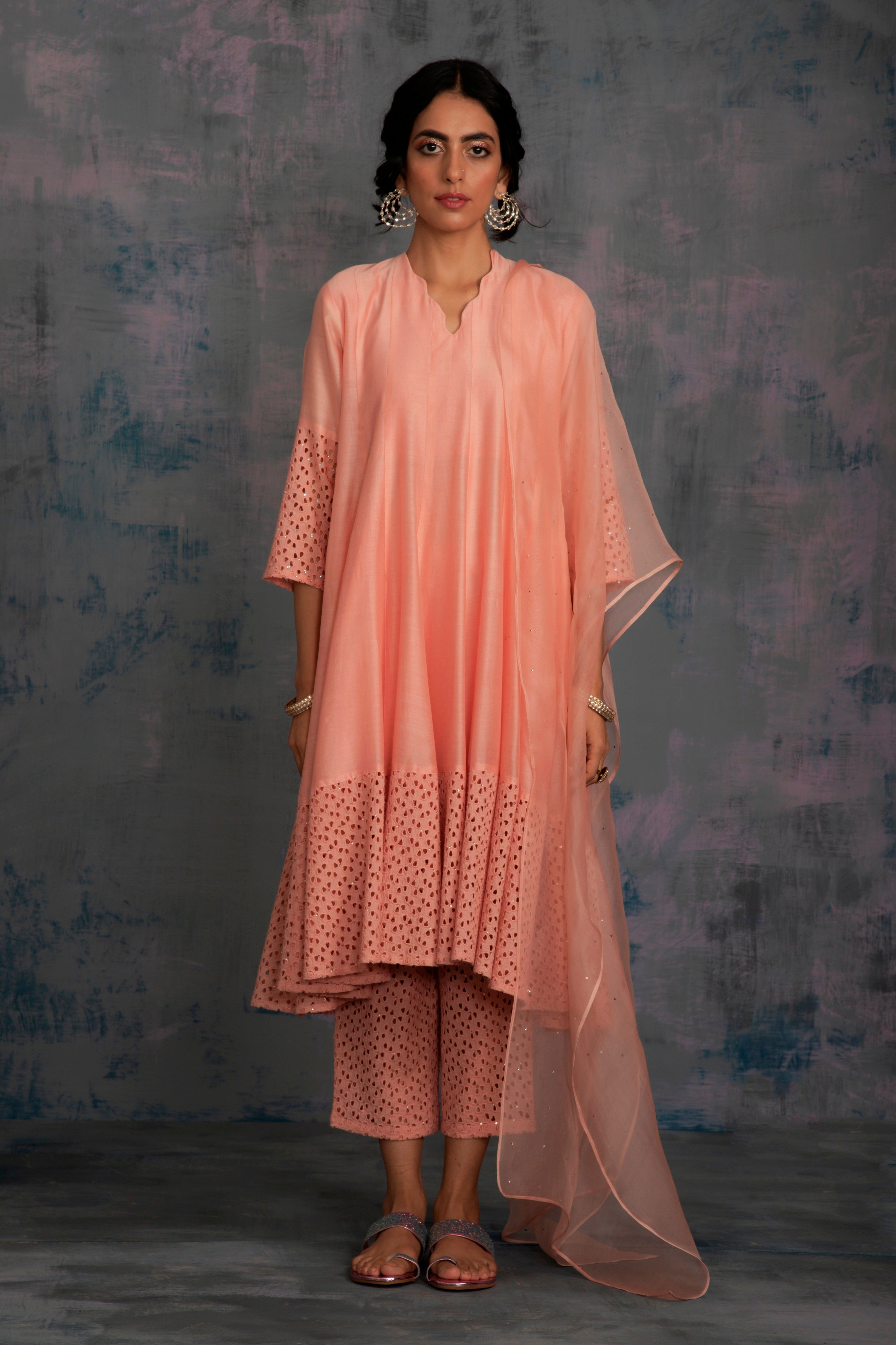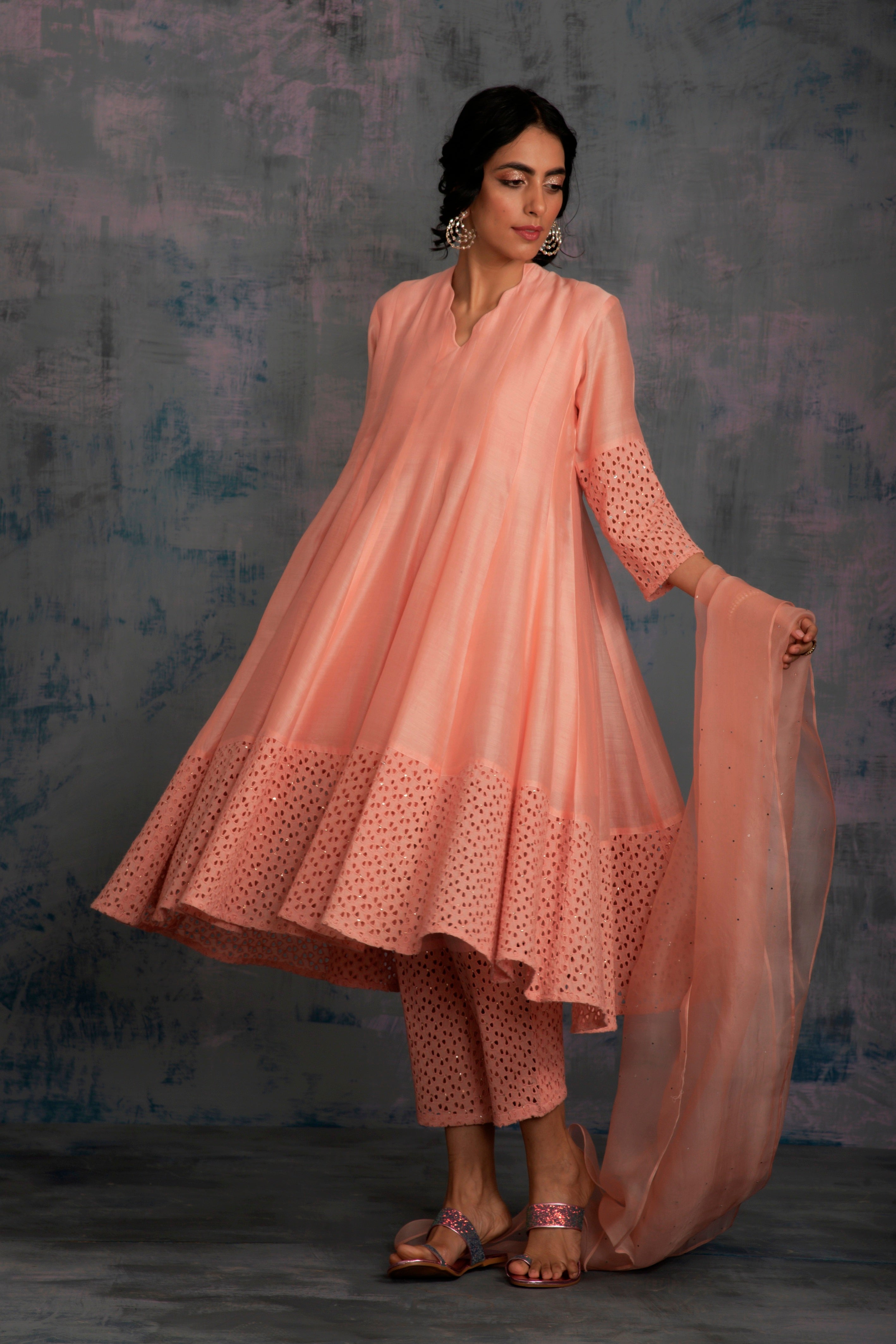 Chanderi peach kurta with jagged neckline and cutwork on sleeve & hem studded with swarovski. This kalidar kurta is paired with straight cutwork pants studded with swarovski and organza dupatta embellished with swarovski.