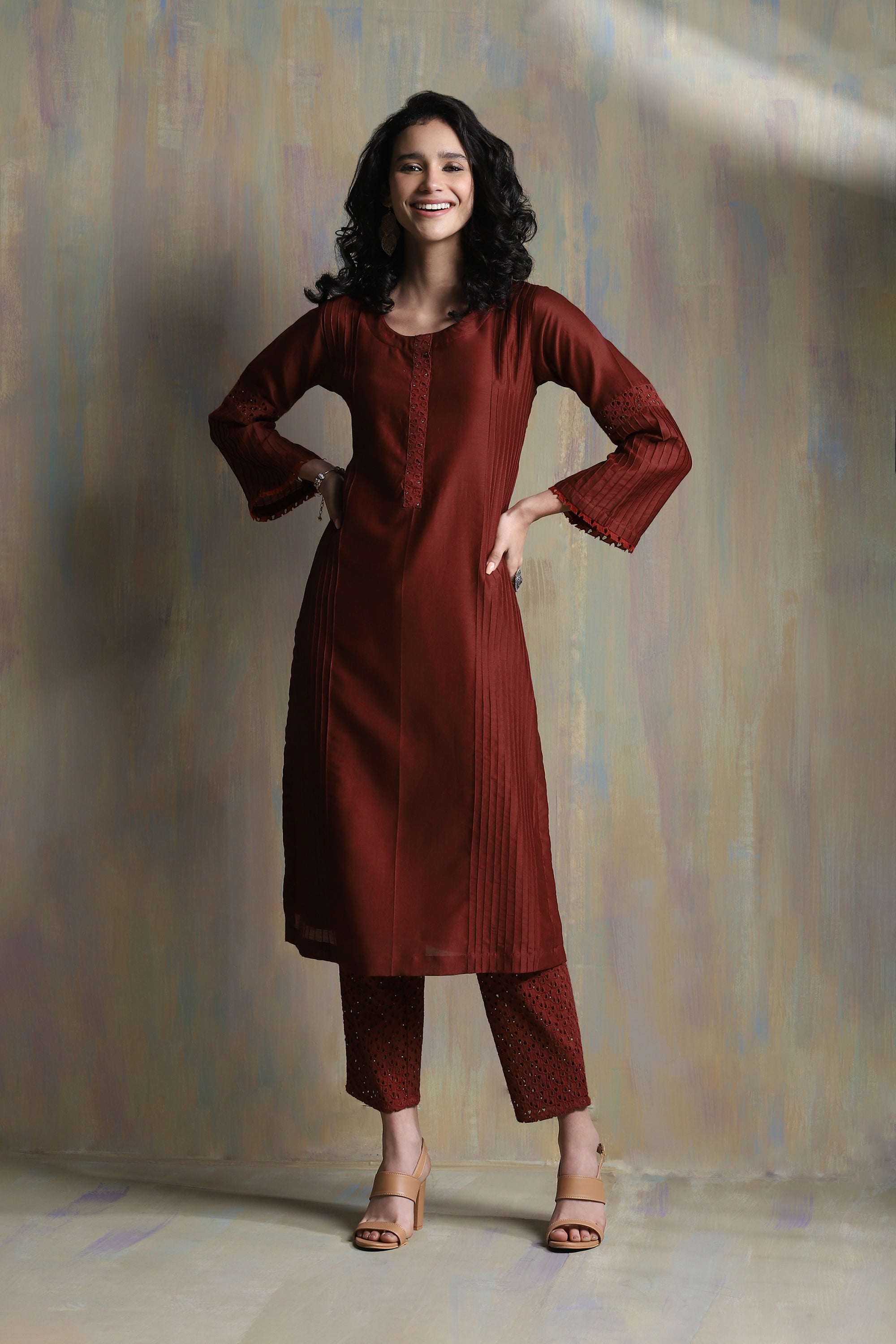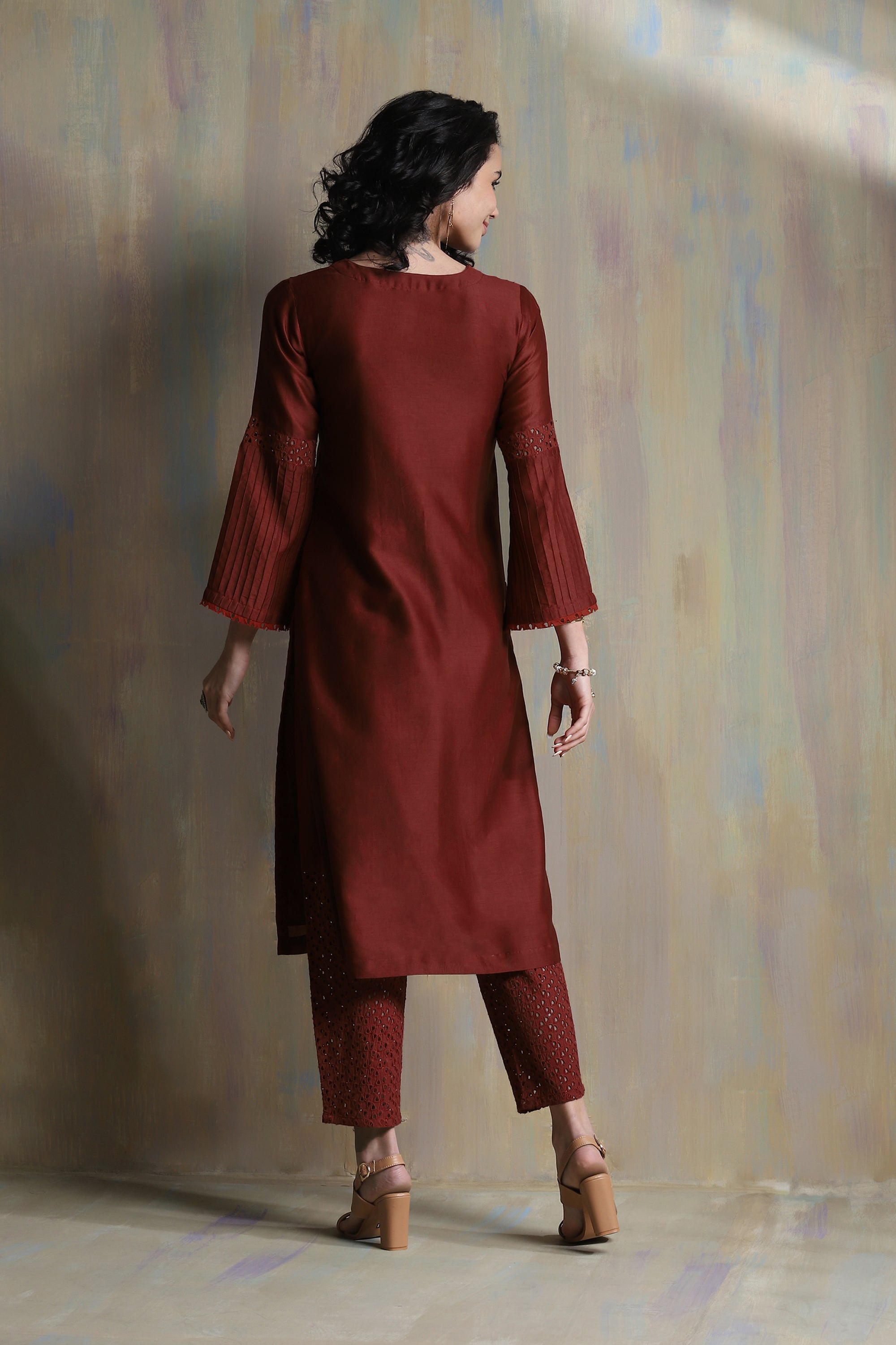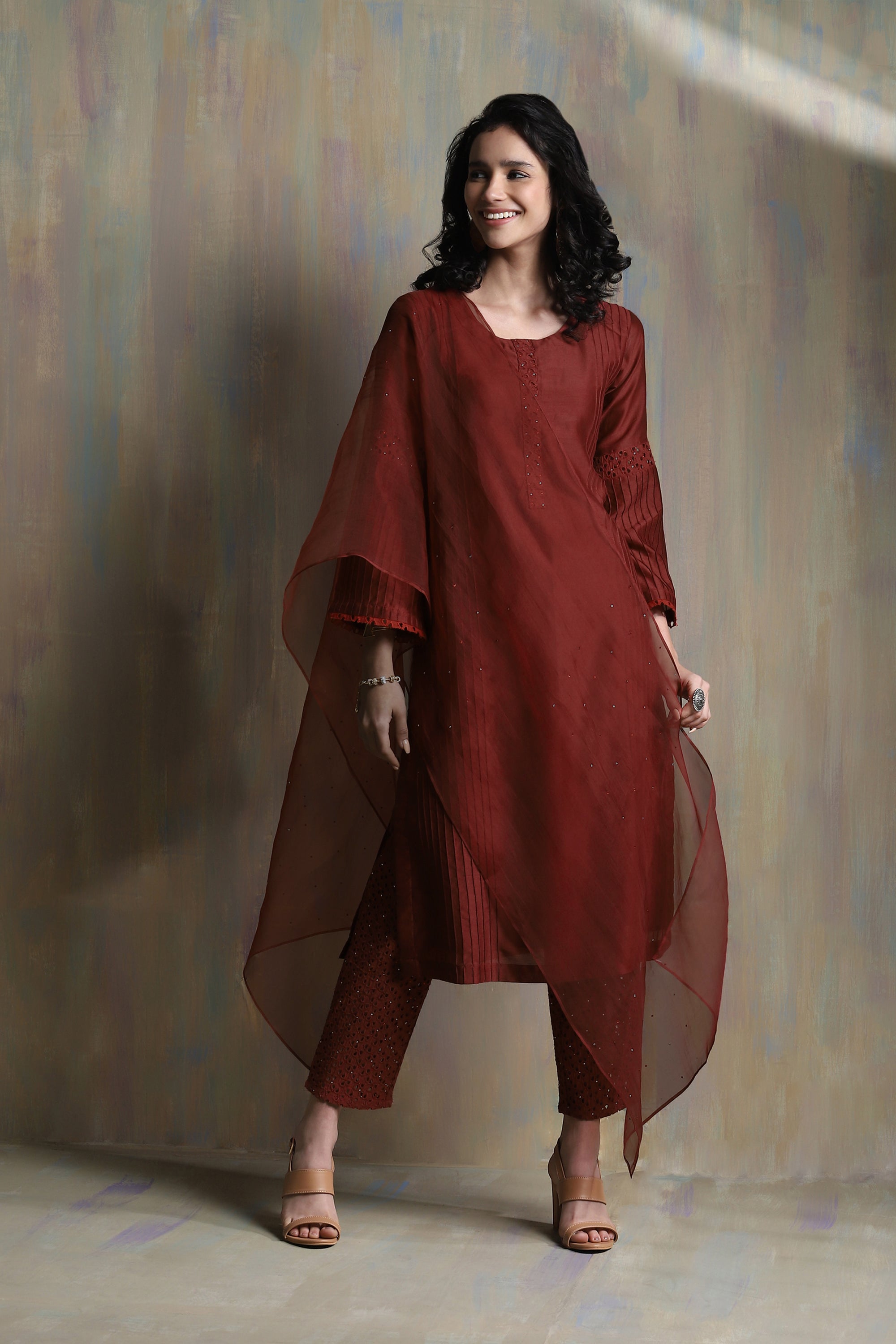 Chanderi flared sleeves kurta with pintuck detailing on side panels, back & sleeves with a hint of cutwork embellished with swarovski on placket & sleeves. This kurta set is paired with straight cutwork pants studded with swarovski. Organza dupatta is embellished with swarovski.