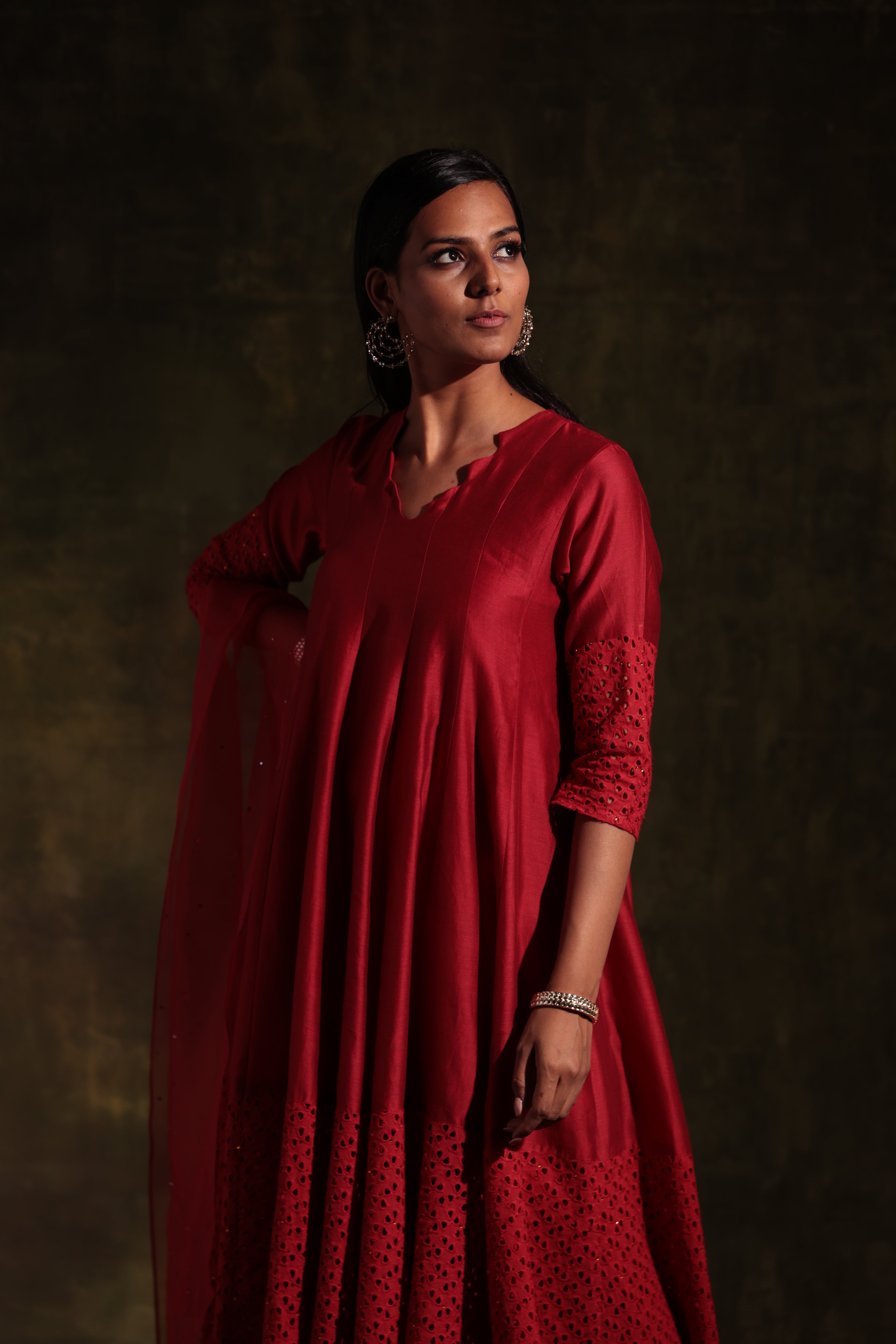 Chanderi red kurta with jagged neckline and cutwork on sleeve & hem studded with swarovski. This kalidar kurta is paired with straight cutwork pants studded with swarovski and organza dupatta embellished with swarovski.