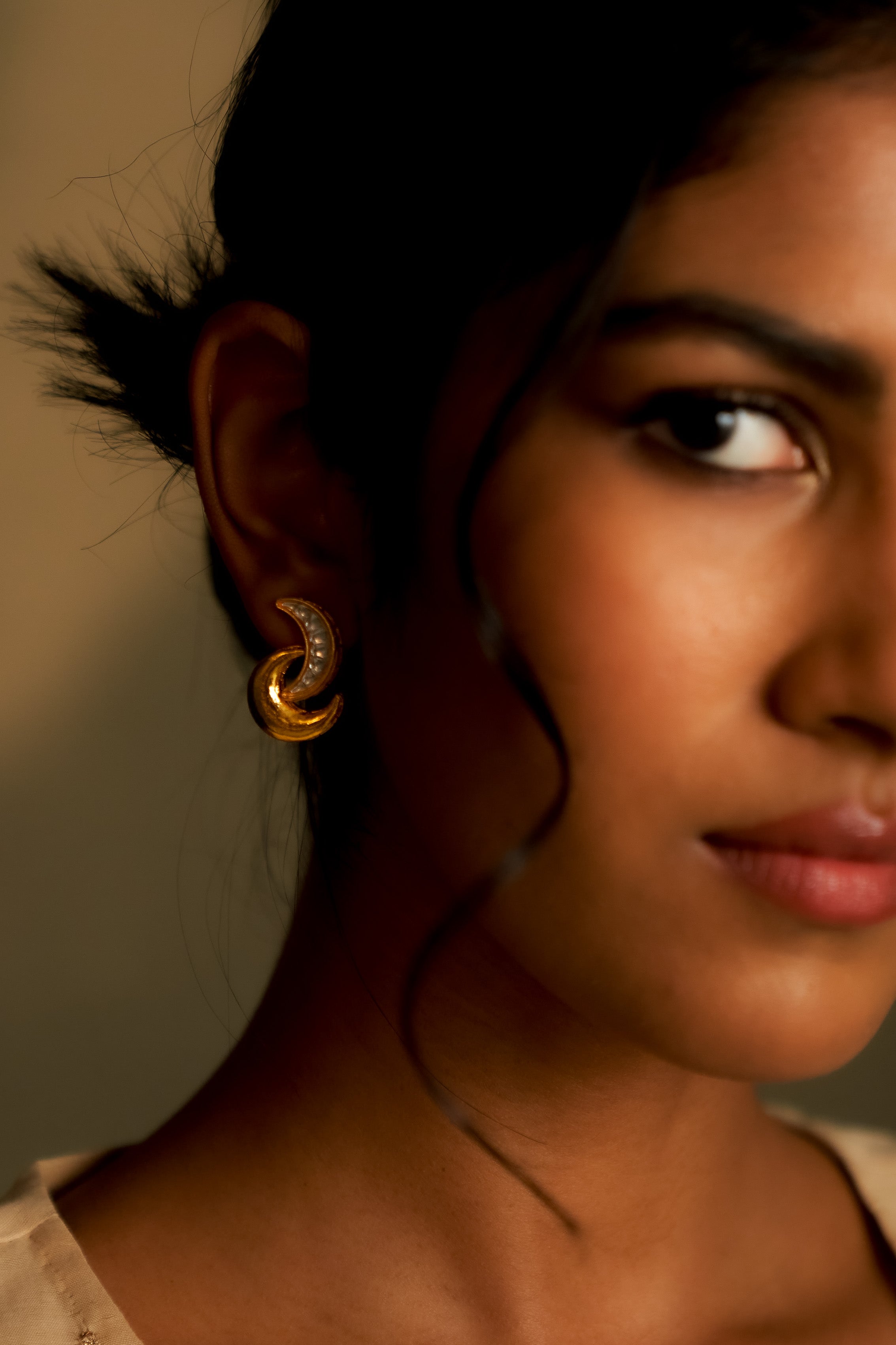 Elegant intertwined crescents in gold and kundan, these earrings blend modern design with timeless artistry. The fluid silhouette sparkles with kundan detailing, making them a graceful choice for festive evenings or elevated everyday wear.