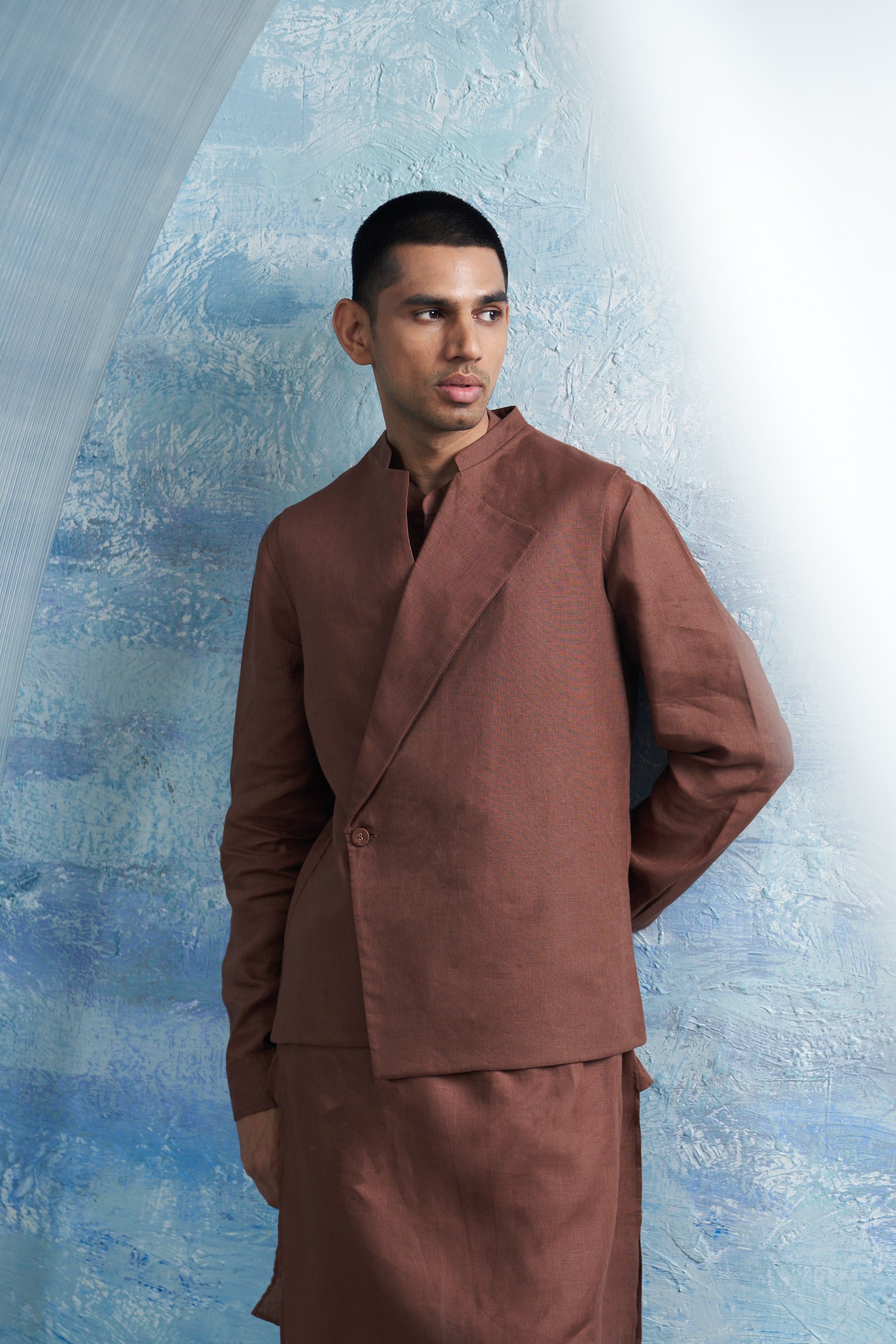 A statement ensemble with a straight kurta & jacket in a stand-out woody brown linen, a distinguished addition to your wardrobe. This exceptional kurta boasts subtle touches of shimmer on the placket and cuffs. It is paired with cotton pants & an overlap jacket for a power pack look.