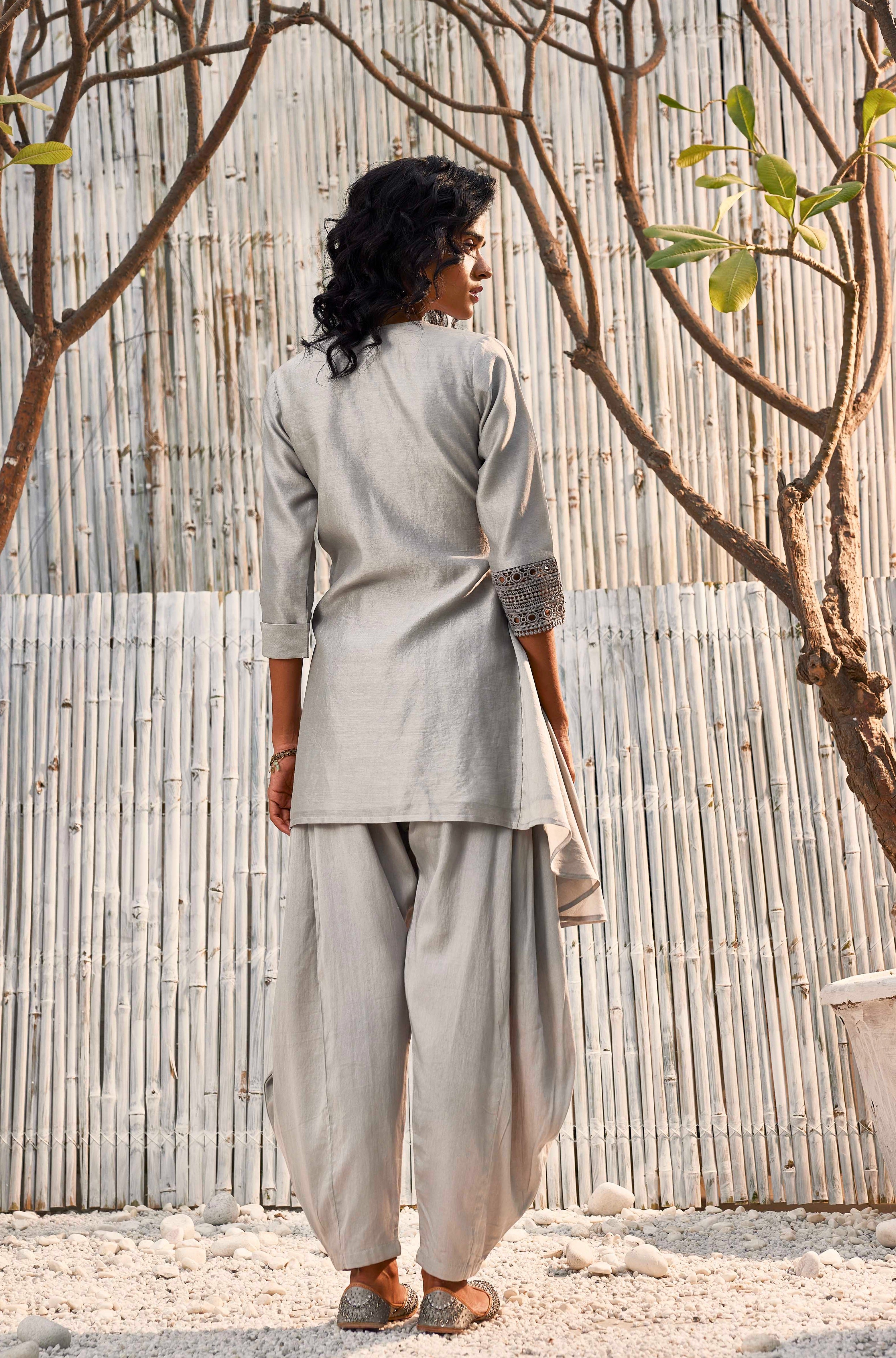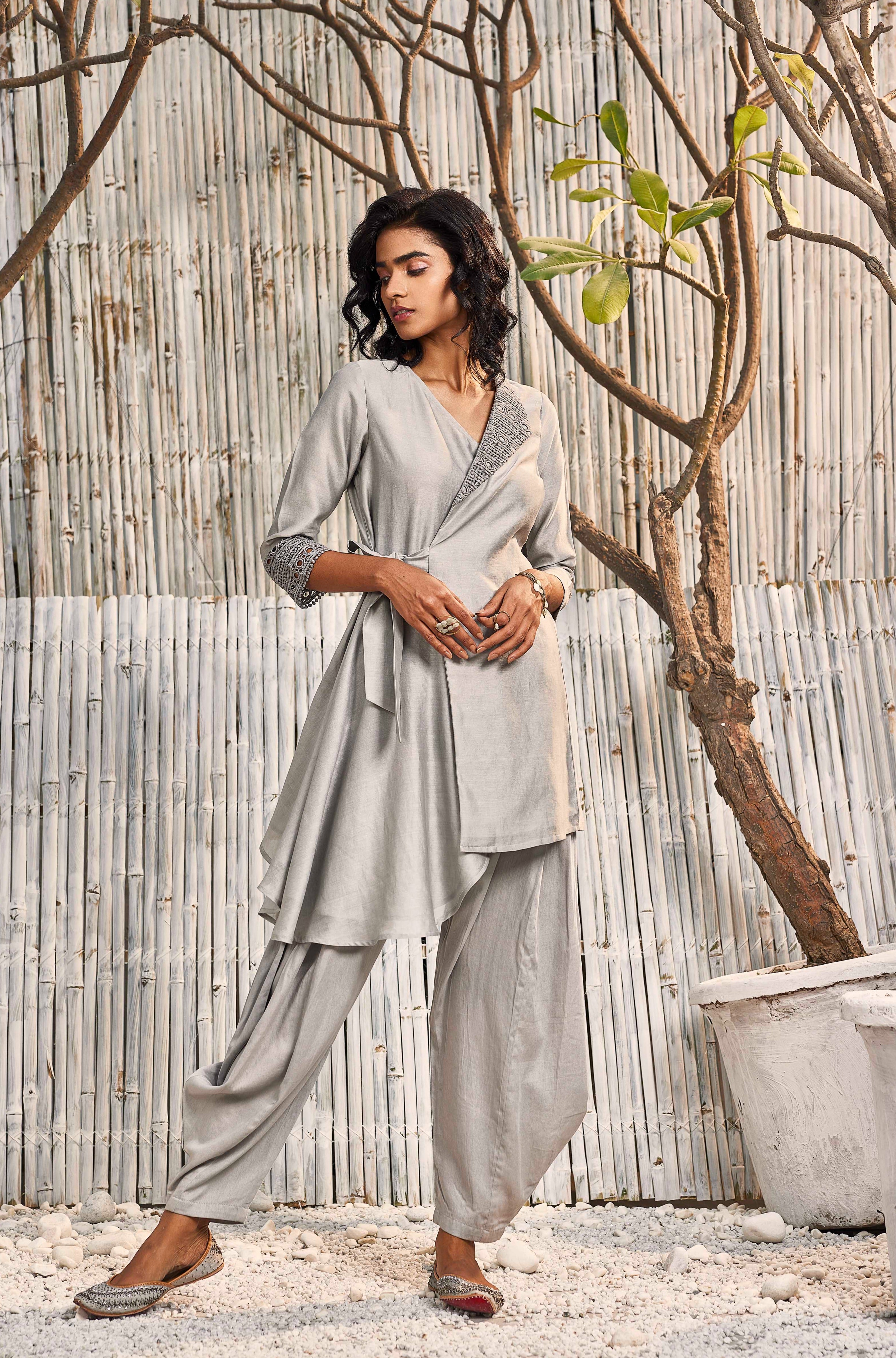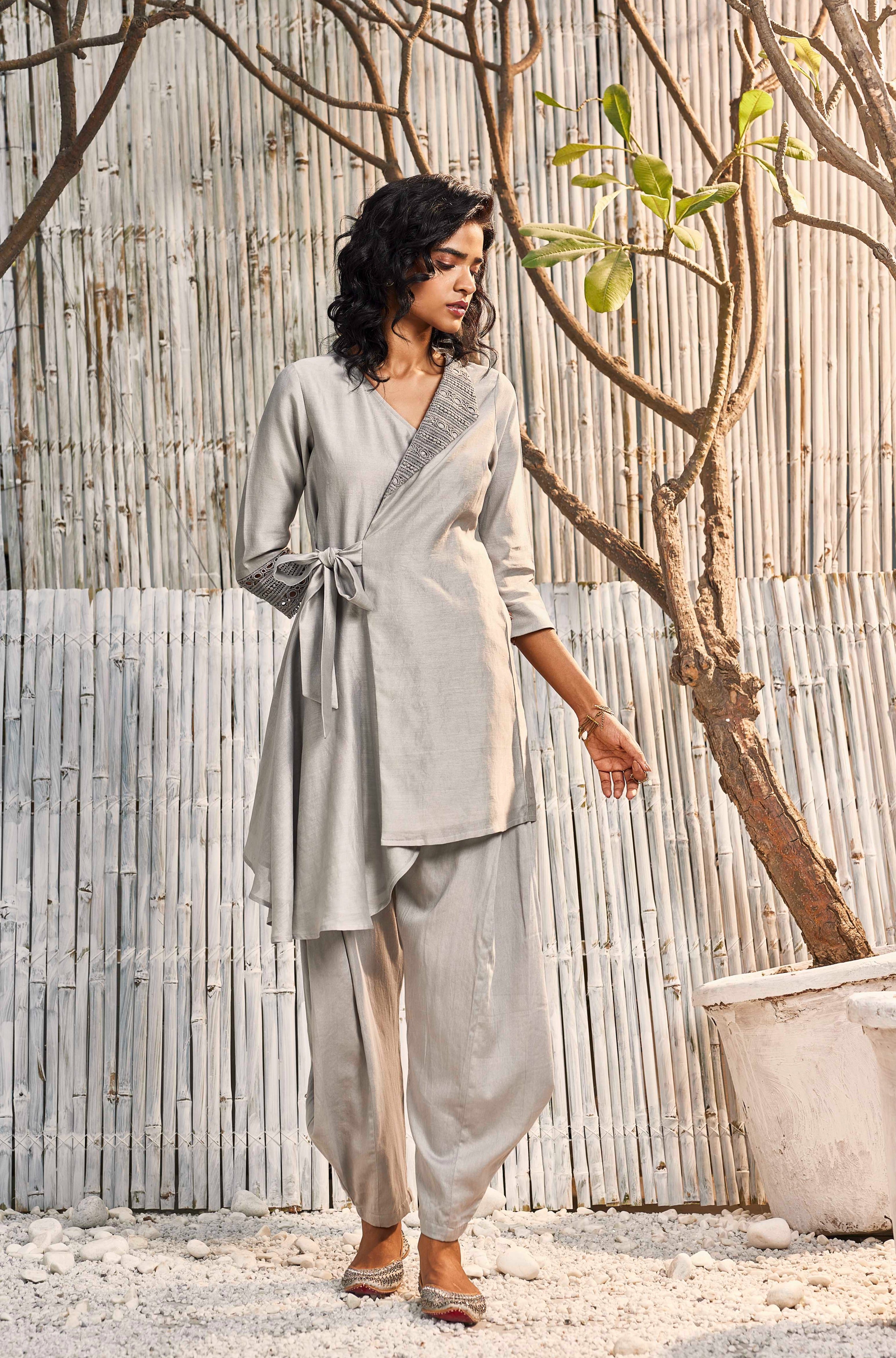 A stylish tie up wrap jacket crafted in pure chanderi fabric with intricate lace detailing on one lapel and sleeve is sure to lift up your mood everytime you wear it. Paired with edgy pleated bottoms that take the outfit to a whole new level.
